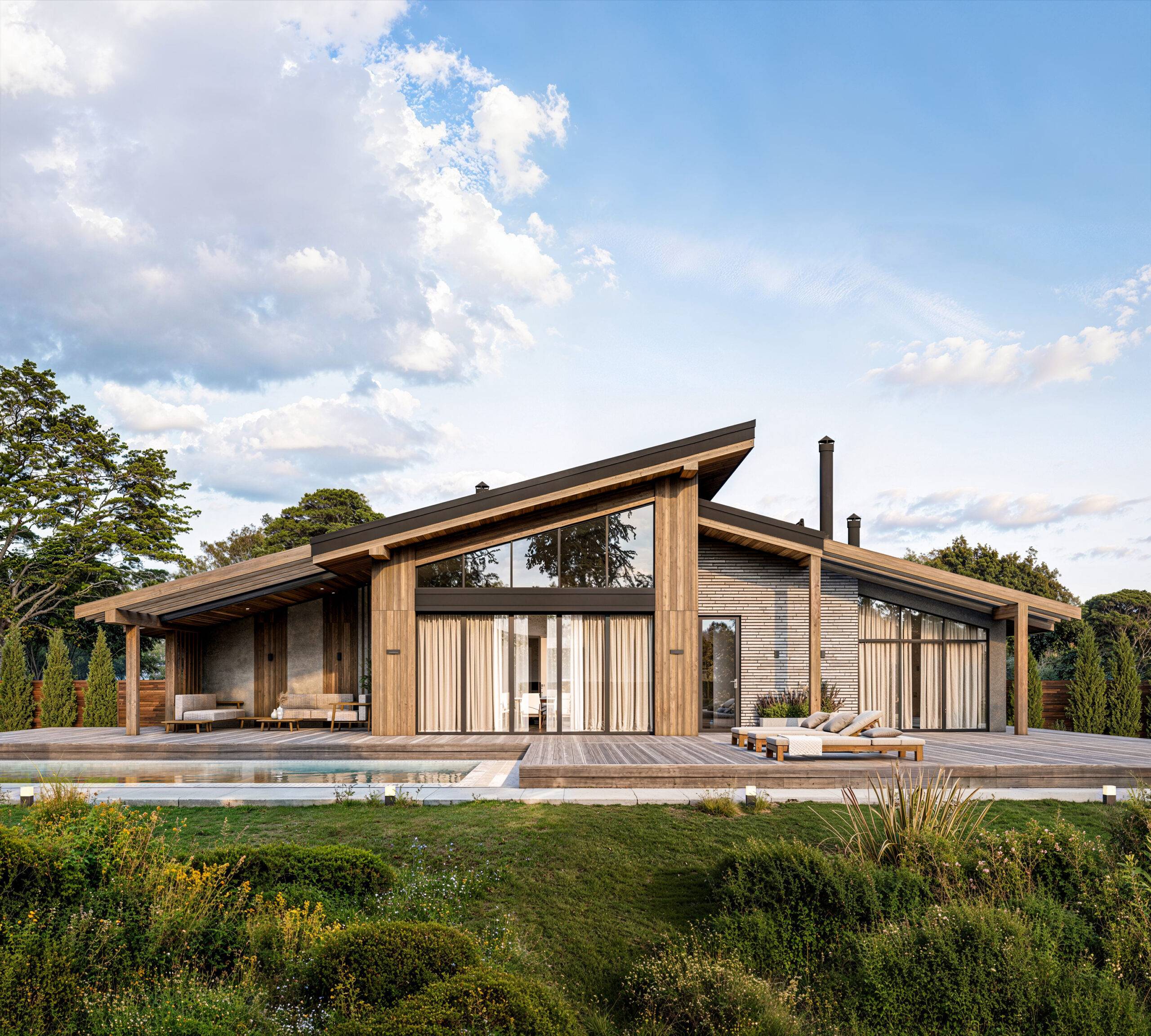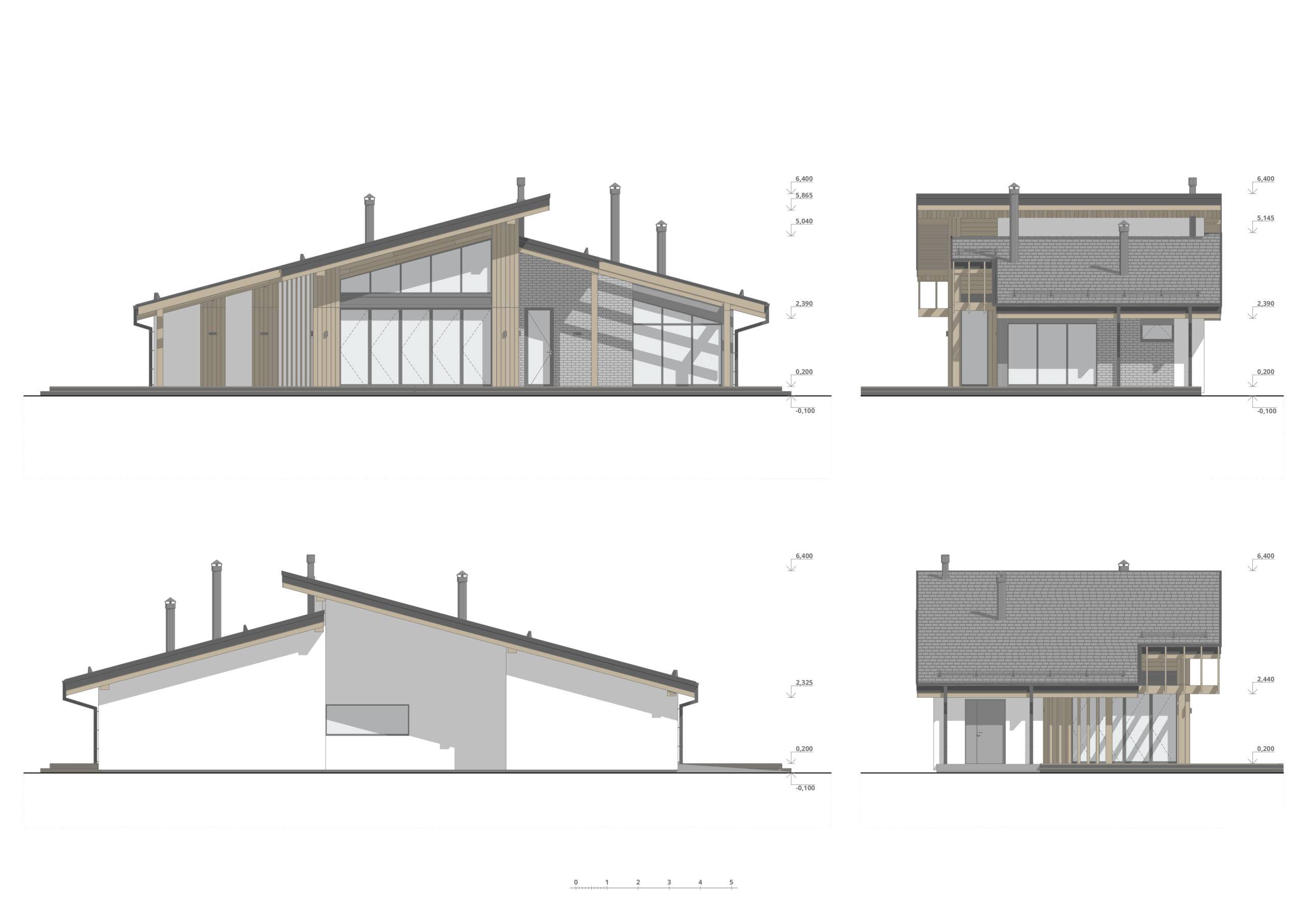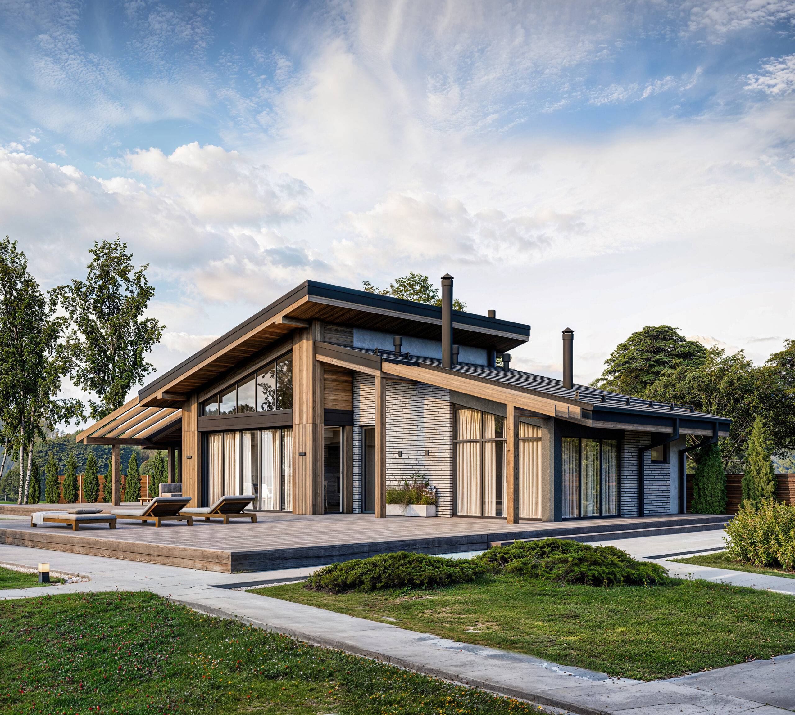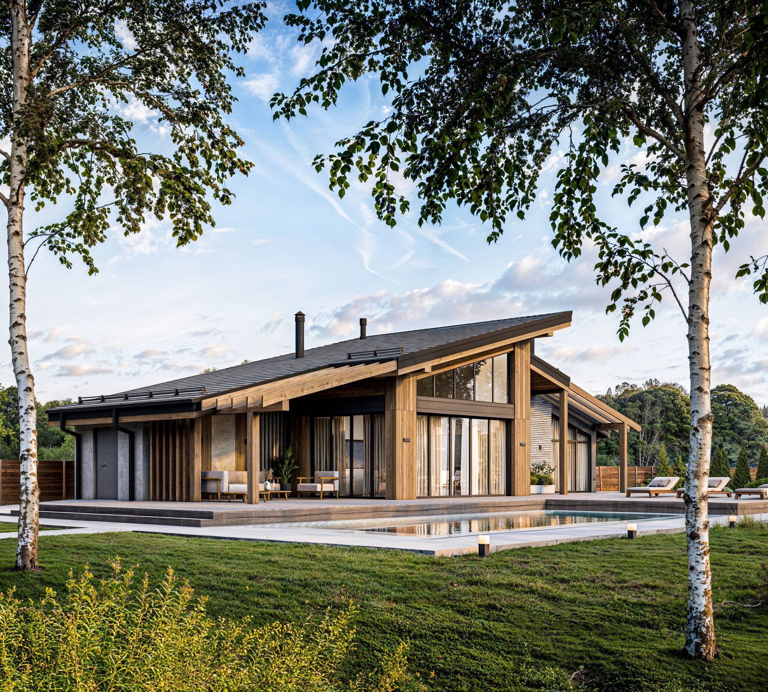 The complex of two main buildings on the lakefront creates a modern and comfortable retreat. The layout and positioning of the houses provide a private inner space with a swimming pool and a picturesque view of the lake.