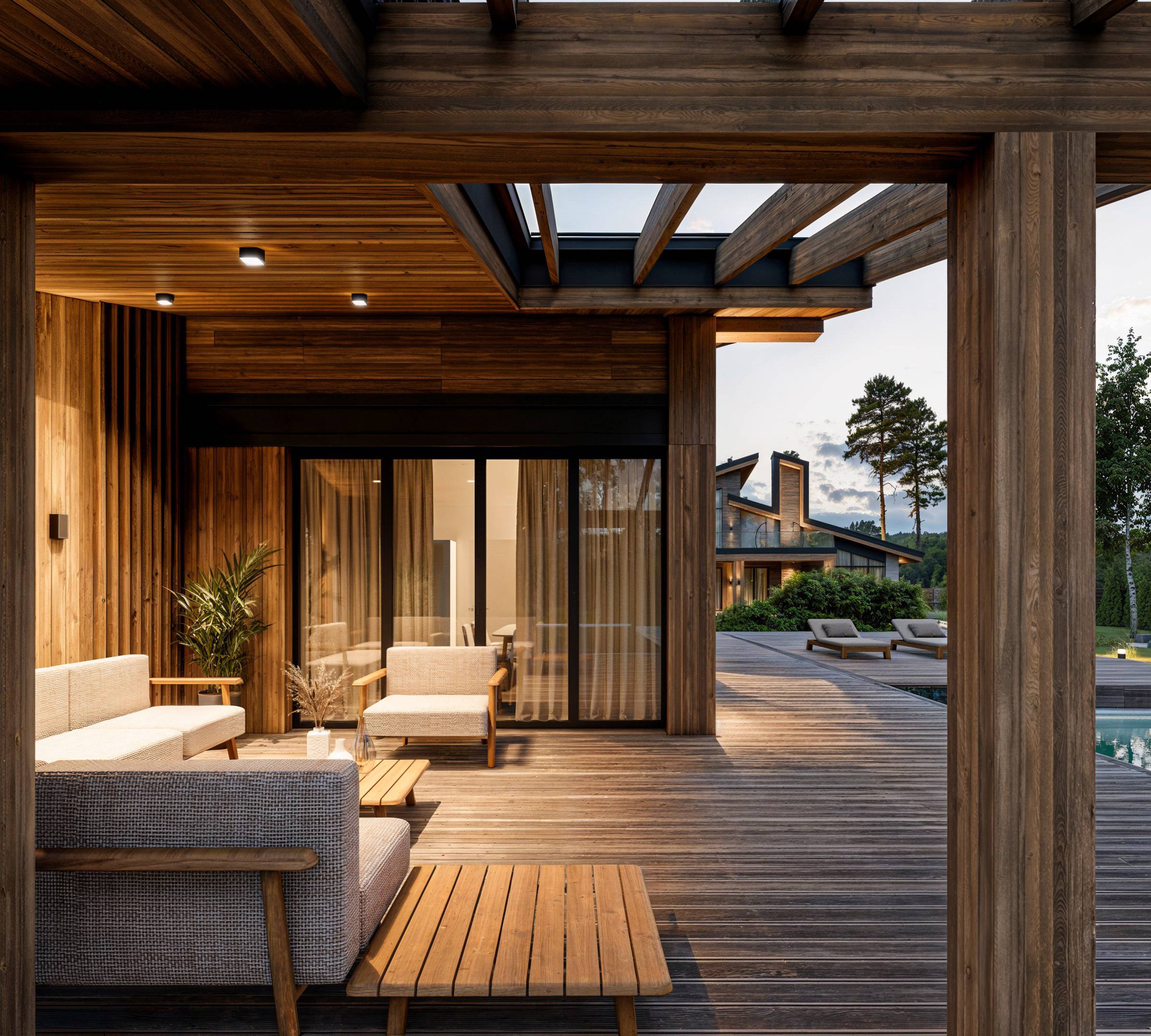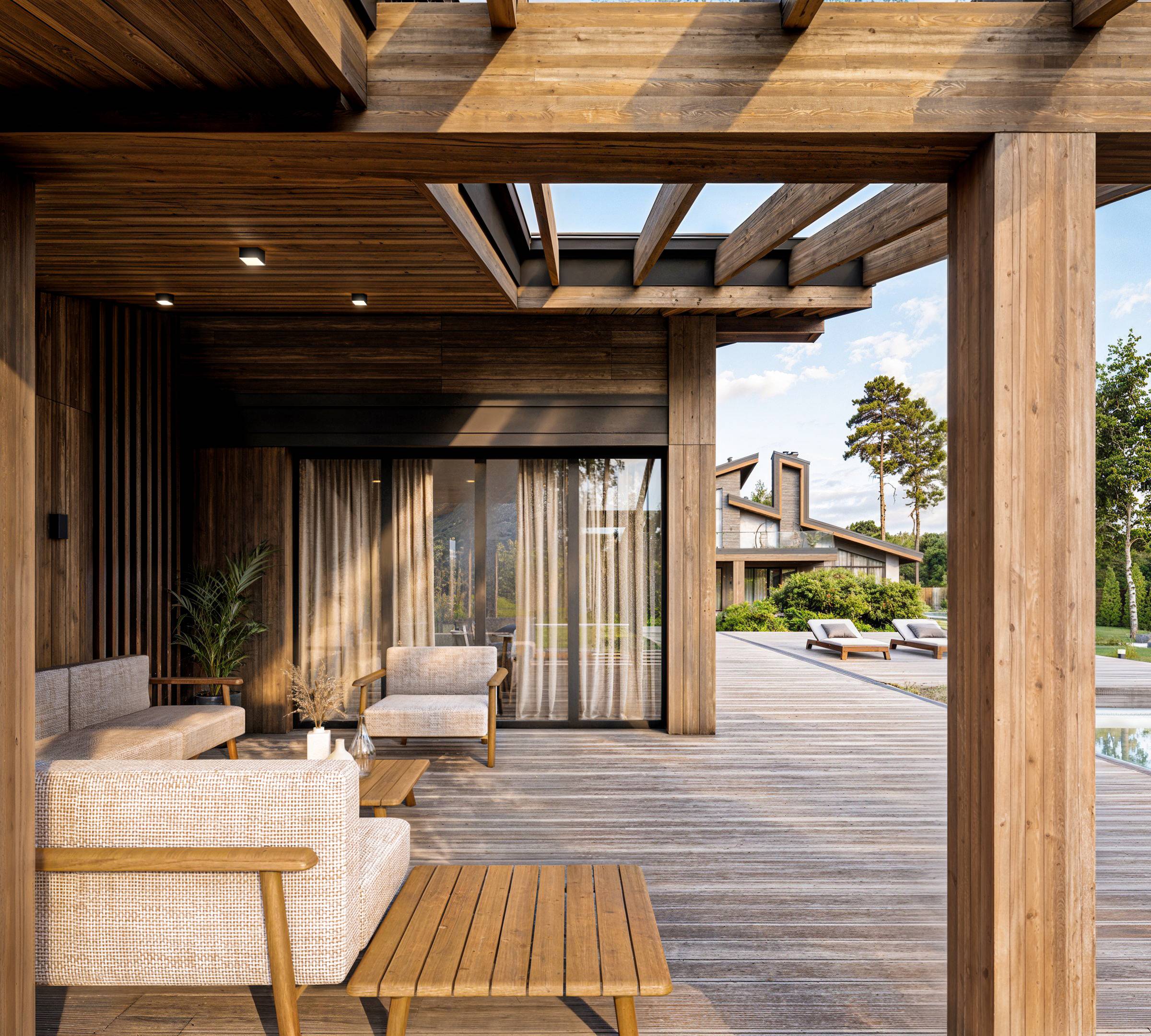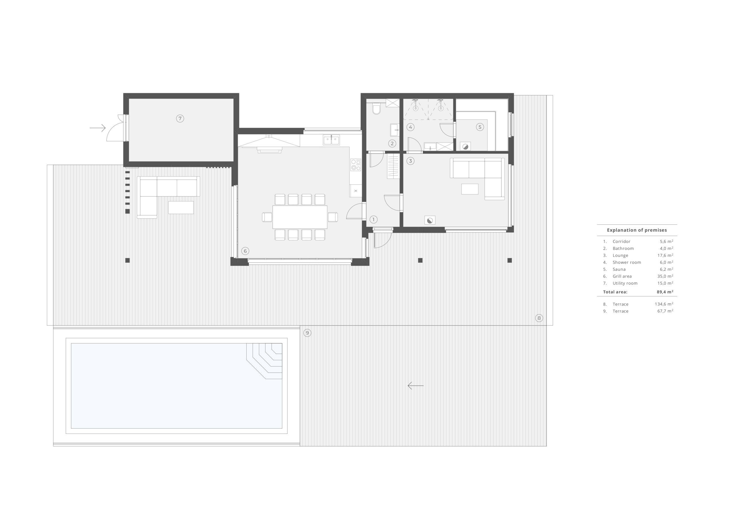 The separate placement of the sauna and barbecue area allows for a clear division between lively recreation and the main living space, ensuring peace and tranquility.