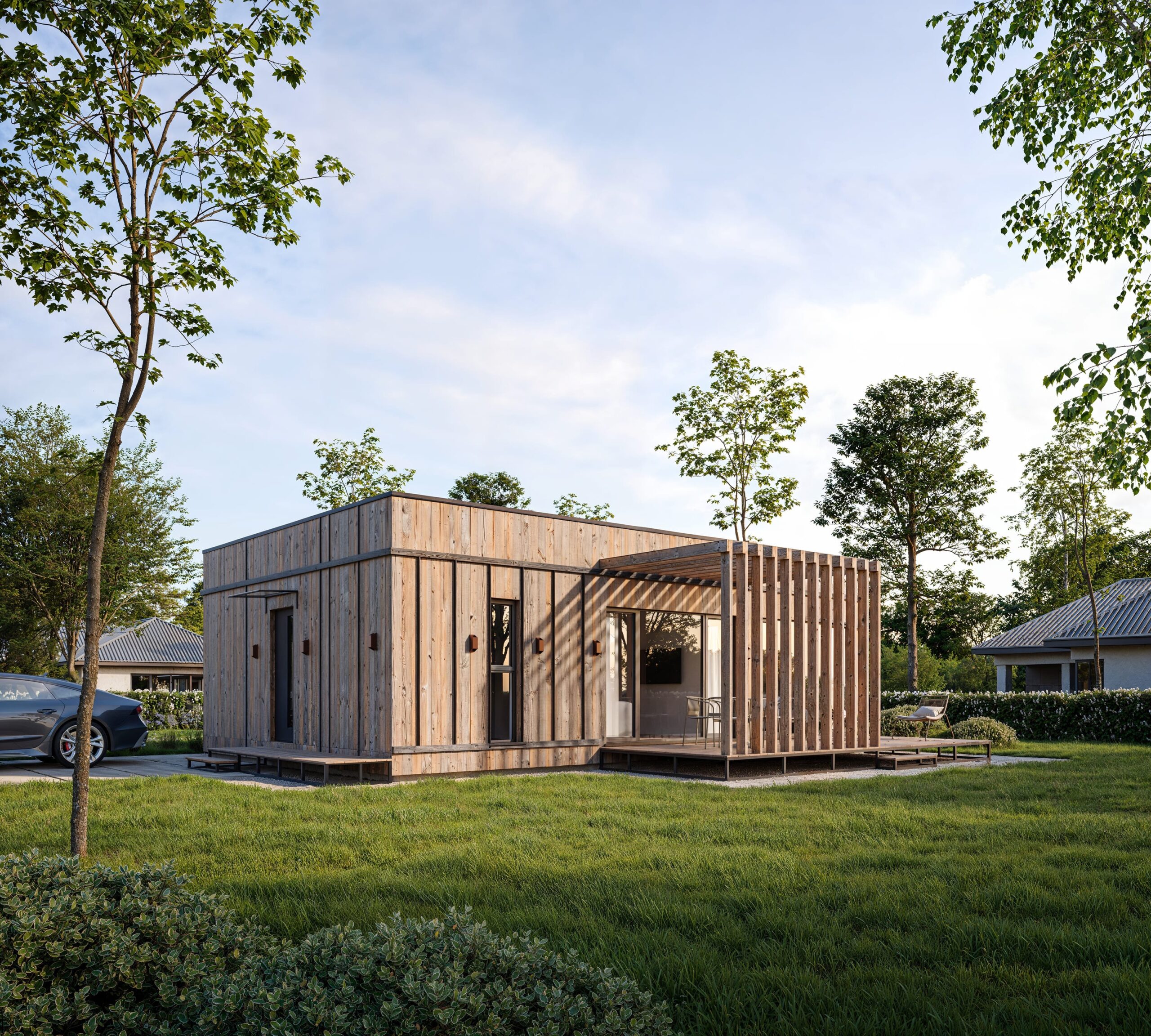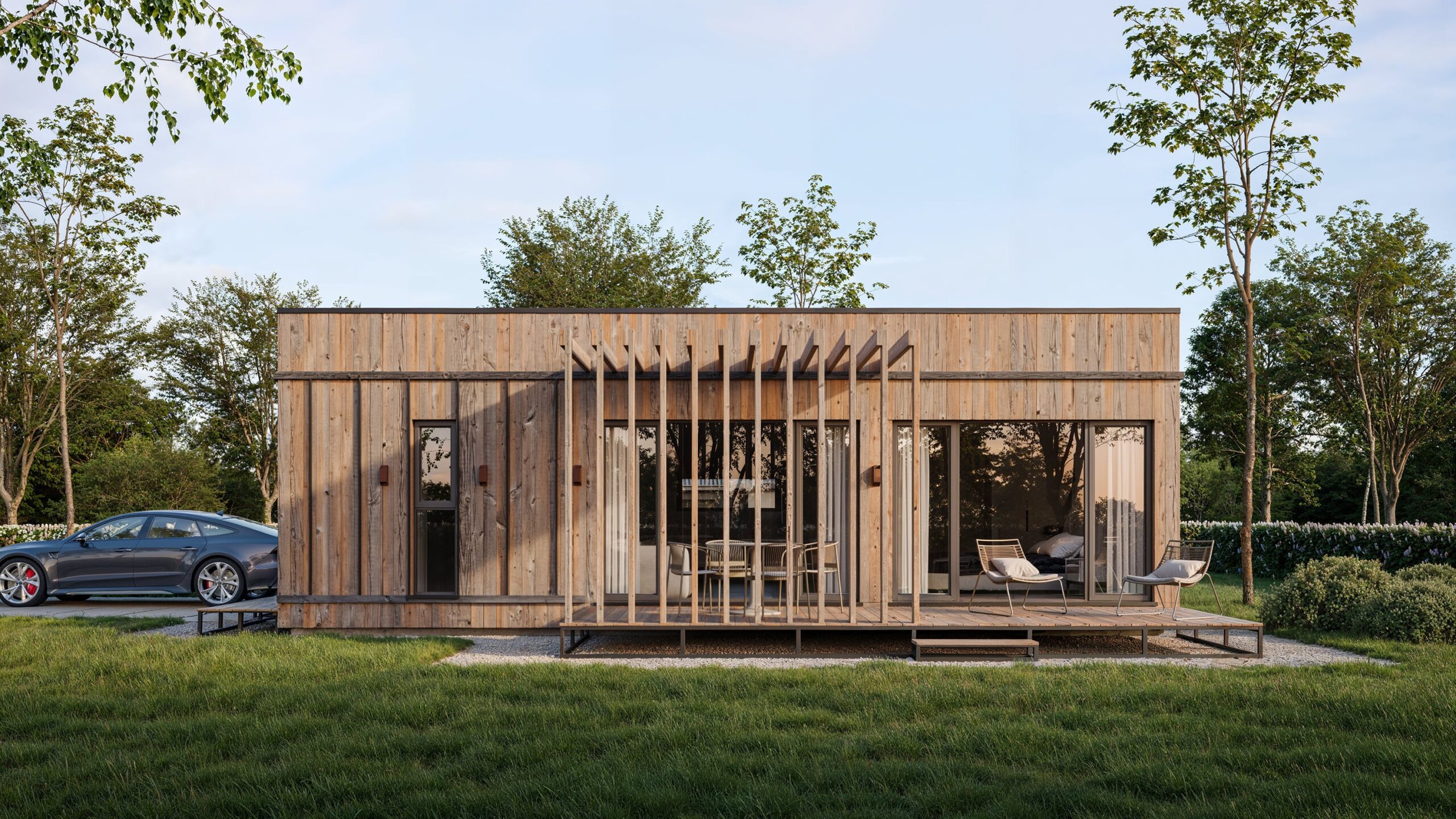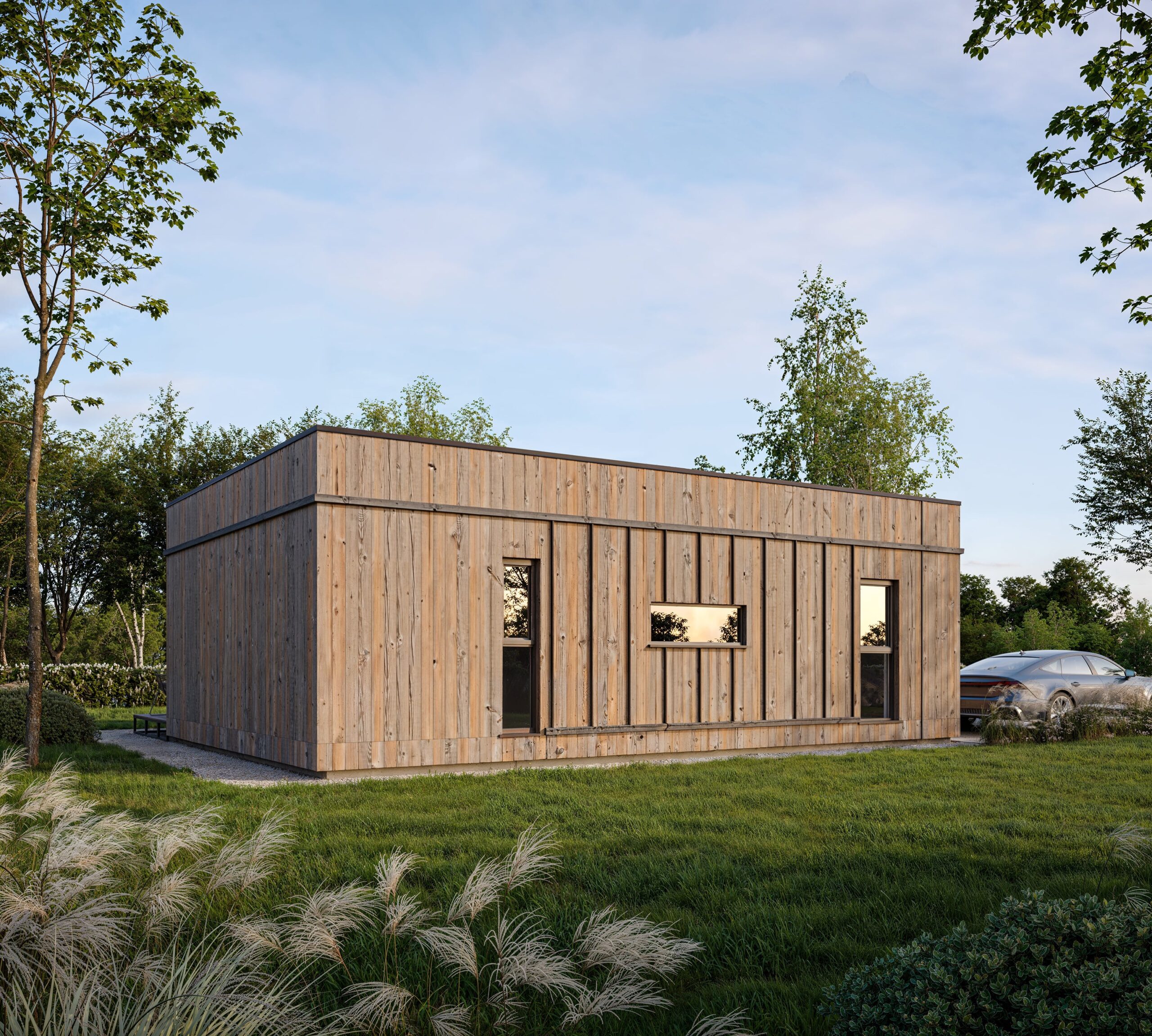 The reliable SIP construction, natural wood facade, and premium Rehau Synego windows guarantee warmth, a healthy microclimate, and comfort throughout the year.