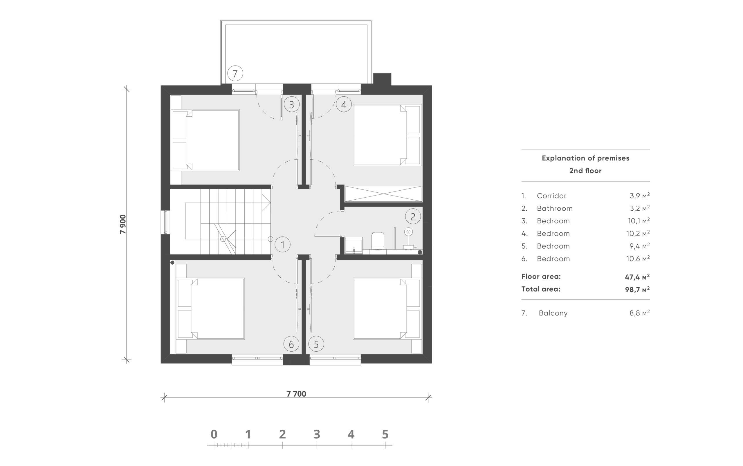 The second floor accommodates an entrance hall (3.9 m2), a bathroom (3.2 m2), two children’s rooms of 10.2 m2 each with their own access to the balcony (8.8 m2) and two bedrooms (9.4 and 10.6 m2).