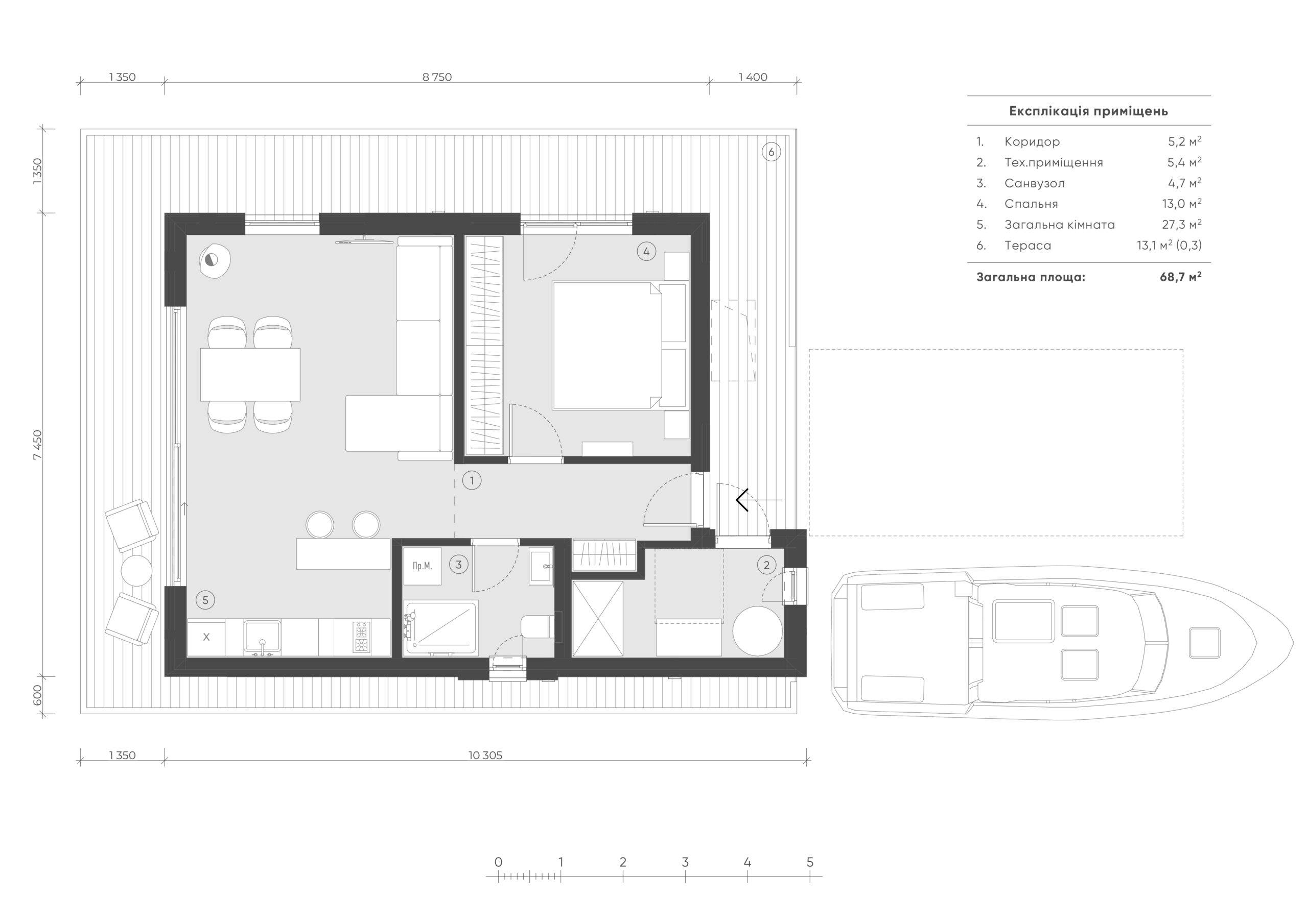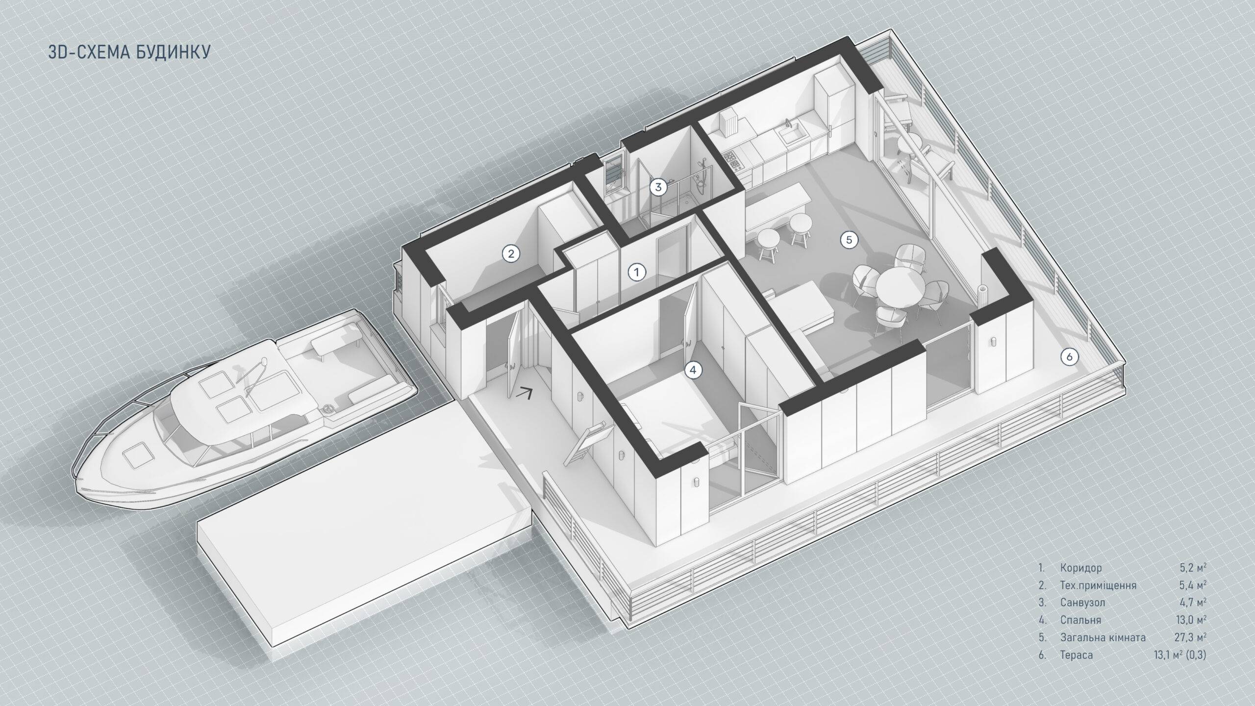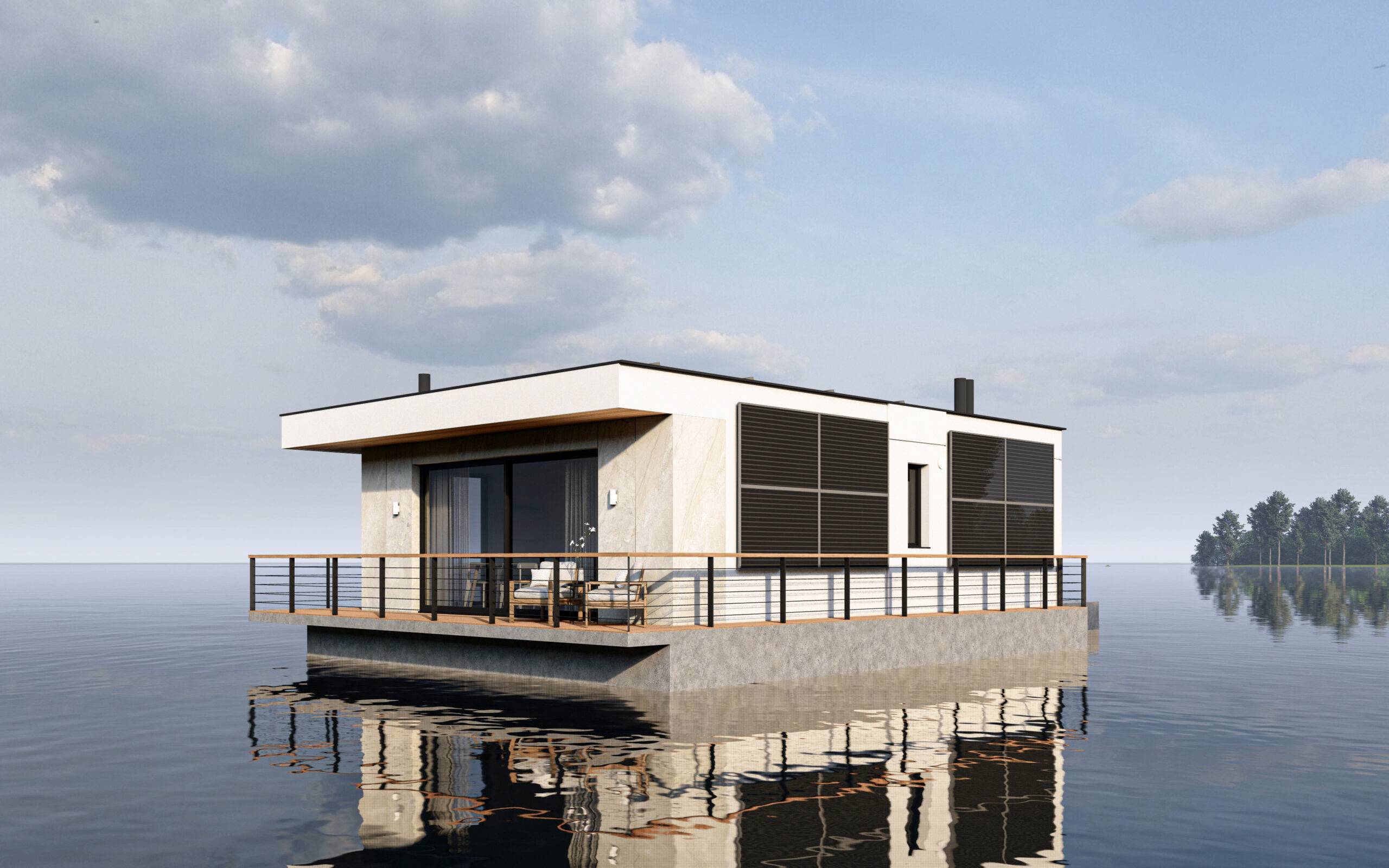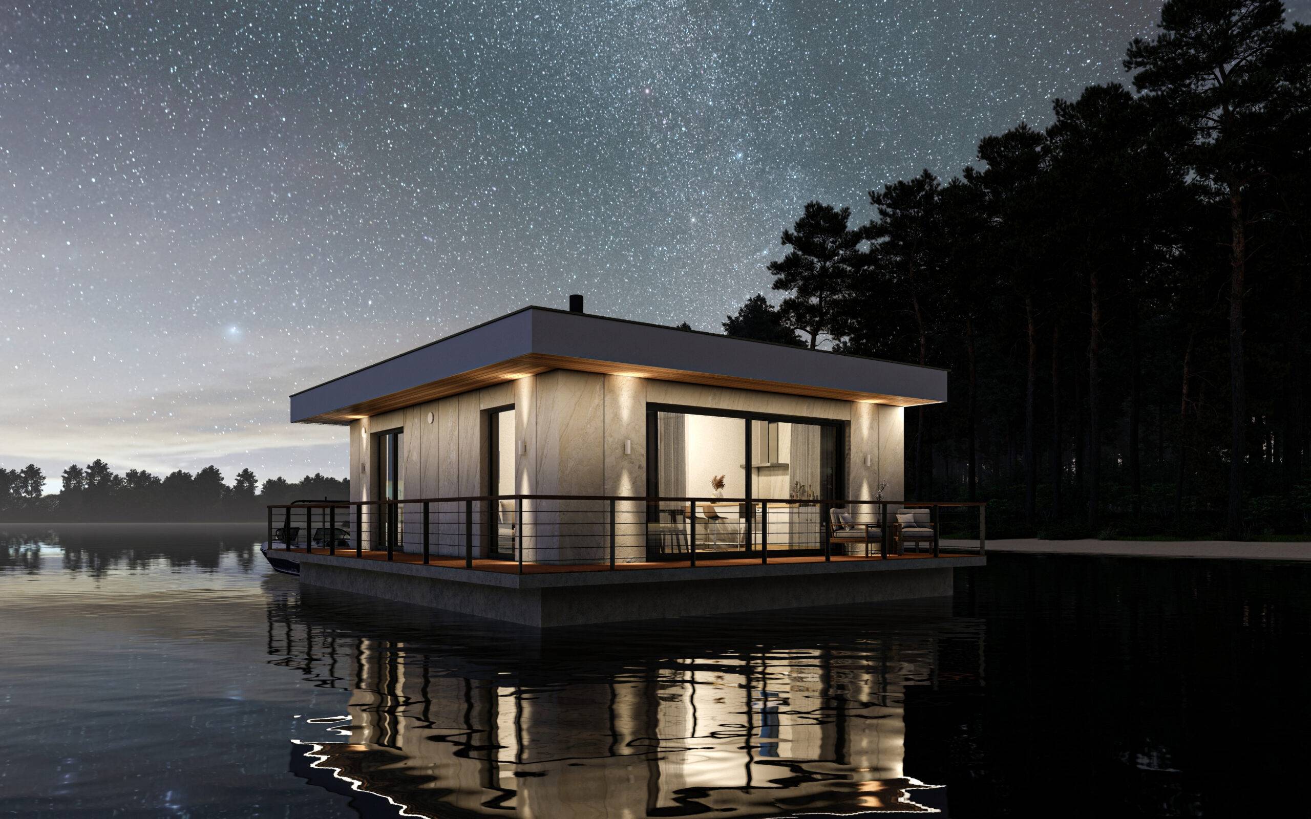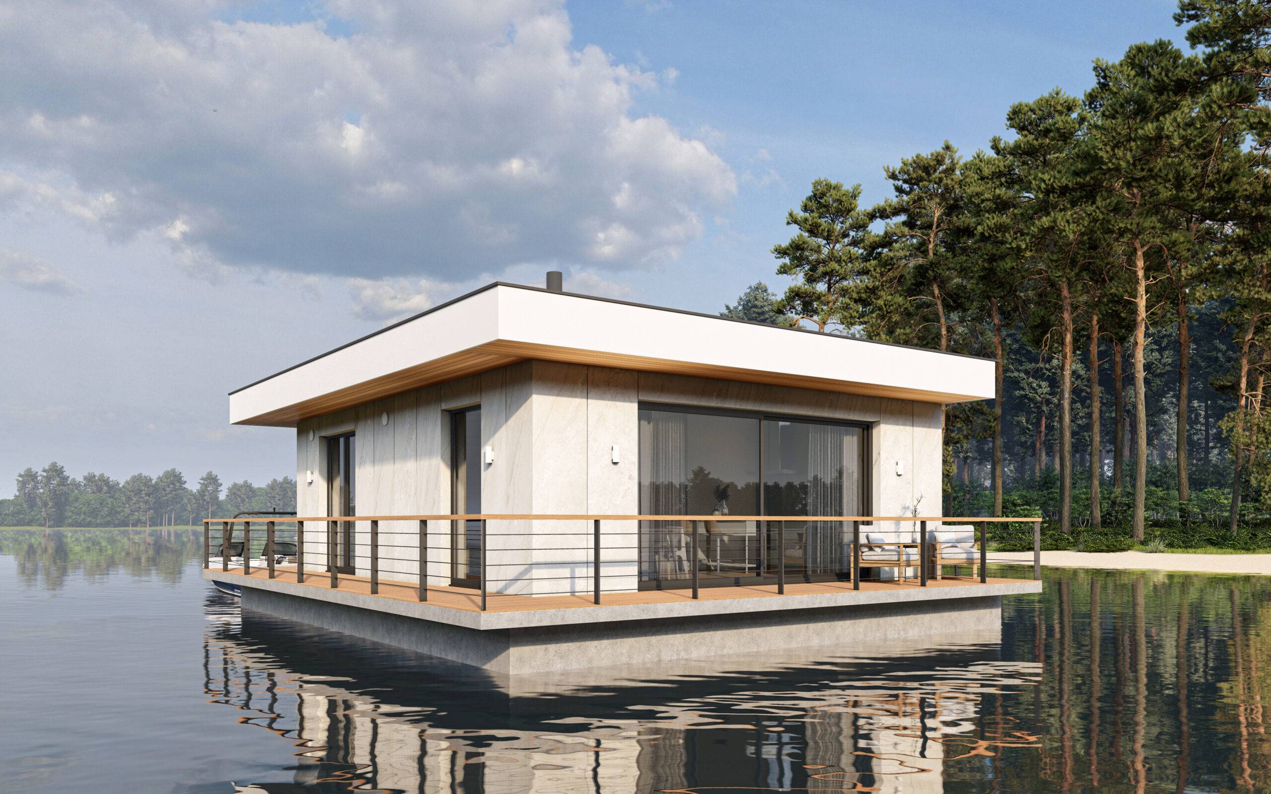 House for recreation on a pontoon. It is intended for both permanent and periodic stay.