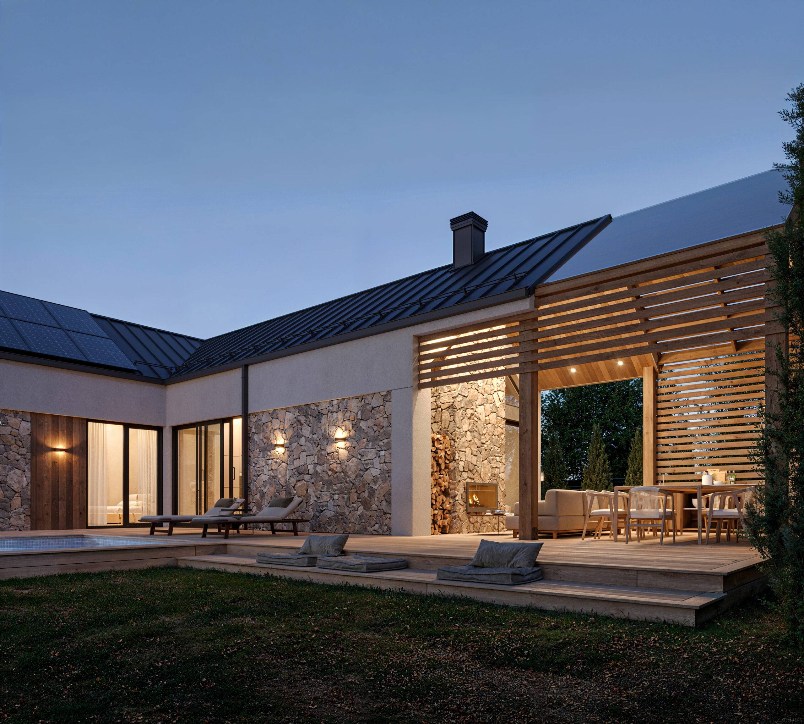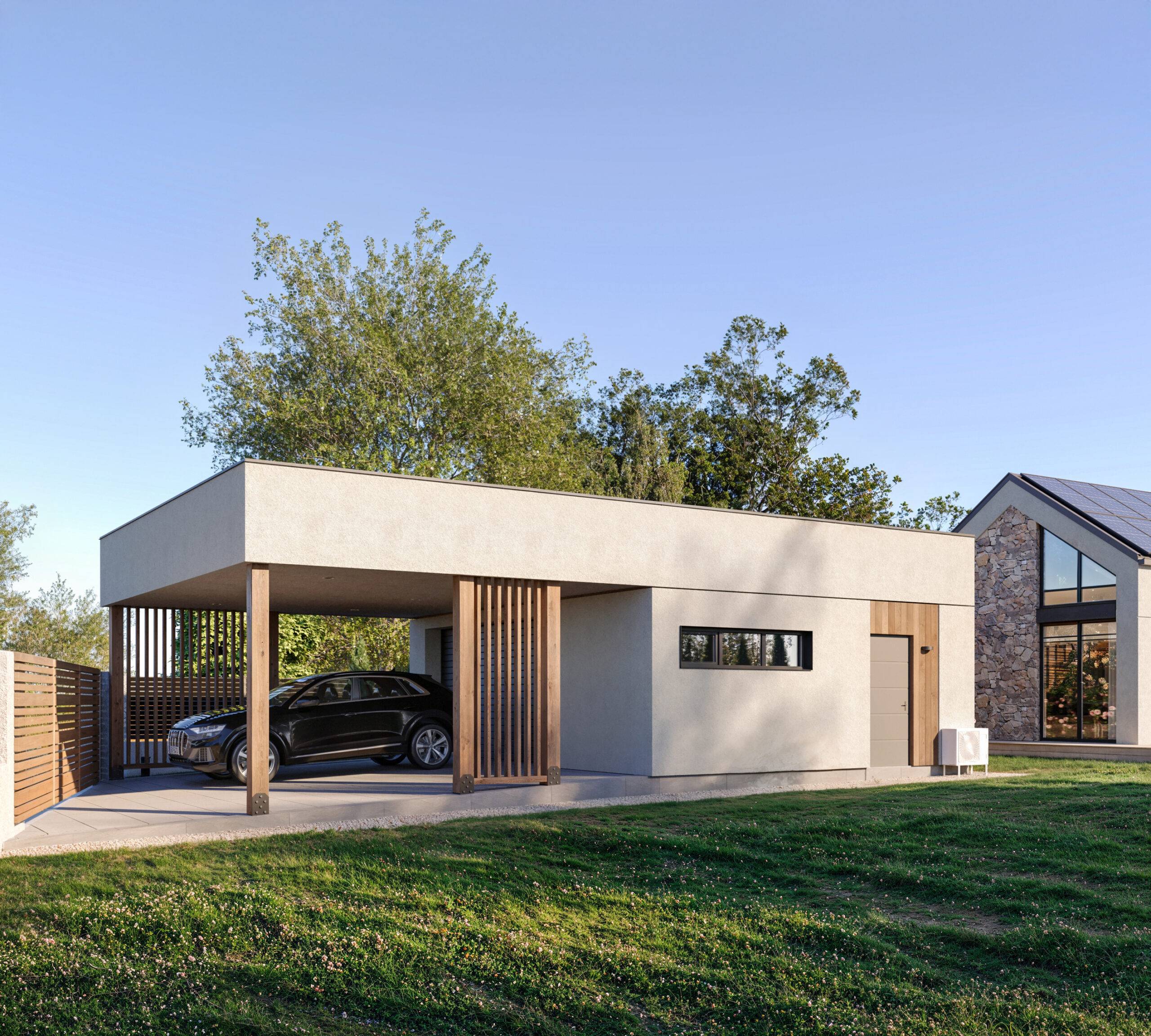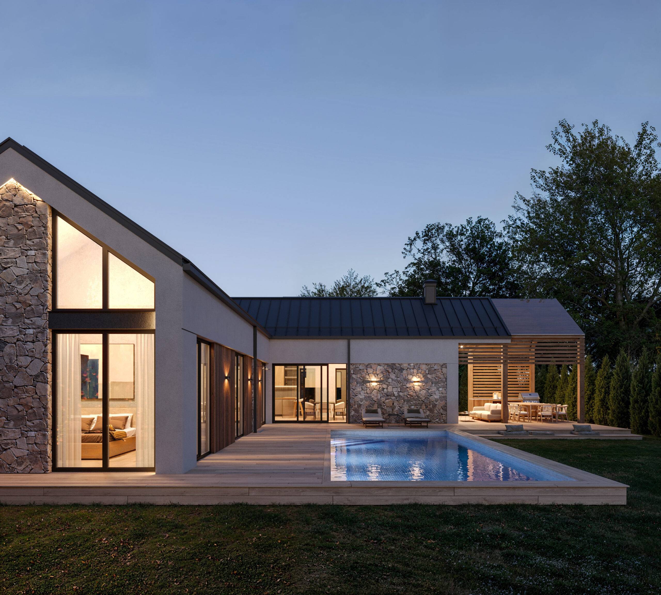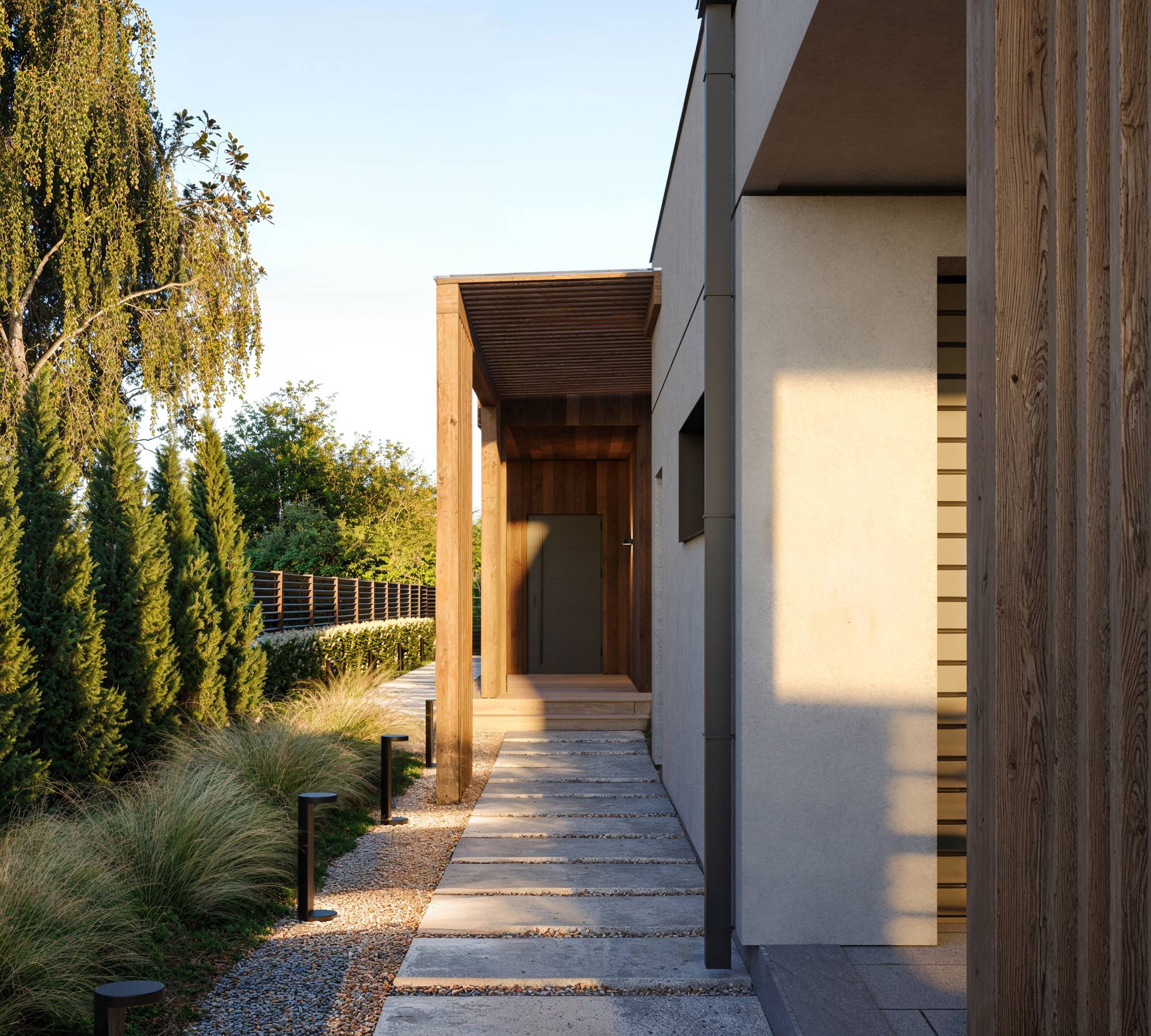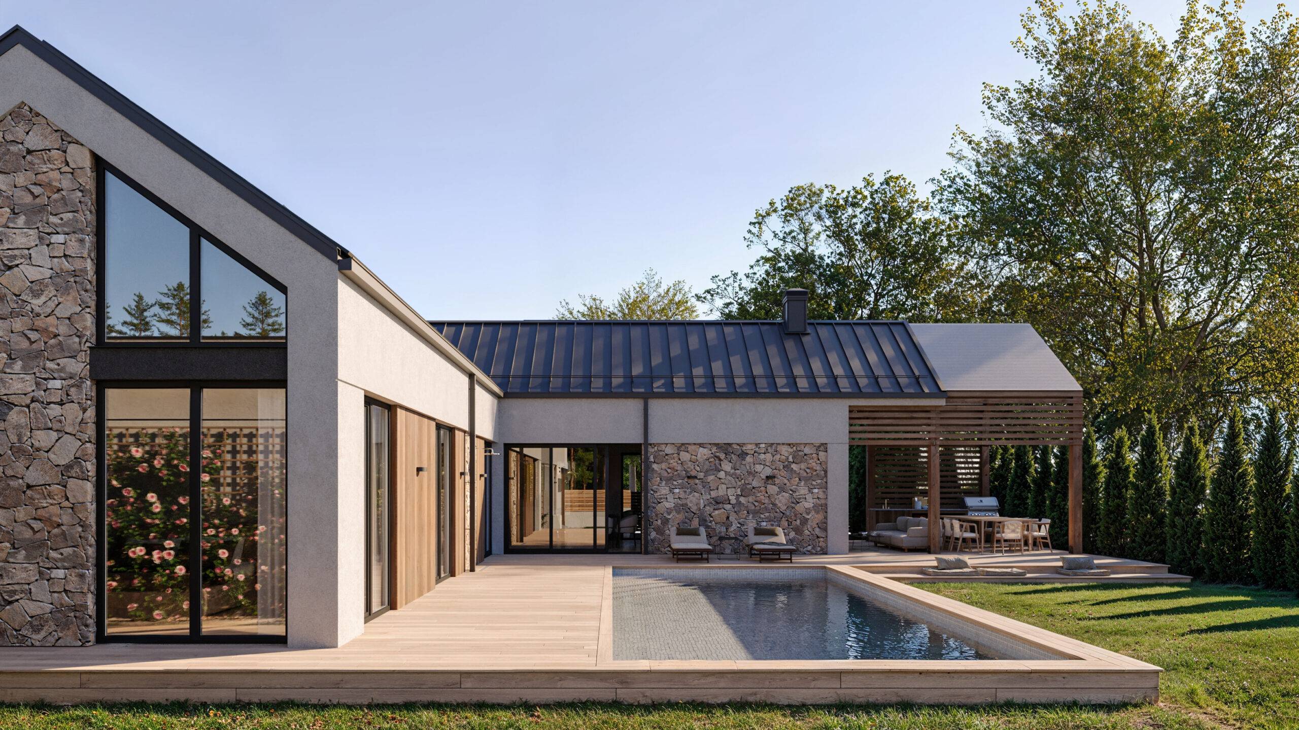 The rest of the house will be made from SIP panels: 200/160/120 mm for walls and 220 mm for the roof. The house was designed in conjunction with a garage, both sharing the same color scheme and connected by a pergola. The main entrance to the house is also designed along the garage. A defining element of the complex is a pool, which the house wraps around from two sides.