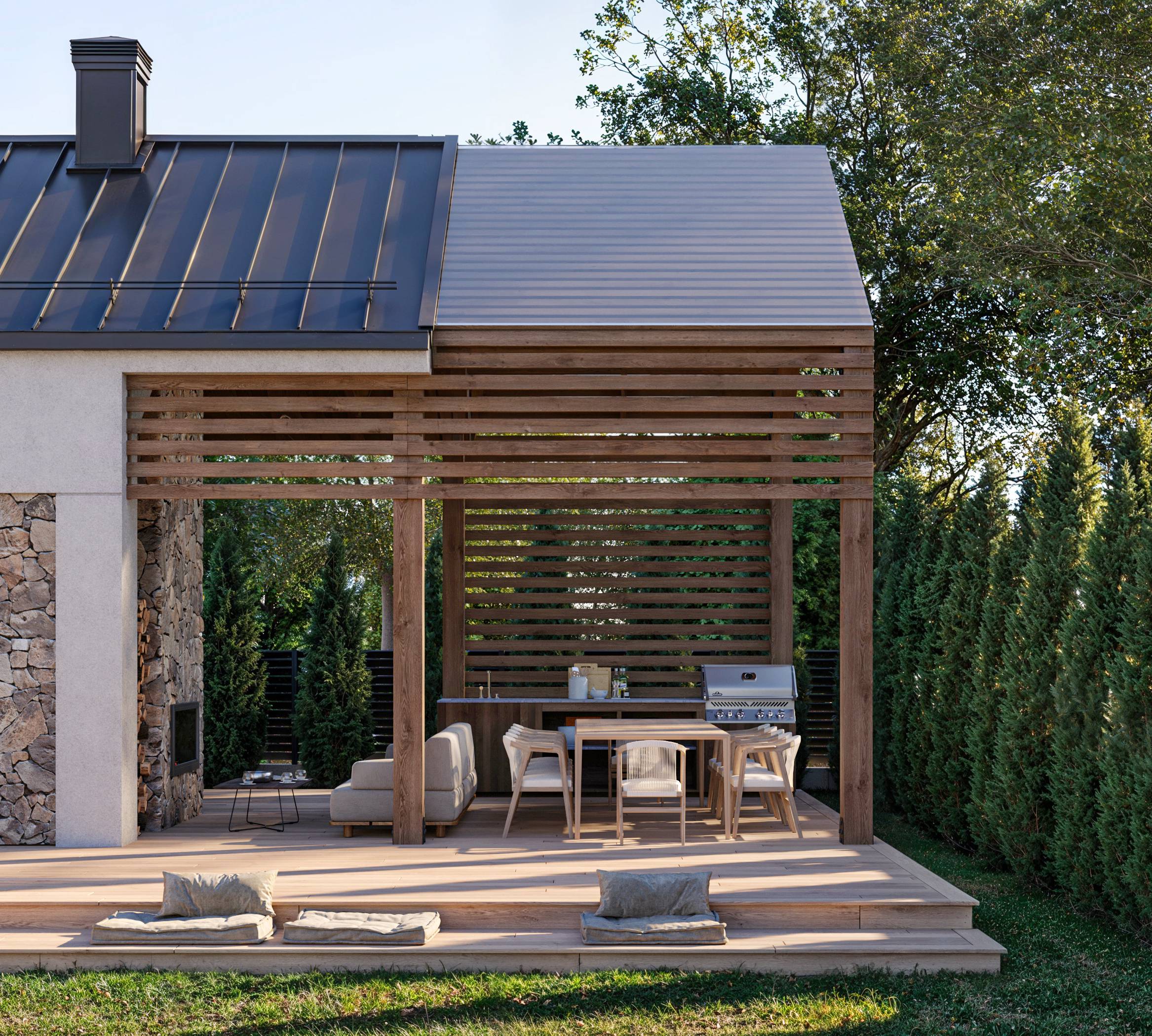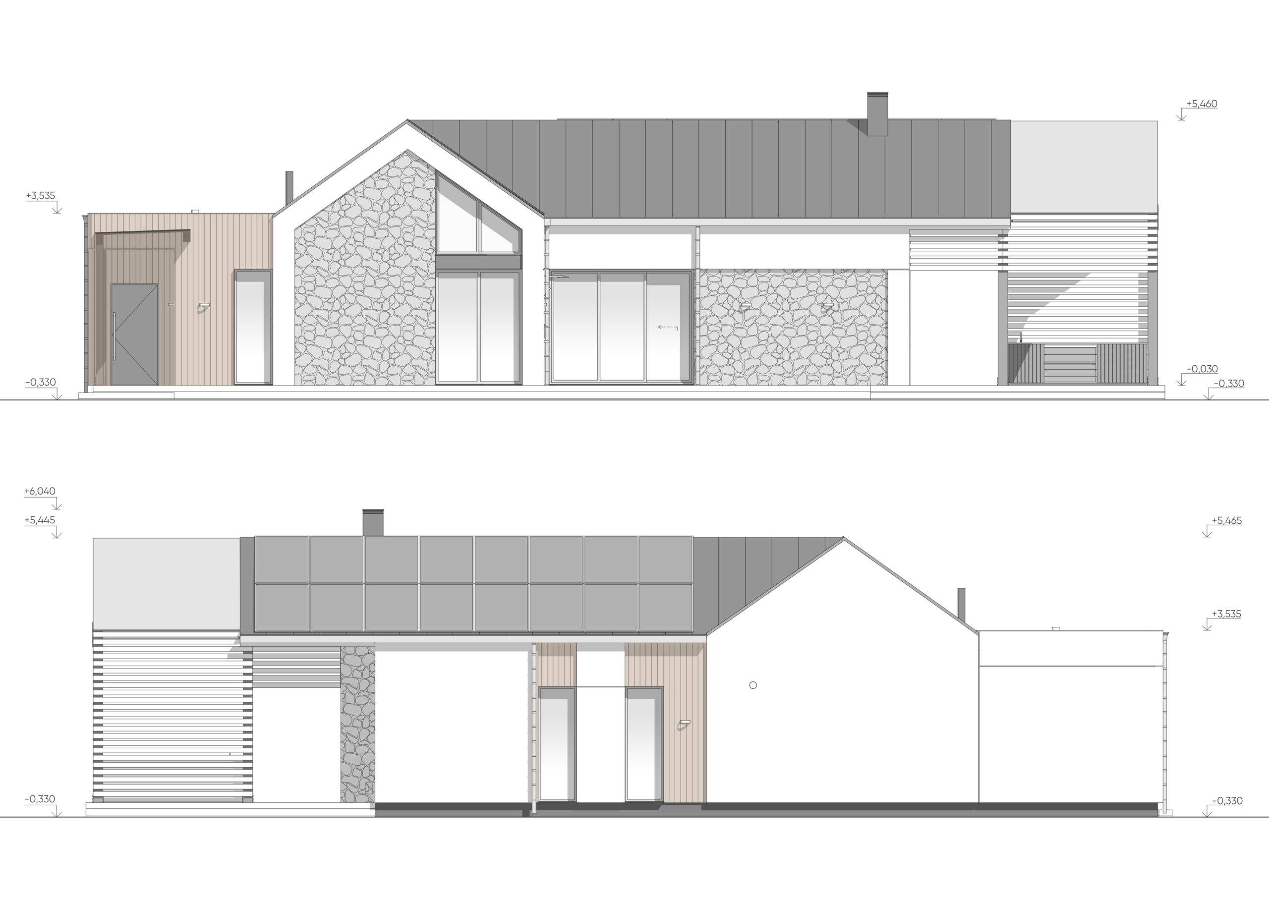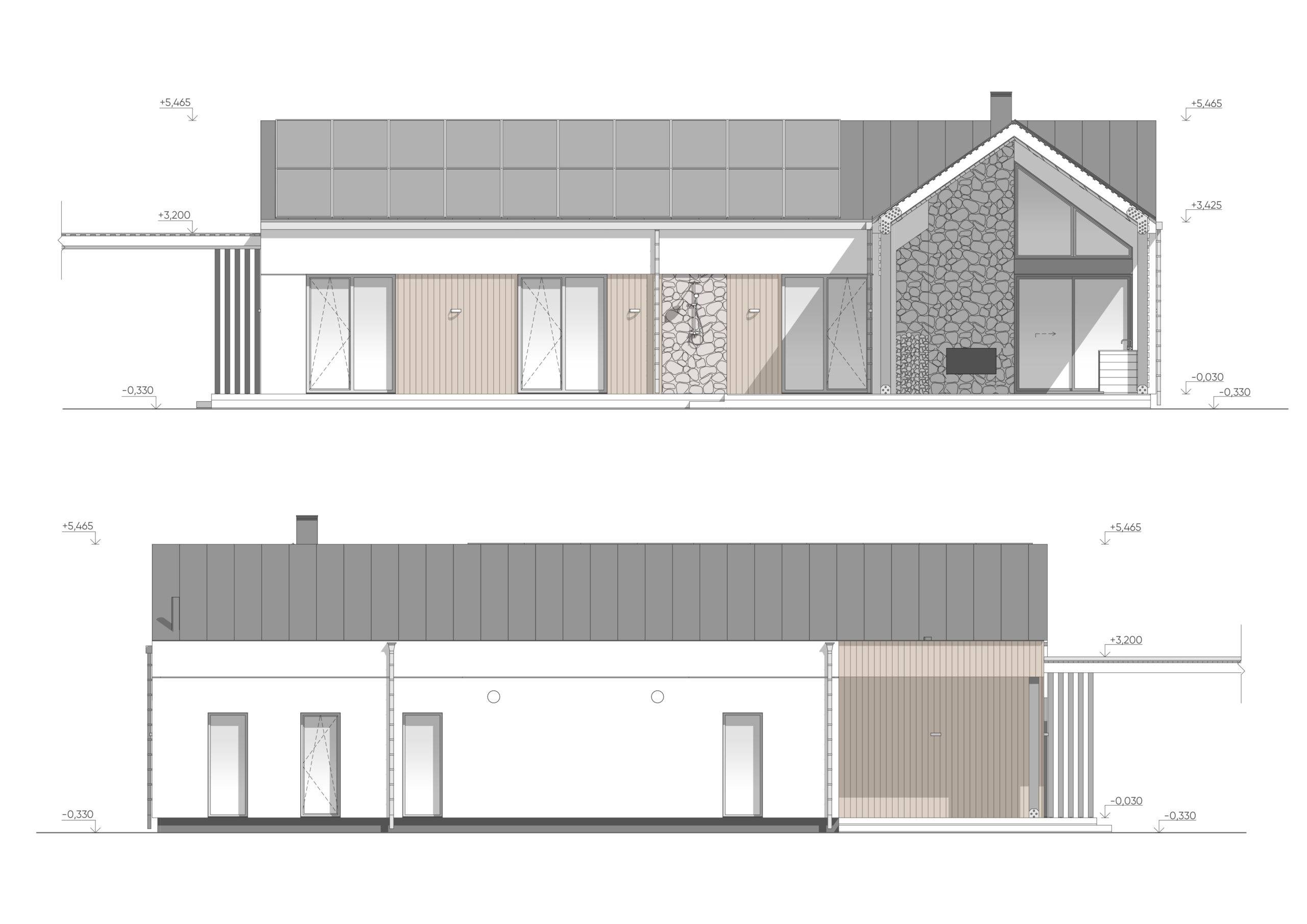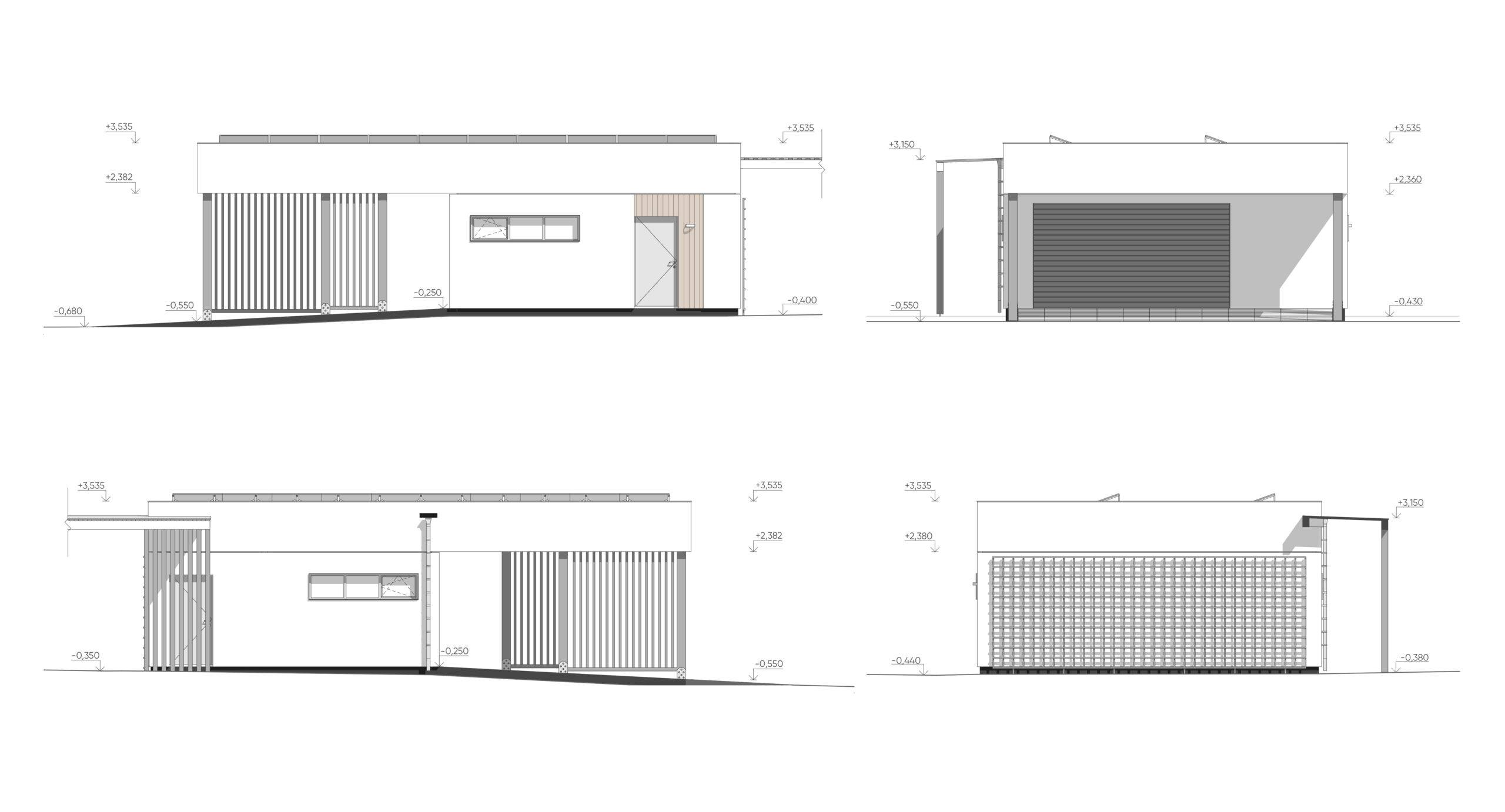 The rest of the house will be made from SIP panels: 200/160/120 mm for walls and 220 mm for the roof. The house was designed in conjunction with a garage, both sharing the same color scheme and connected by a pergola. The main entrance to the house is also designed along the garage. A defining element of the complex is a pool, which the house wraps around from two sides.