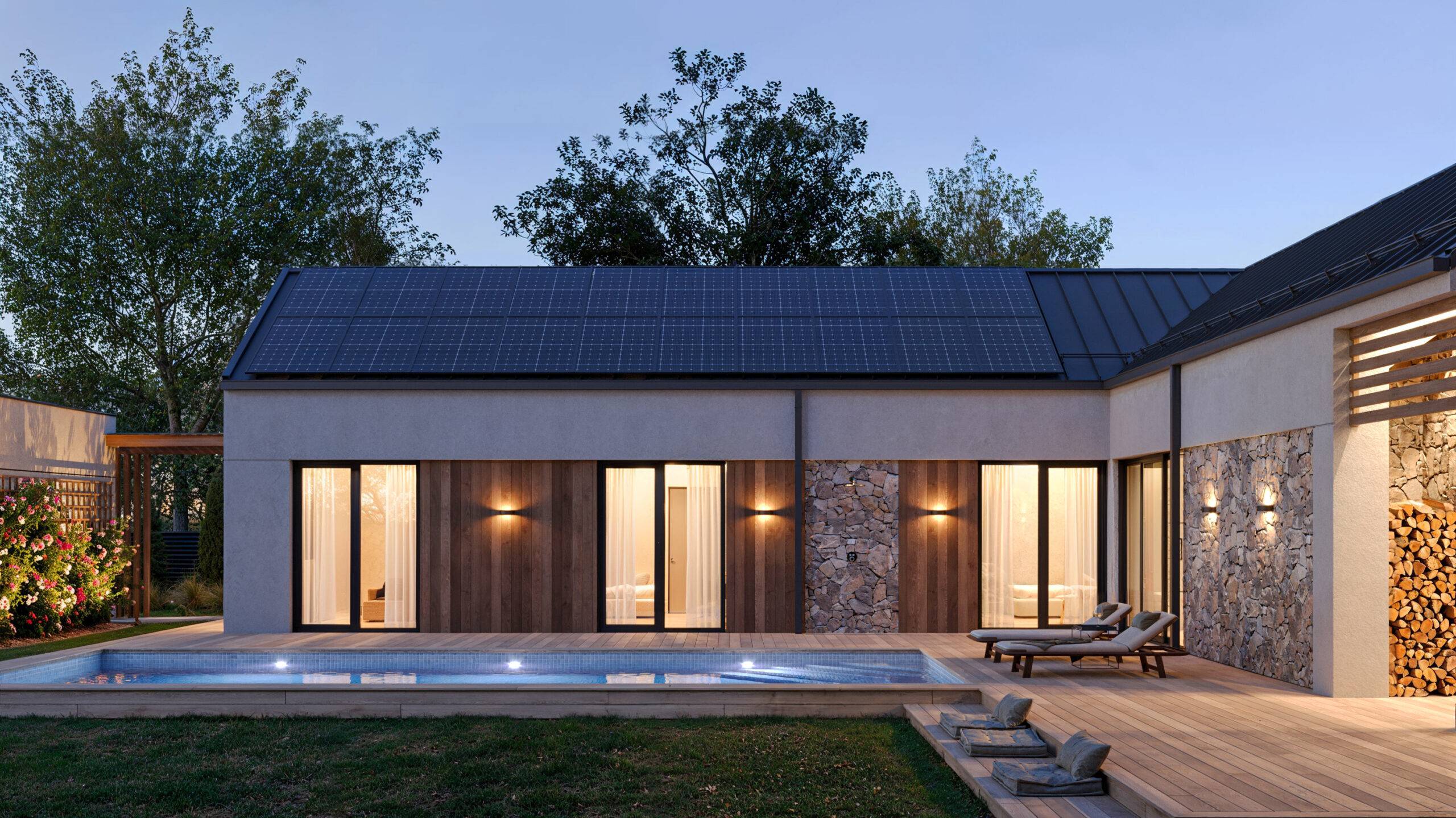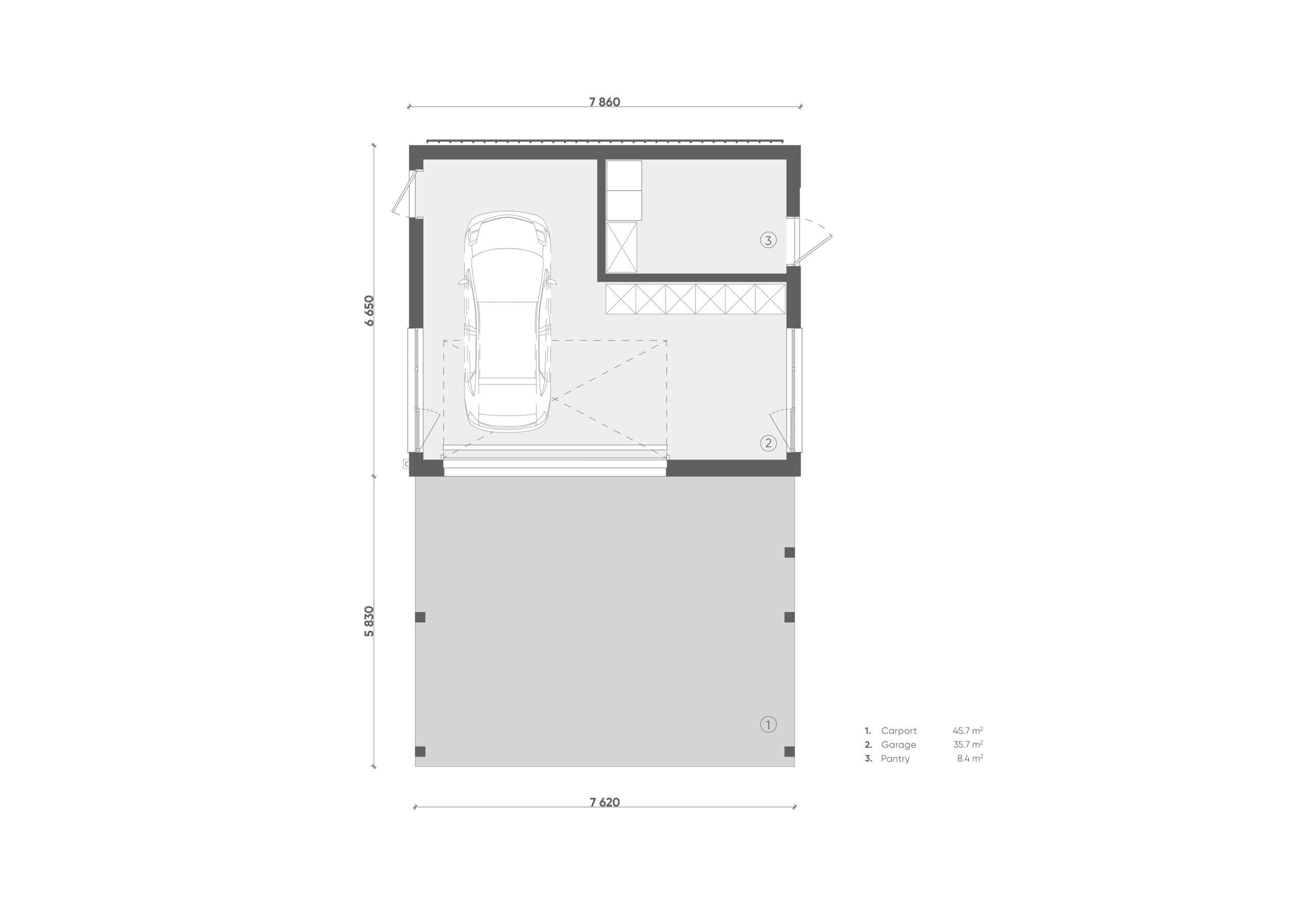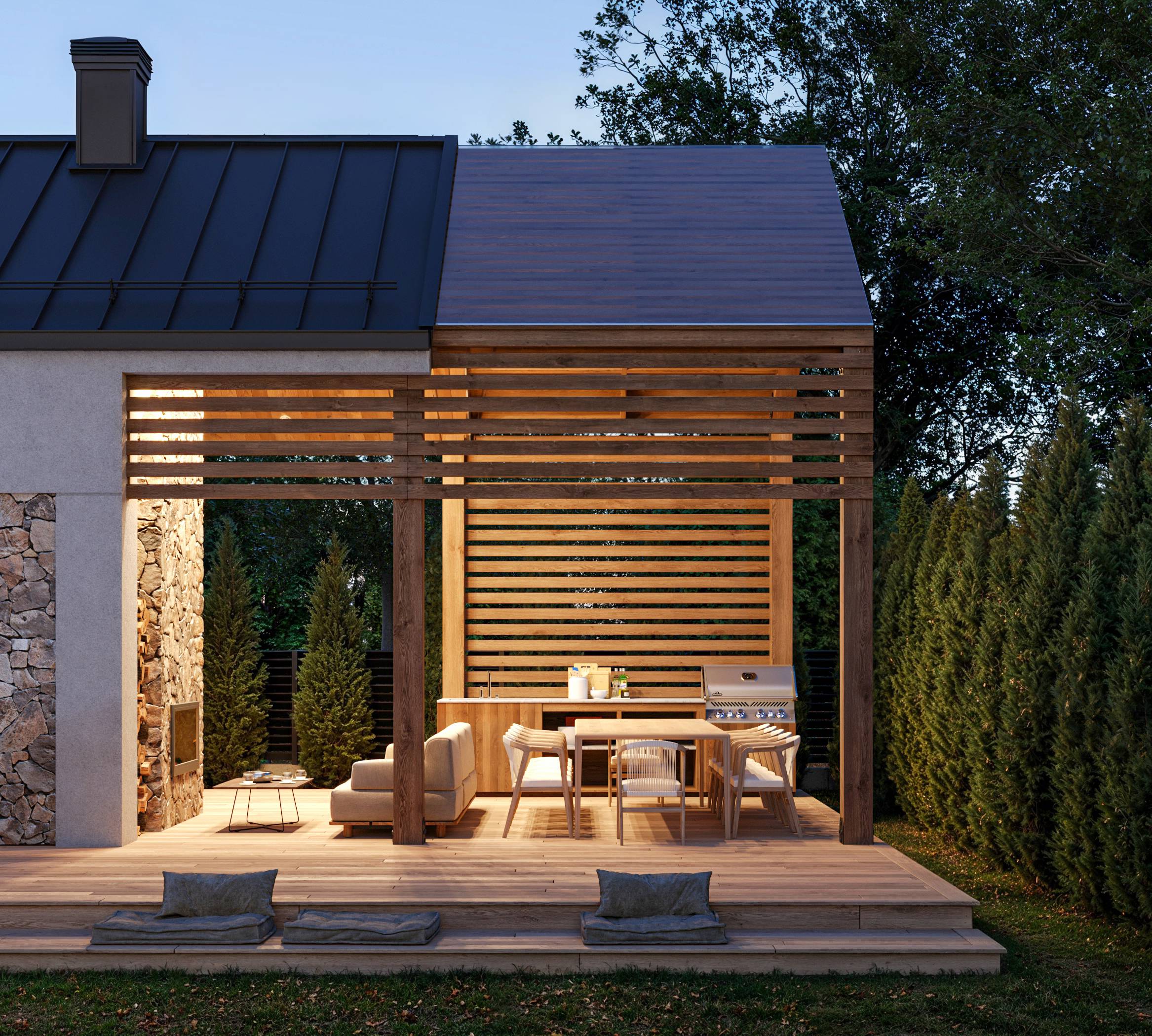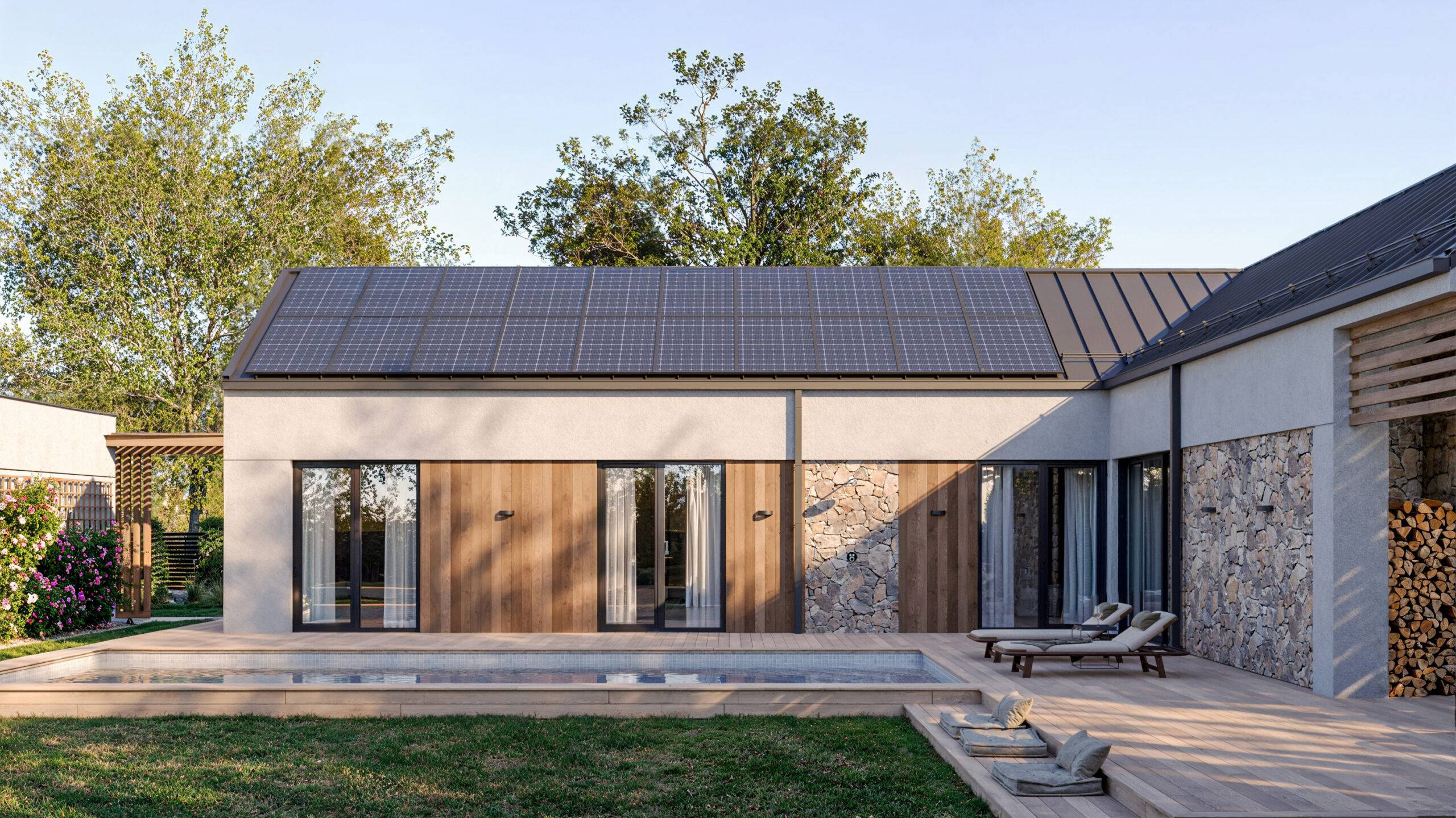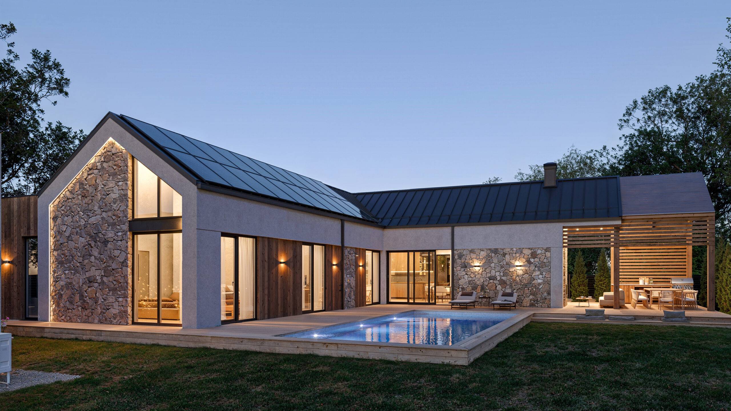 The rest of the house will be made from SIP panels: 200/160/120 mm for walls and 220 mm for the roof. The house was designed in conjunction with a garage, both sharing the same color scheme and connected by a pergola. The main entrance to the house is also designed along the garage. A defining element of the complex is a pool, which the house wraps around from two sides.