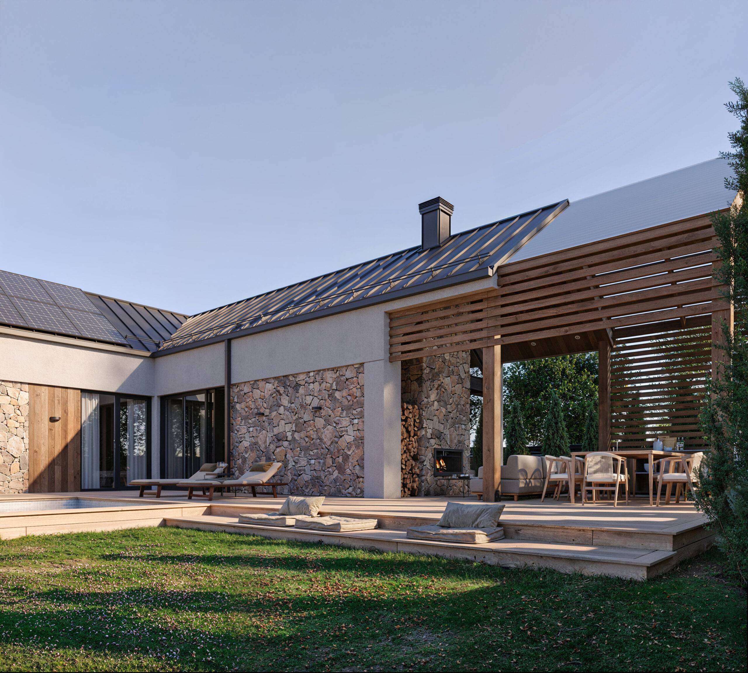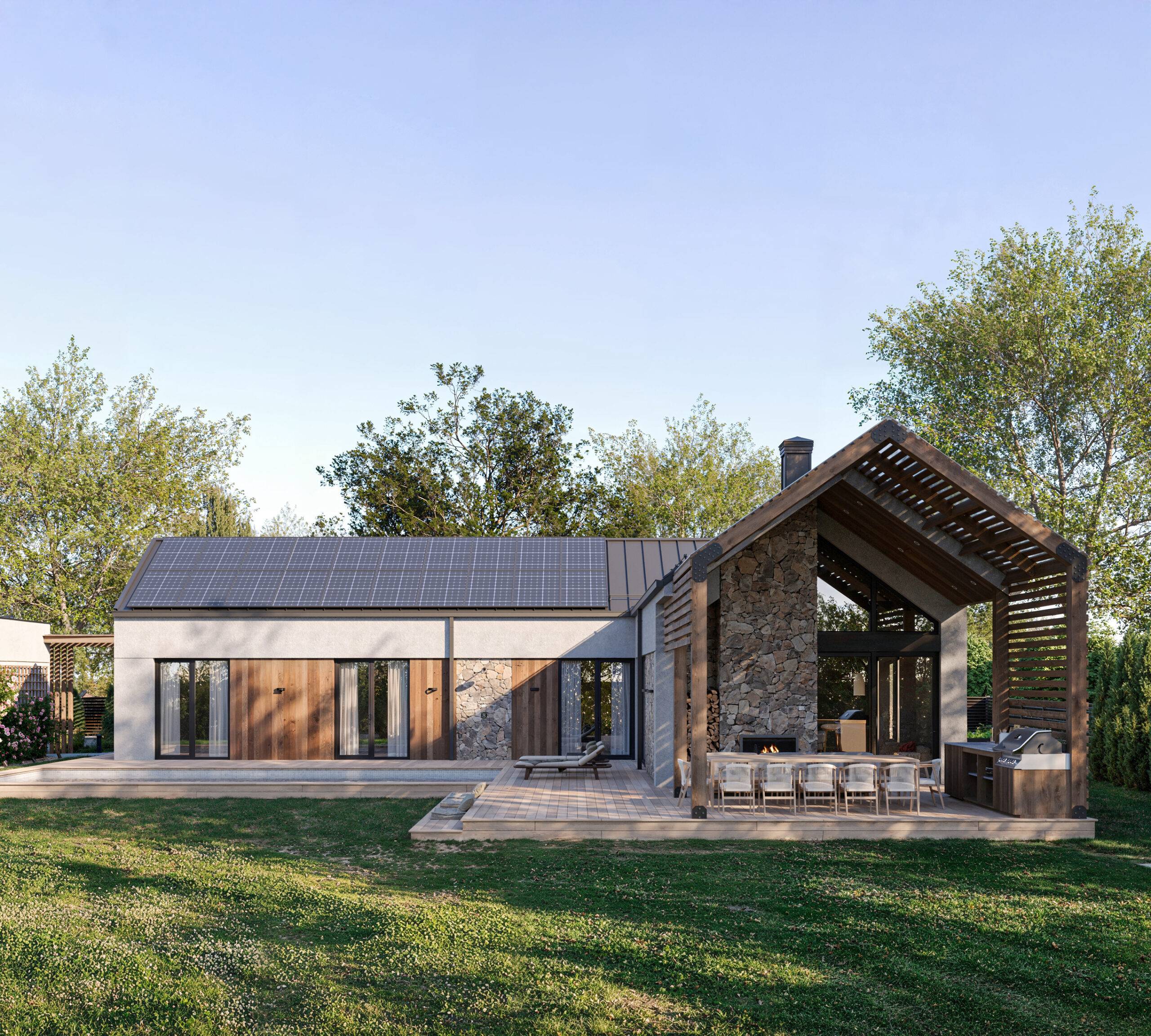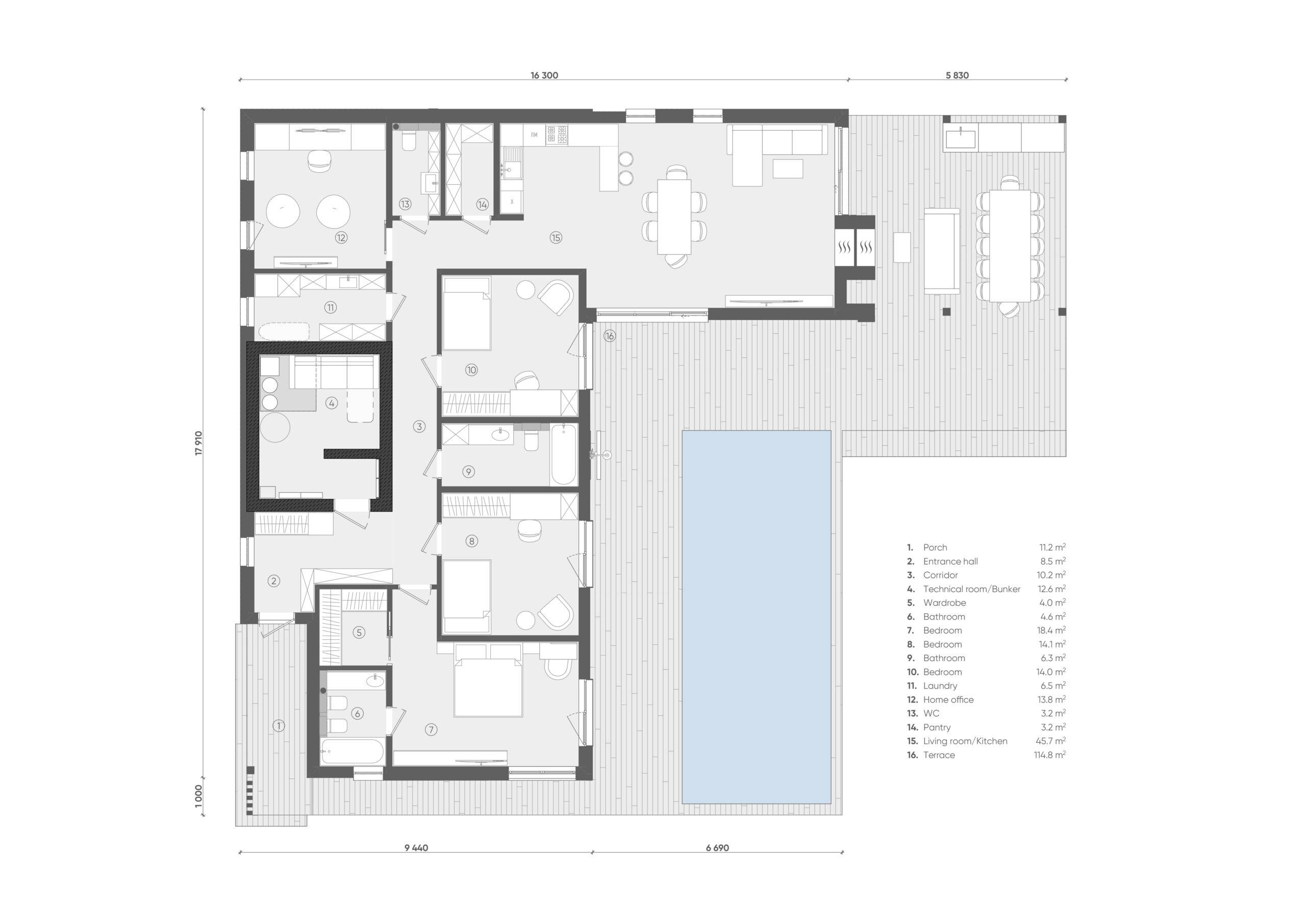 This is a single-story house with three bedrooms, three bathrooms, a study, a laundry room, a large living room connected to the kitchen, and a multifunctional terrace. However, the most interesting room in the house is the utility room. It serves a dual purpose: besides its primary function, it will also serve as a shelter during air alerts. That’s why this room will be constructed with 300 mm thick concrete and triple reinforcement.