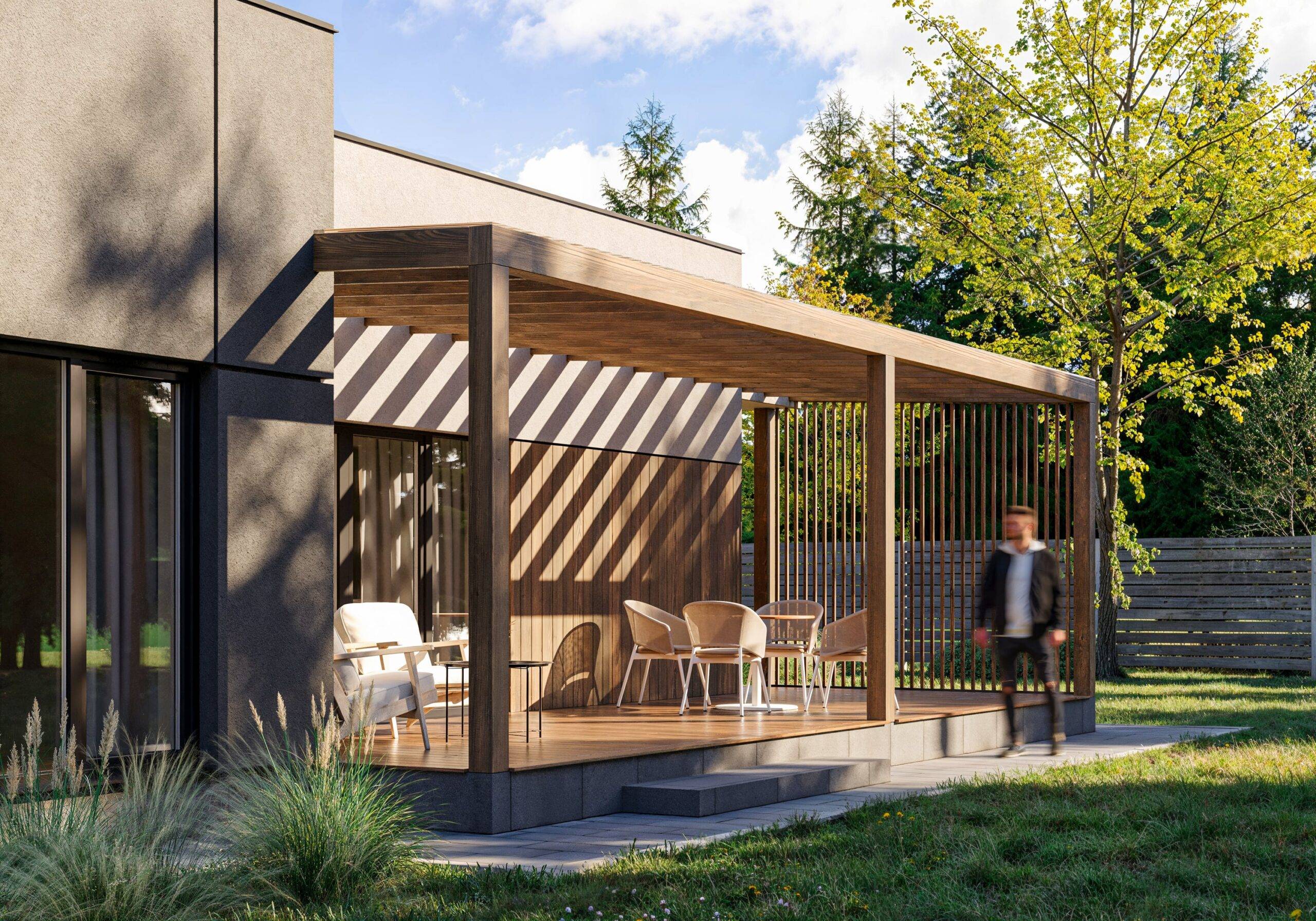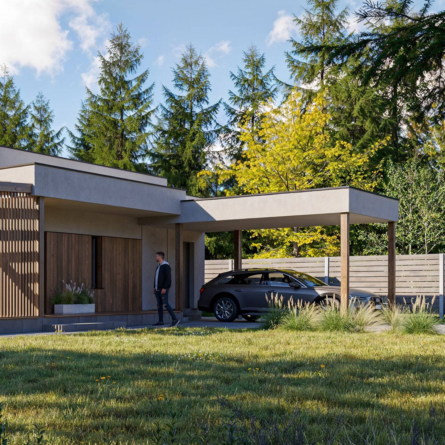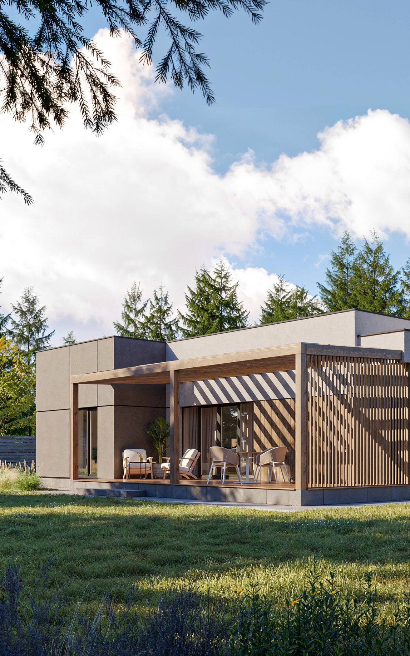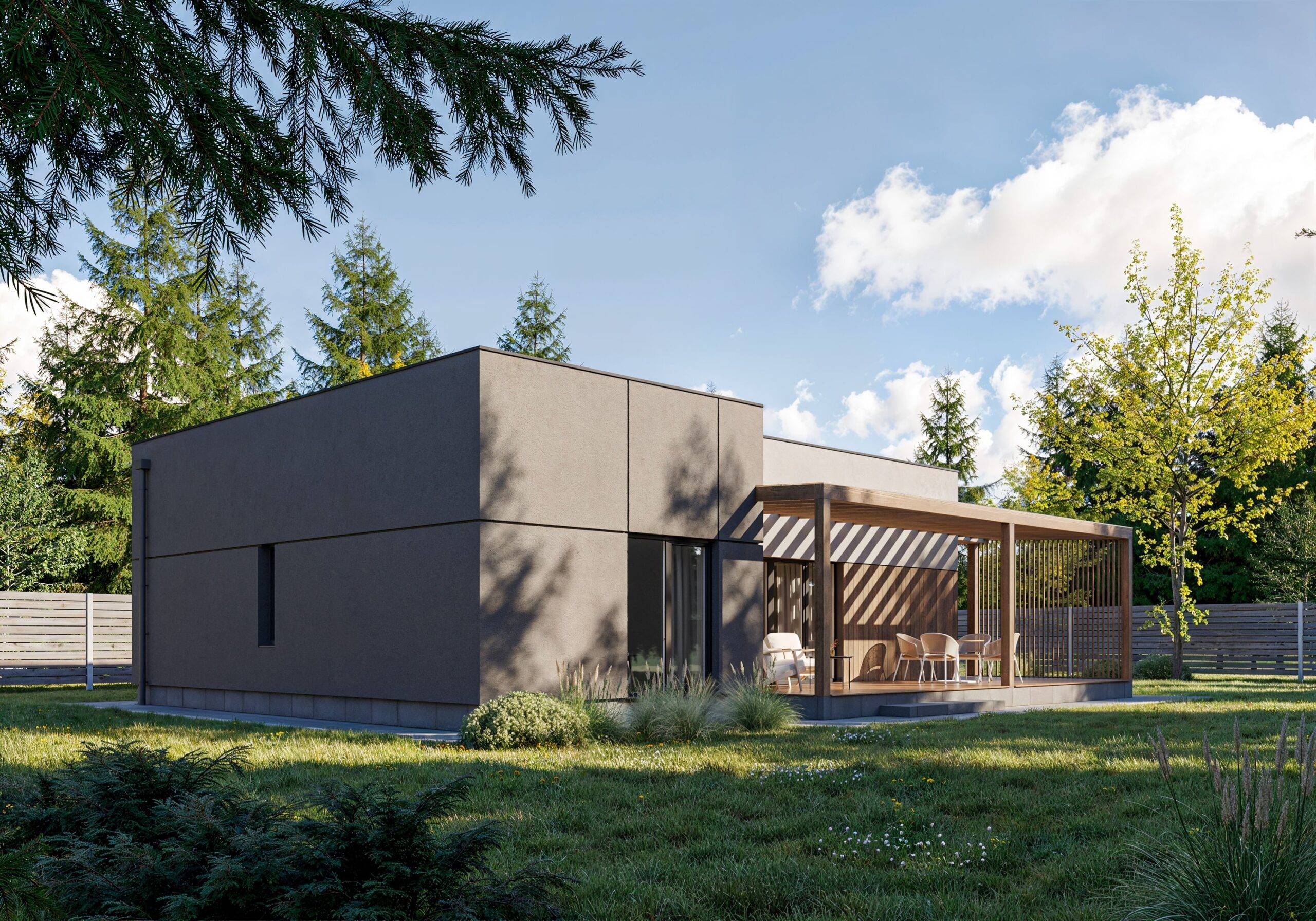 This modern one-story house embodies a stylish minimalist approach. The exterior combines plaster and wooden elements, creating a clean and refined look. The house features a flat roof, a cozy terrace with a wooden pergola, and a carport. A large window in the living room provides a seamless connection between the interior and exterior spaces.