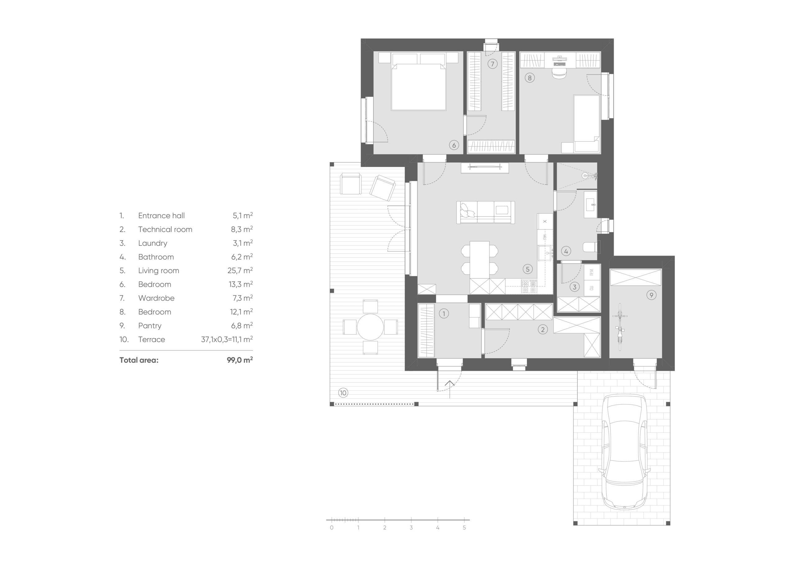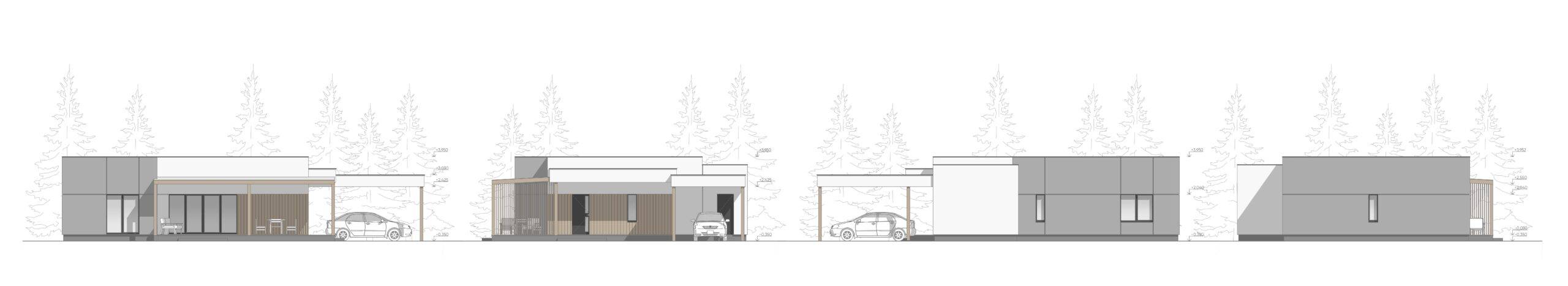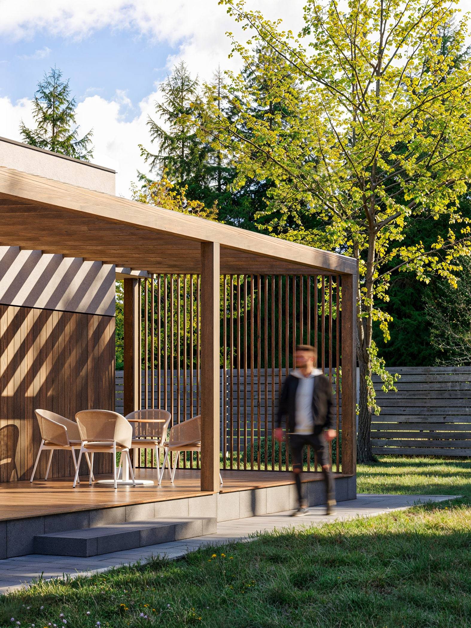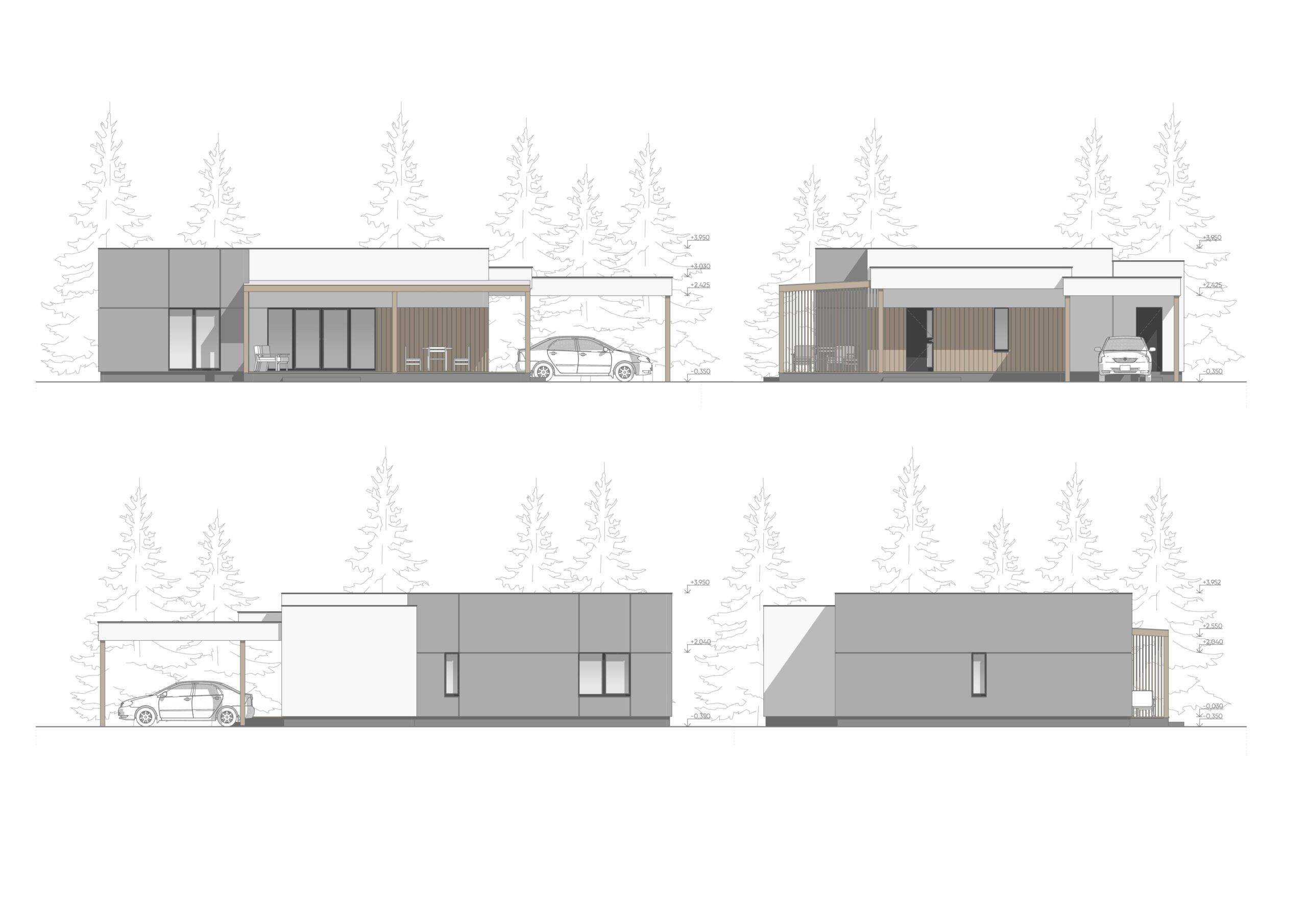 This modern one-story house embodies a stylish minimalist approach. The exterior combines plaster and wooden elements, creating a clean and refined look. The house features a flat roof, a cozy terrace with a wooden pergola, and a carport. A large window in the living room provides a seamless connection between the interior and exterior spaces.