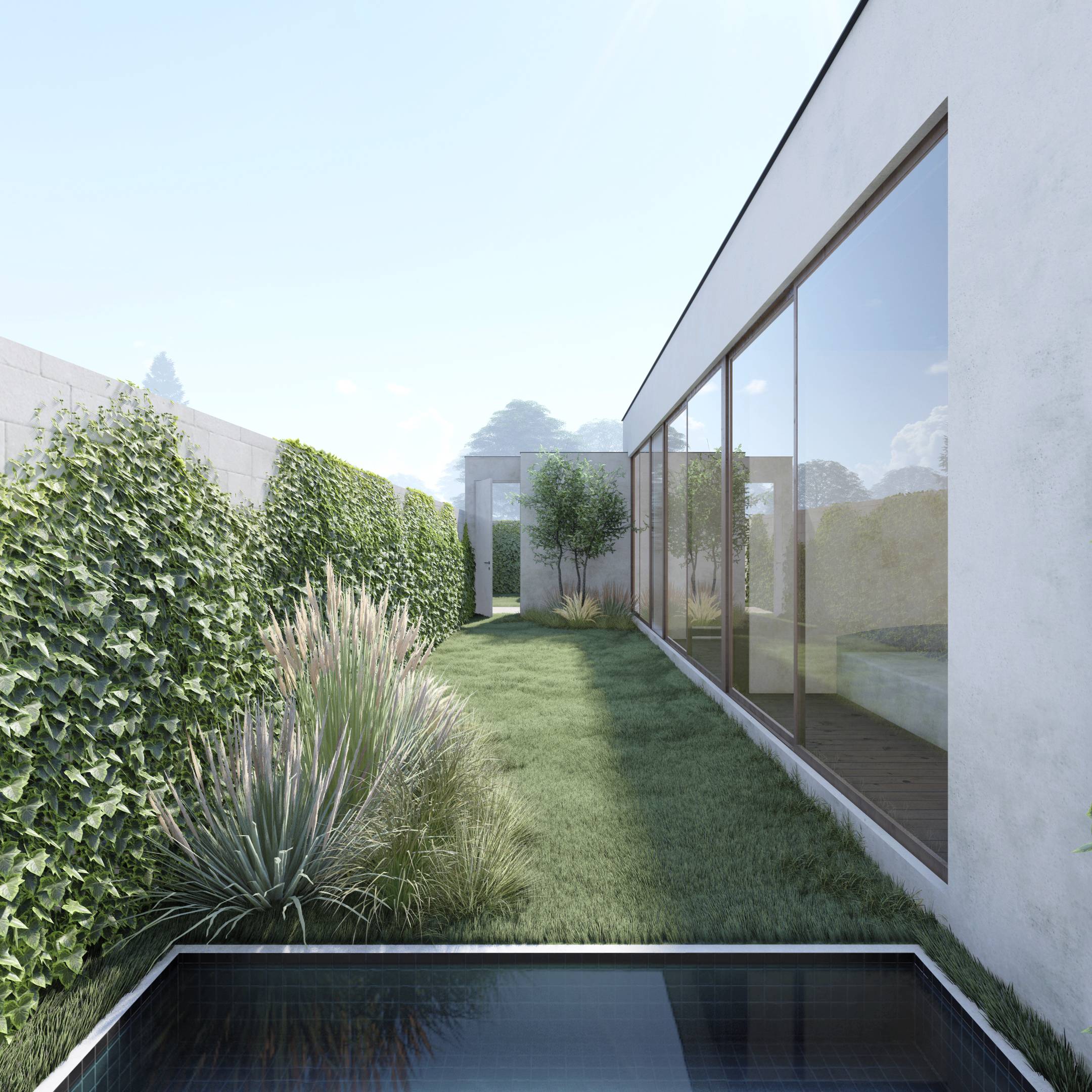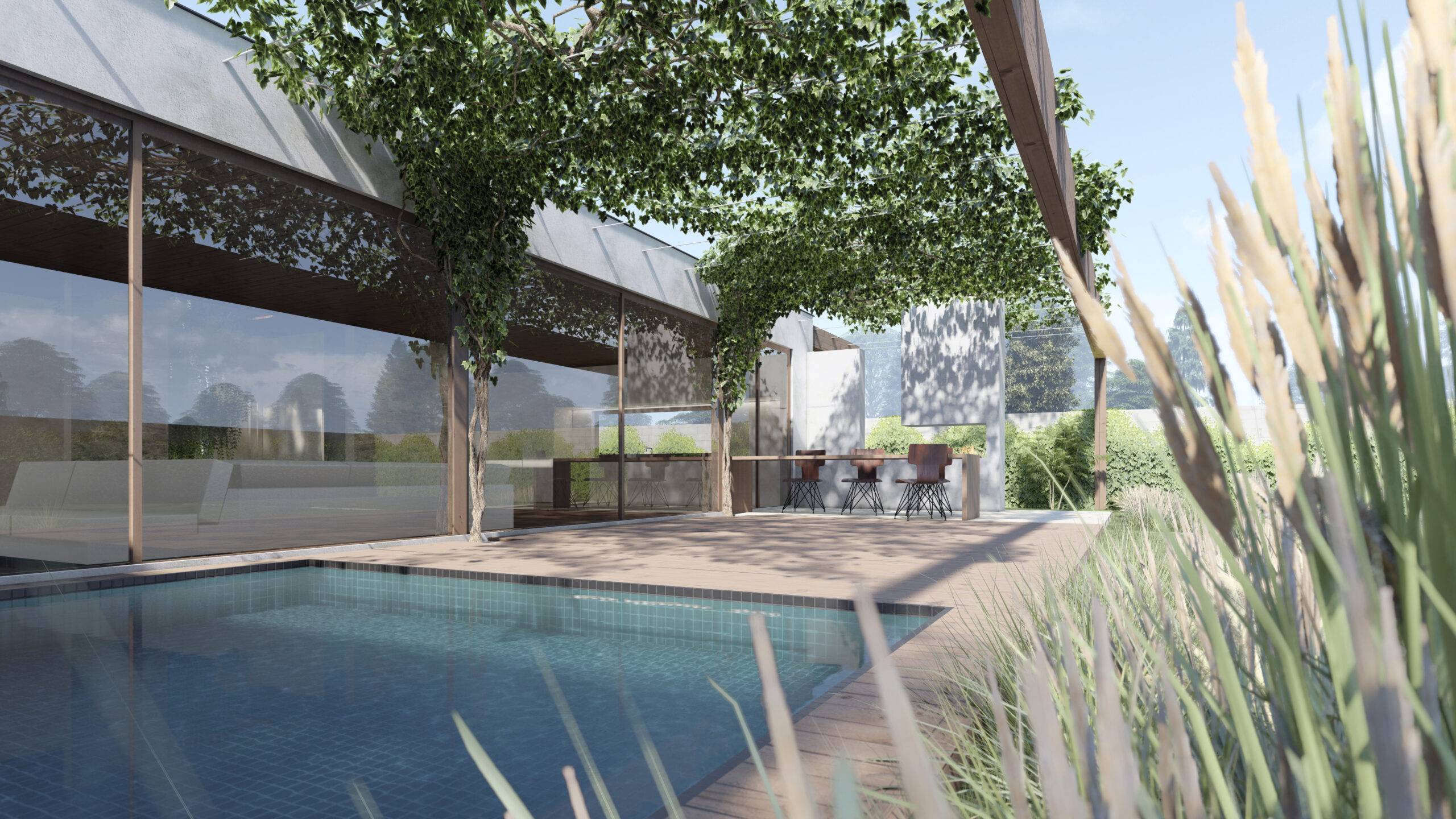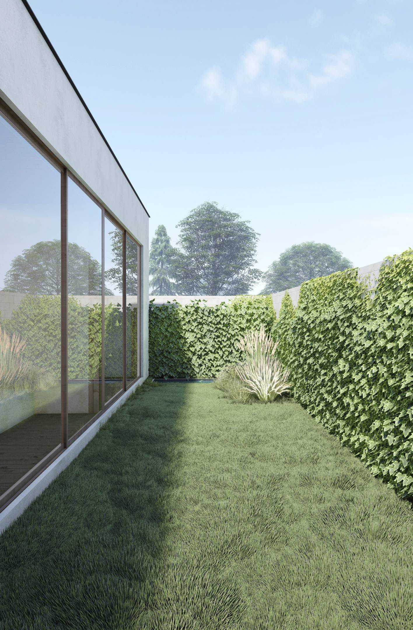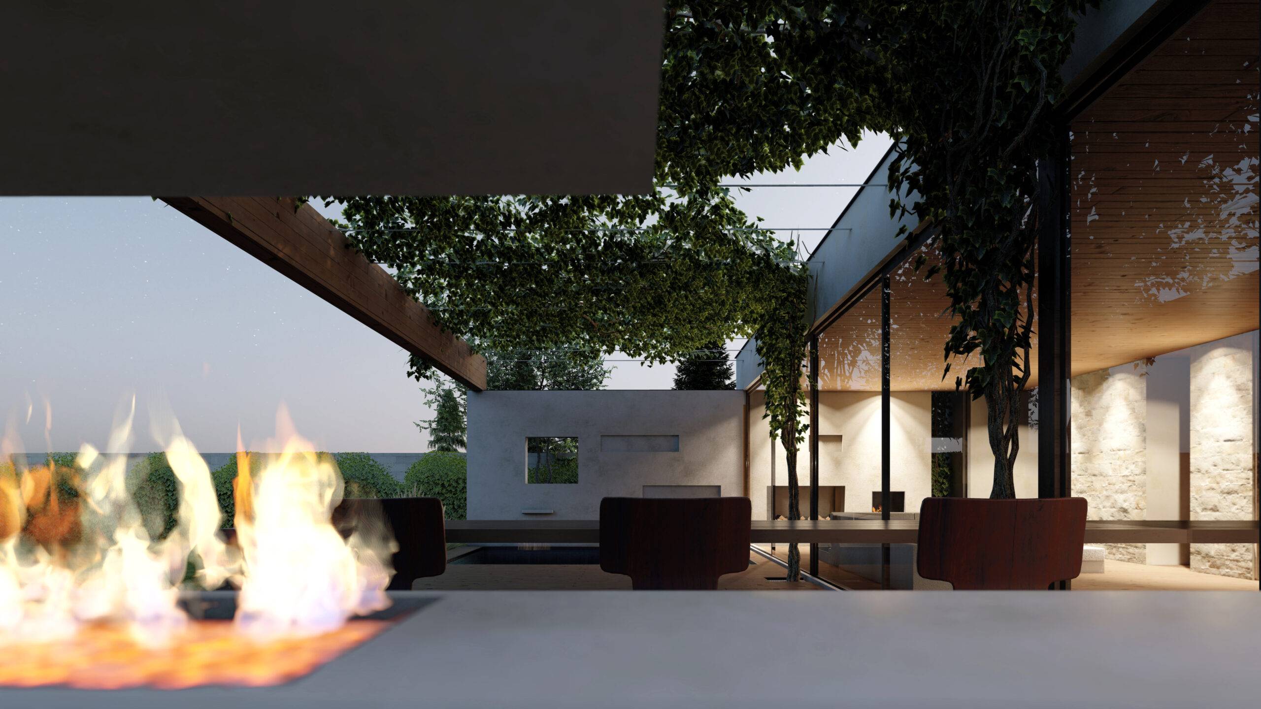 This project is designed to maximize the use of natural light. Wide windows and glass doors allow the sun to shine inside, providing a sense of brightness and space. One of the main features of this house is the winter gardens with trees behind glass. These special areas allow nature to become not just a separate design element but an active participant in the interior, providing additional light and a connection to nature.