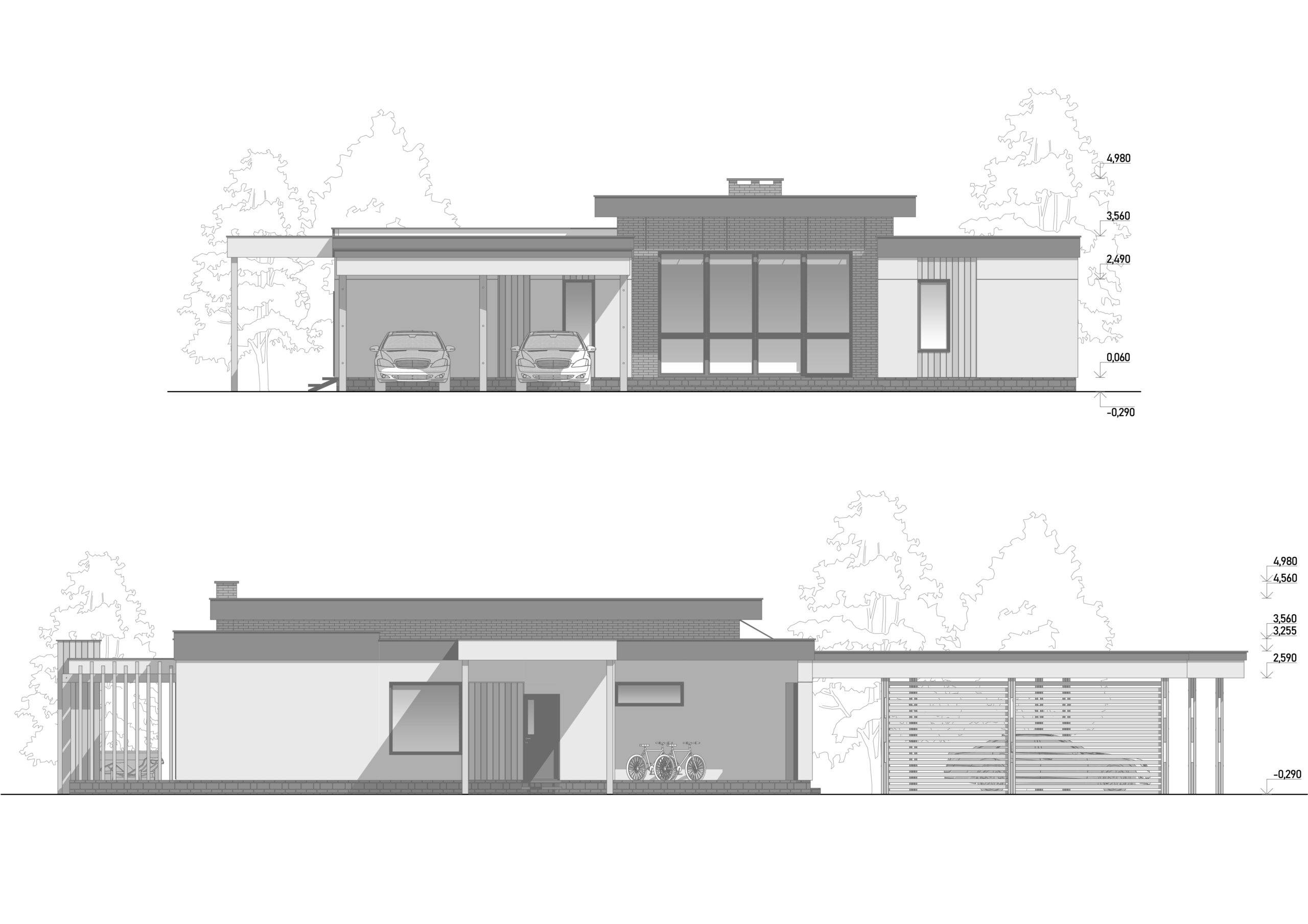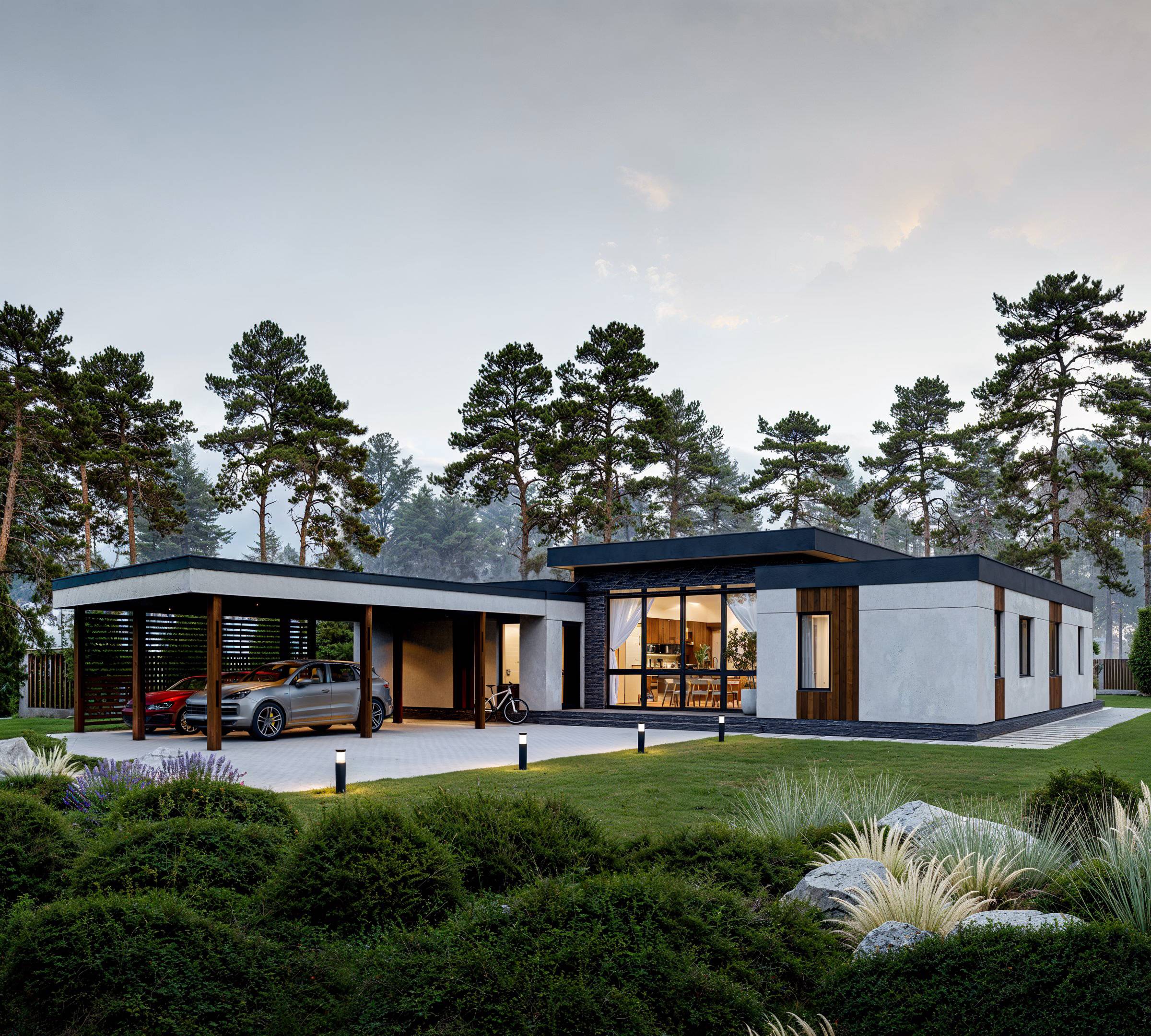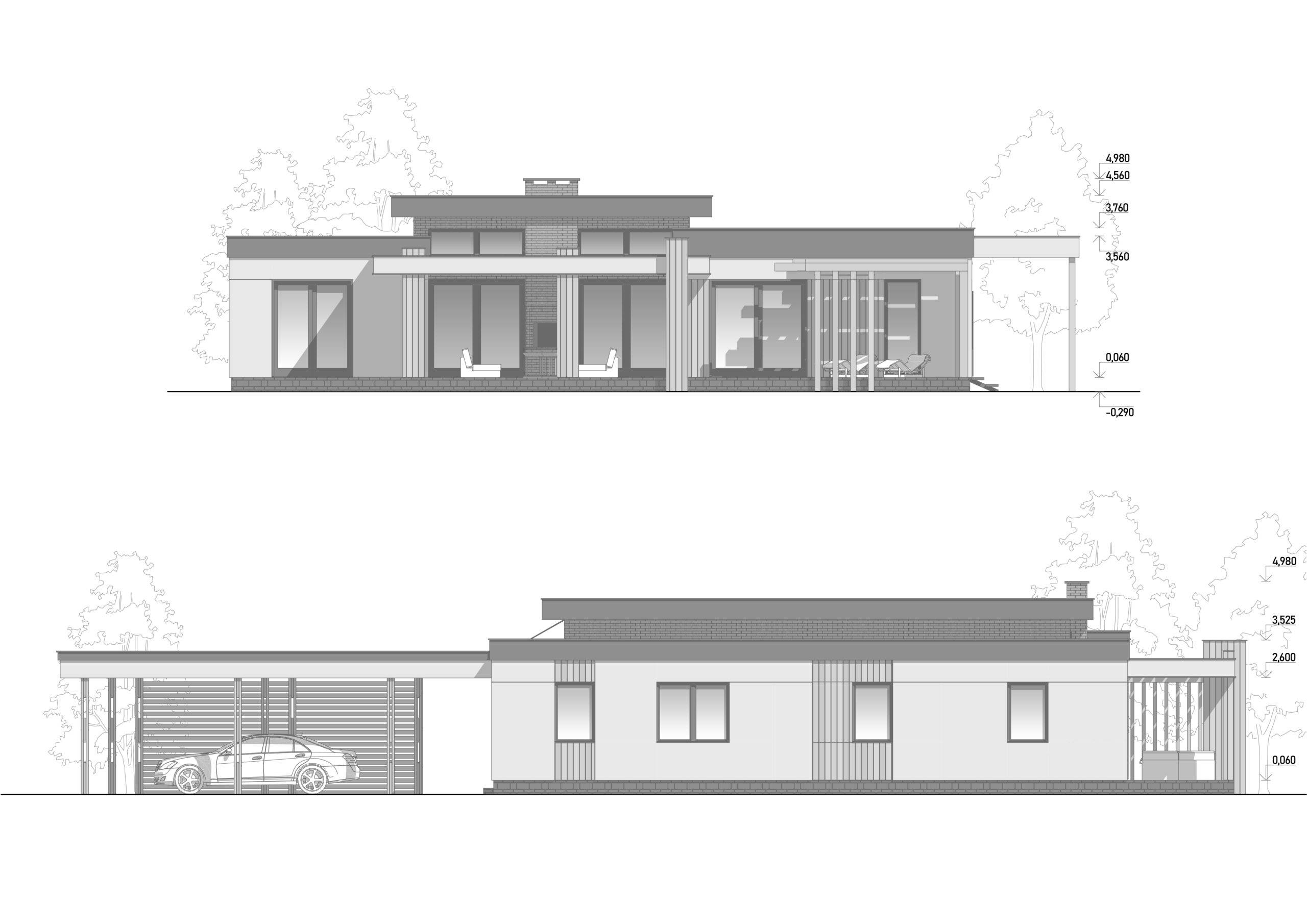 A single-story house of 230 m² was designed for a family with two children. The well-thought-out layout, including all necessary rooms, ensures a comfortable living experience. The focal point of the house is the kitchen-living room with a fireplace area, featuring large panoramic windows that create a sense of lightness and offer a beautiful view of the inner courtyard. The master suite and children’s rooms are separately located, each with its own bathroom and walk-in closets. The technical rooms are grouped together in a separate area with an additional entrance from the street. The varying ceiling heights, terraces, and a carport contribute to the house’s unique and distinctive appearance.