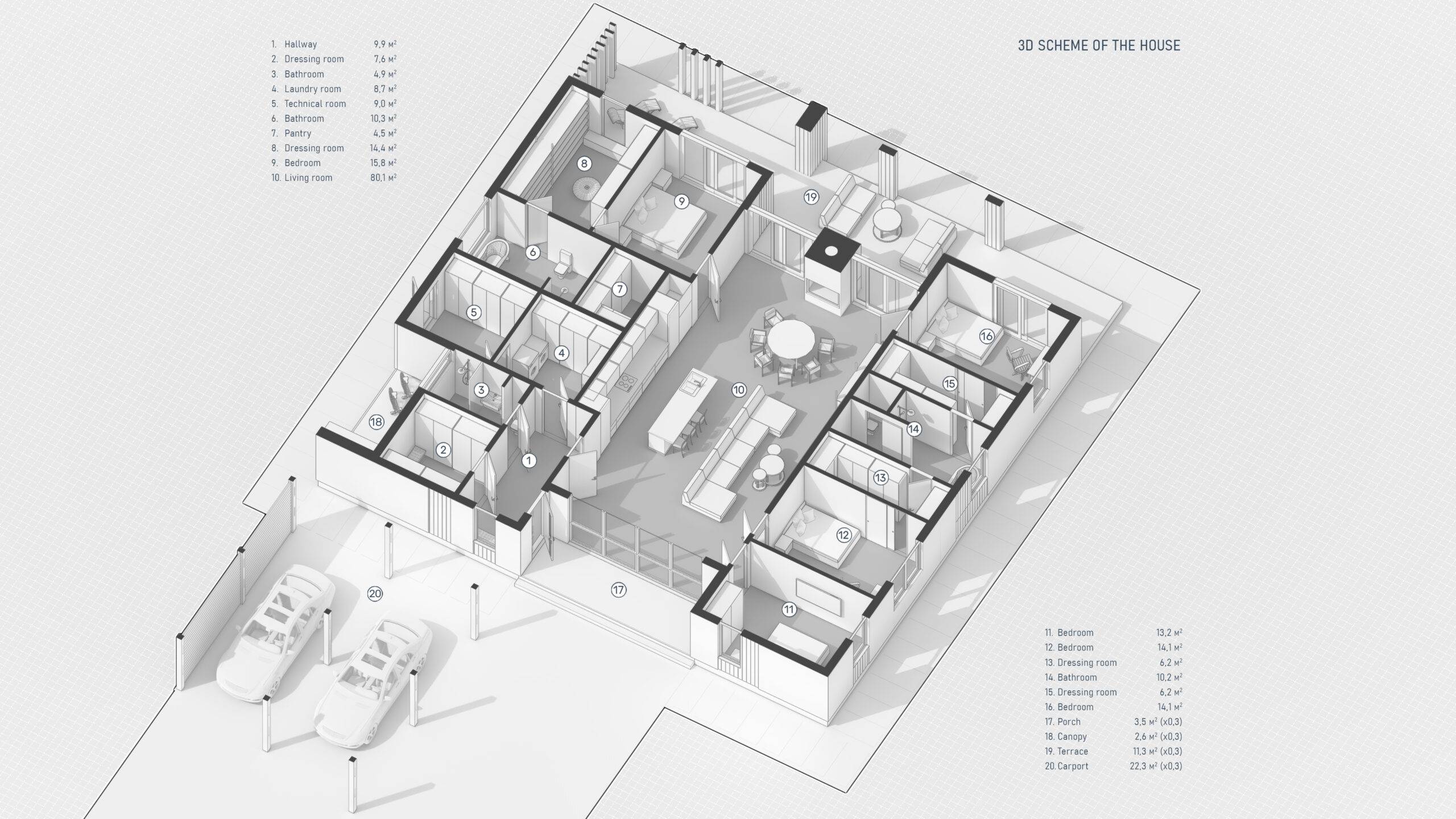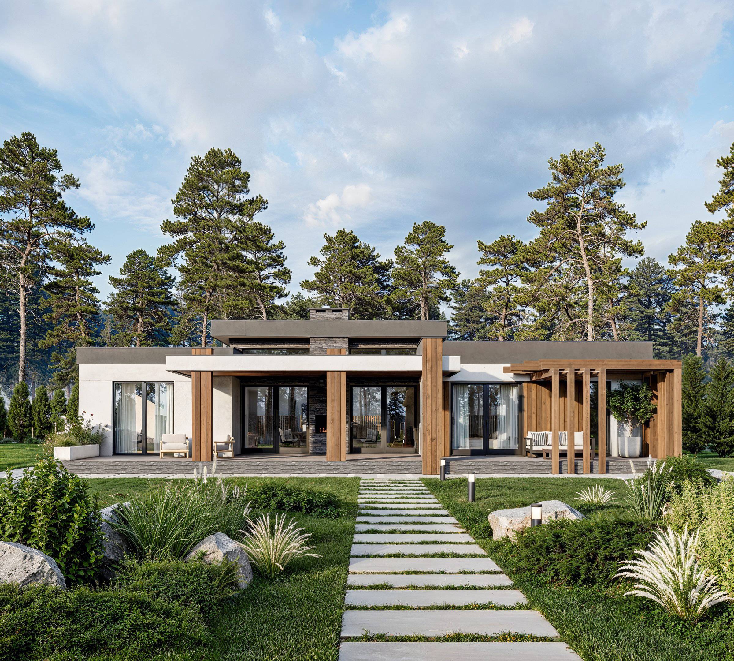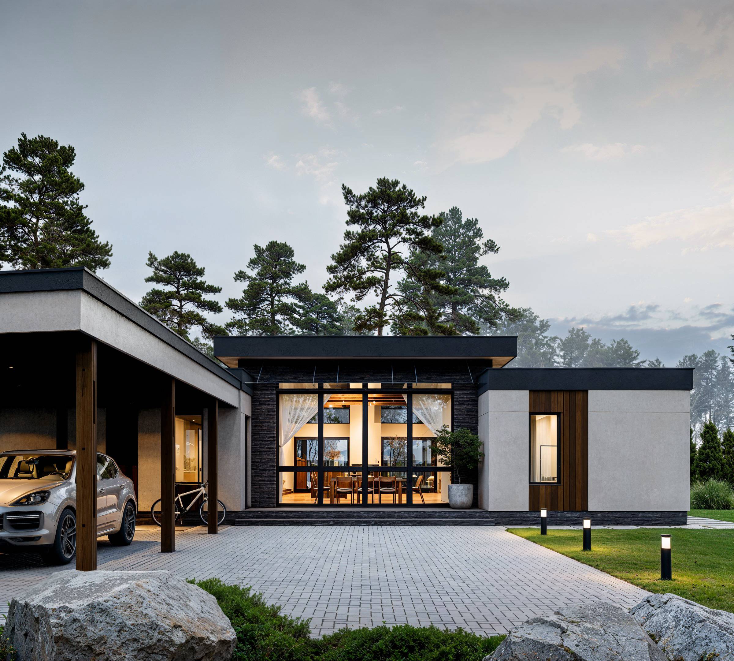 A single-story house of 230 m² was designed for a family with two children. The well-thought-out layout, including all necessary rooms, ensures a comfortable living experience. The focal point of the house is the kitchen-living room with a fireplace area, featuring large panoramic windows that create a sense of lightness and offer a beautiful view of the inner courtyard. The master suite and children’s rooms are separately located, each with its own bathroom and walk-in closets. The technical rooms are grouped together in a separate area with an additional entrance from the street. The varying ceiling heights, terraces, and a carport contribute to the house’s unique and distinctive appearance.