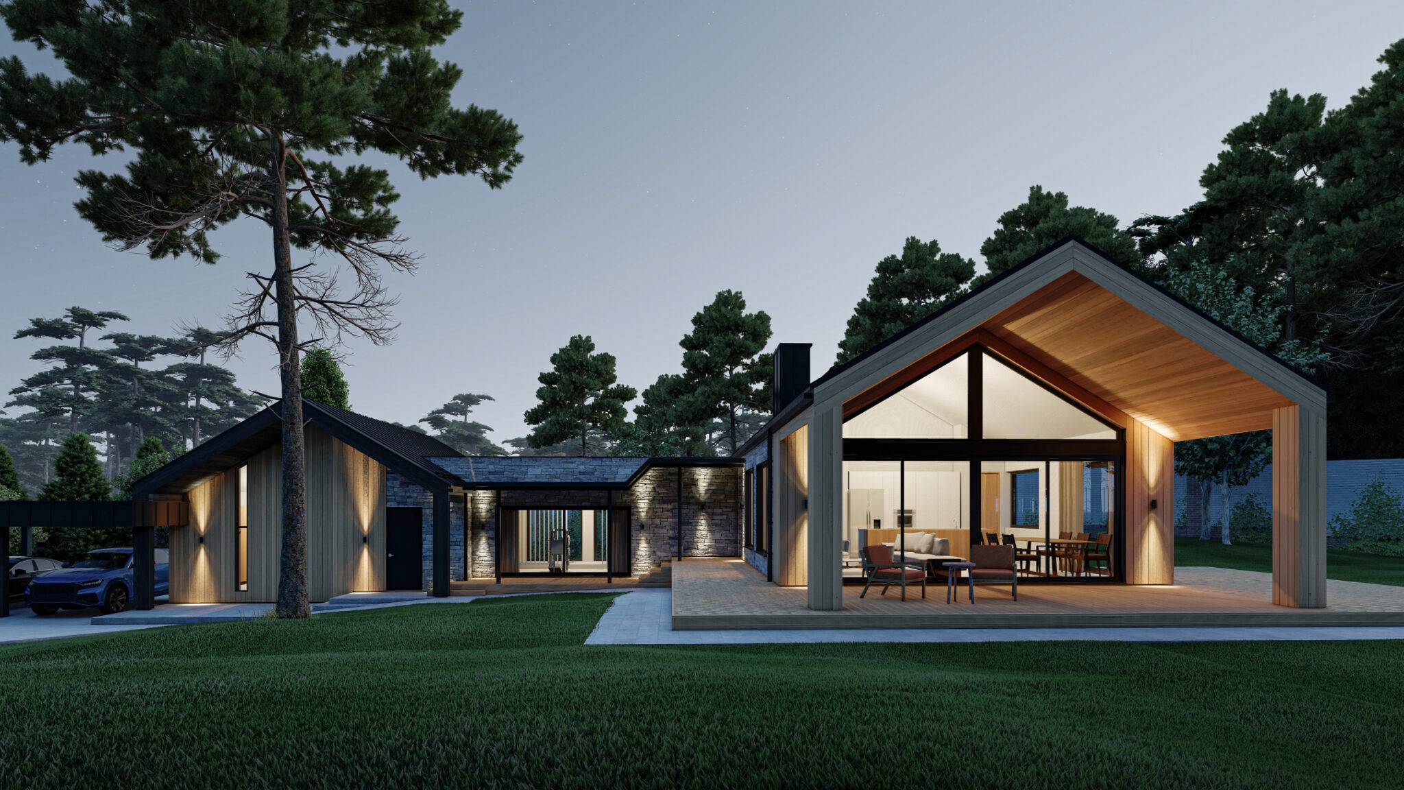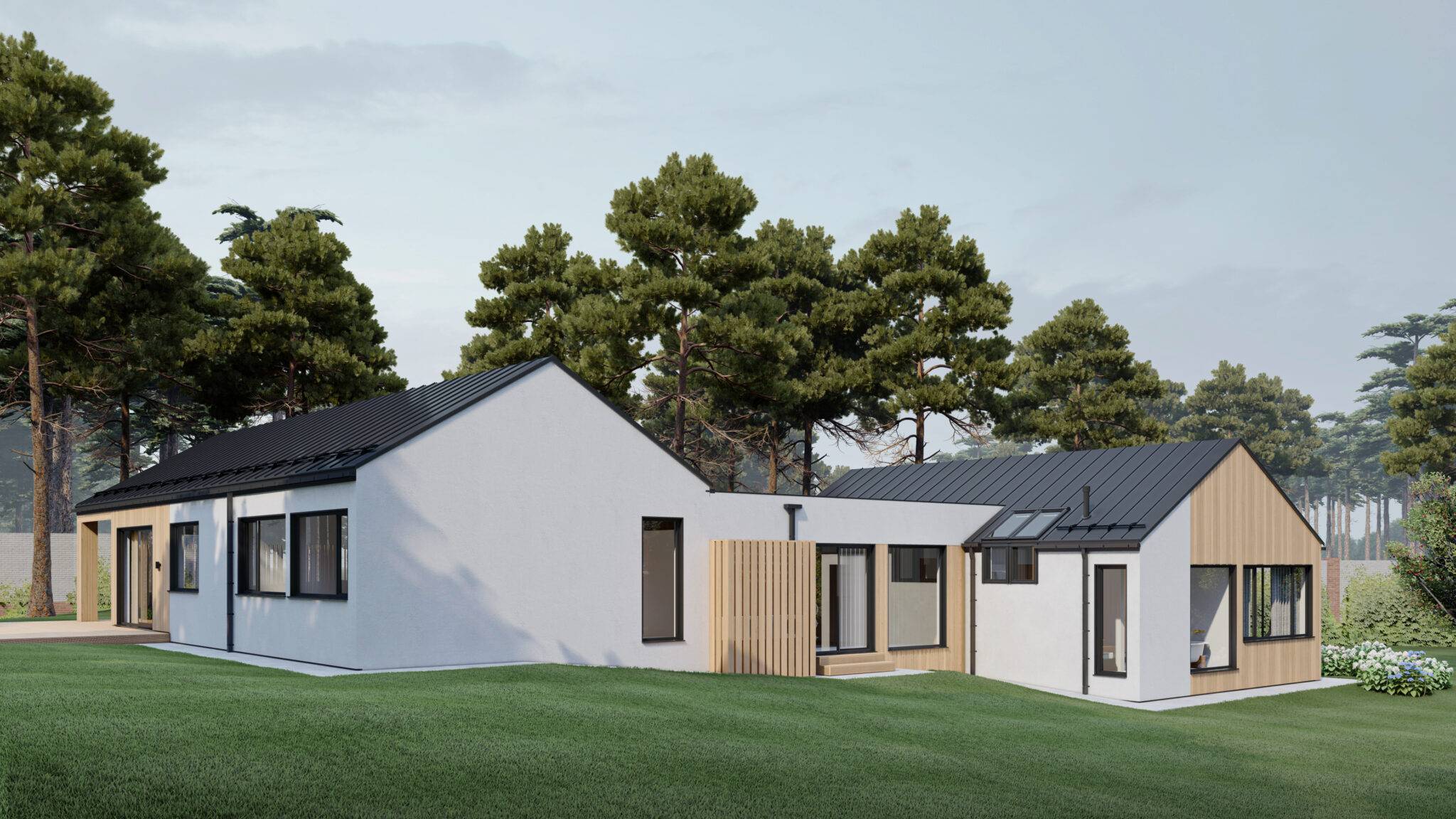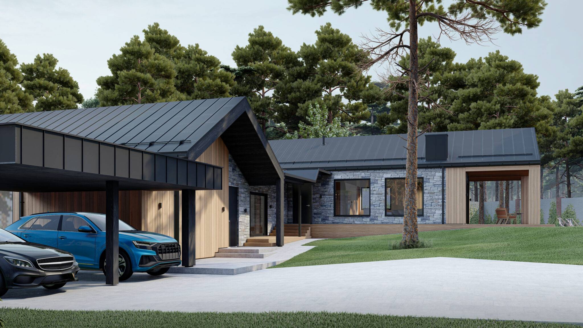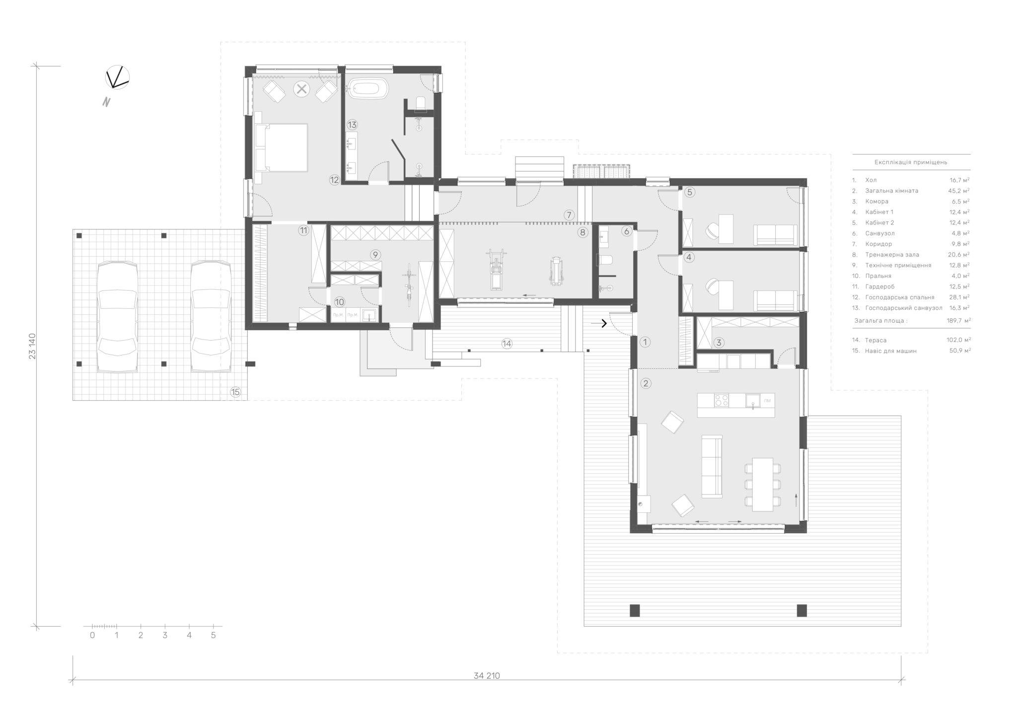 A large private house for a young couple. Conditionally, it can be divided into 3 zones – master bedroom zone, gym, recreation zone. The house has 1 bedroom, 2 offices (which can be used as guest rooms), 2 bathrooms, a wardrobe, a technical unit, a gym and a living room. There is a carport for two cars near the house.