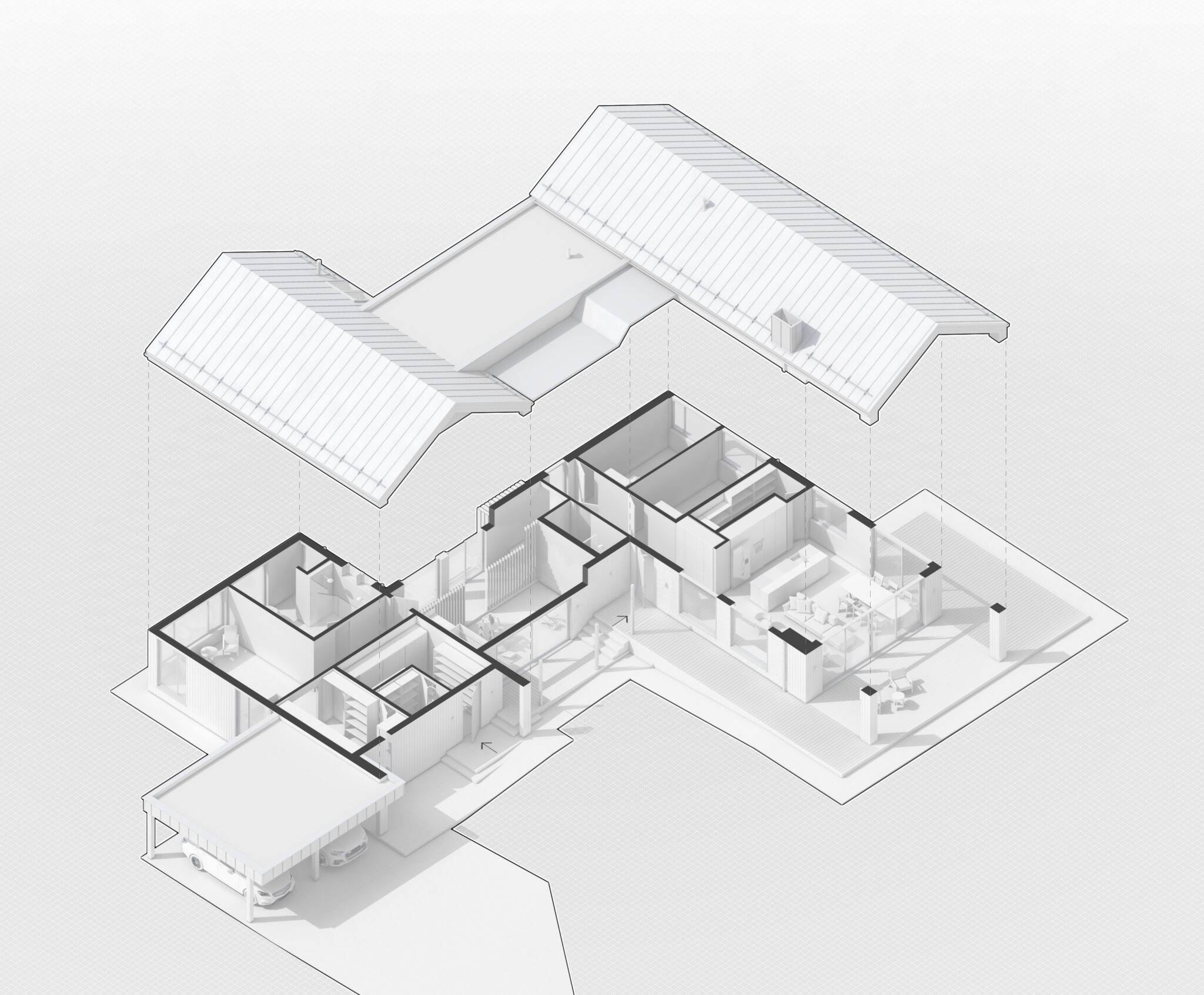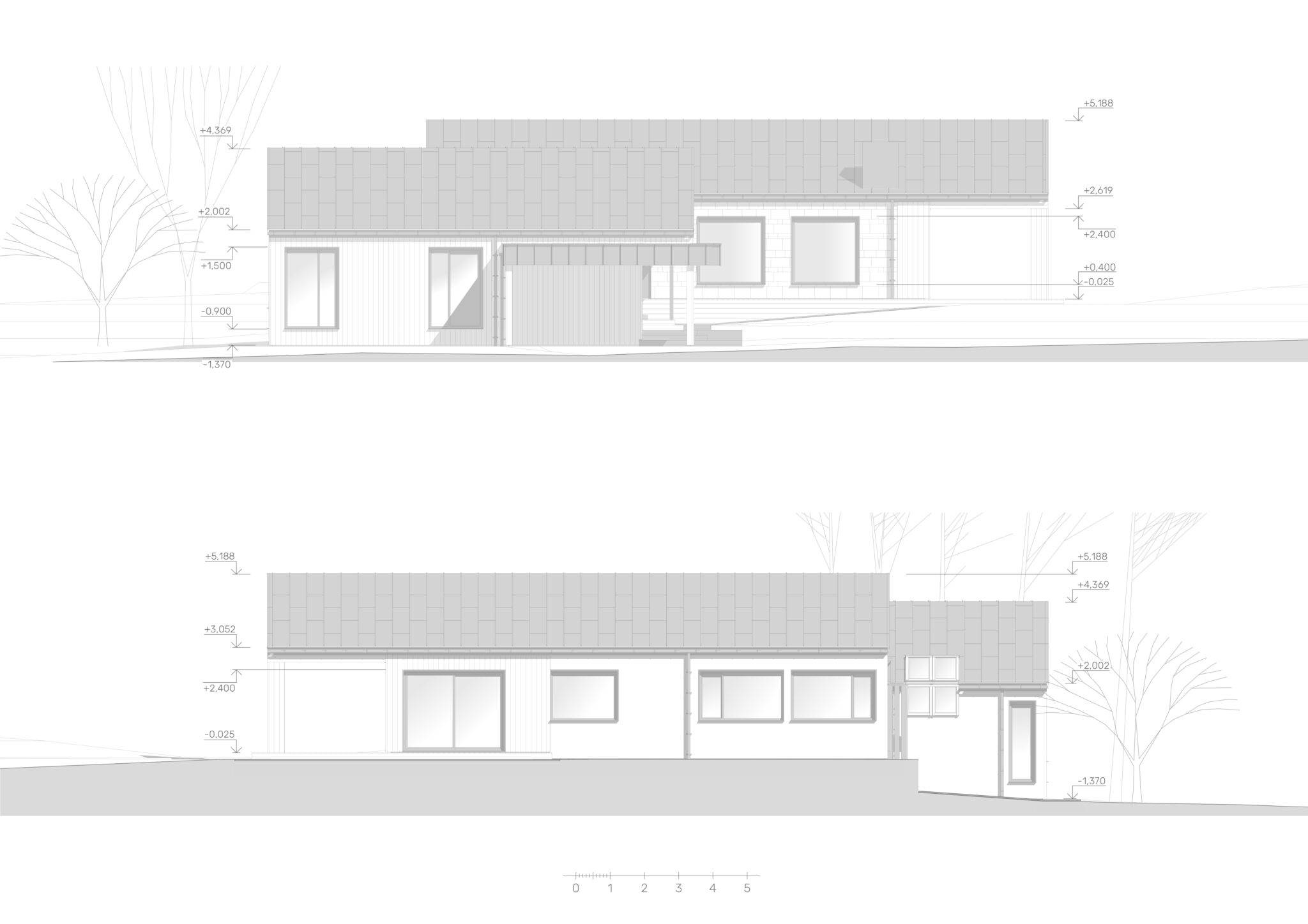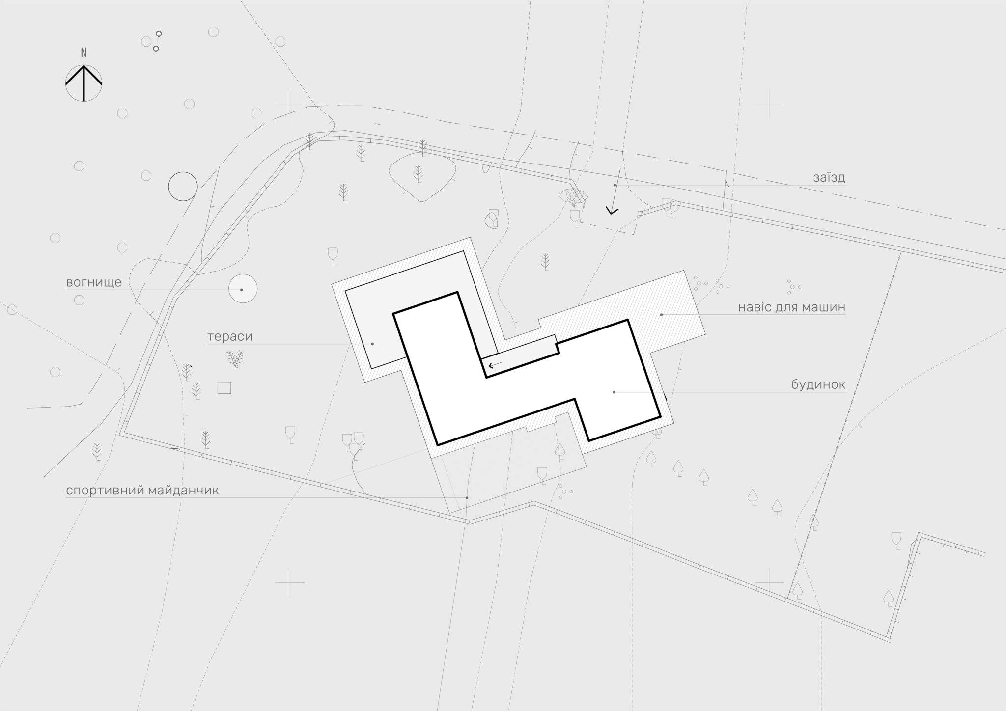 The passage to the main entrance is made through a small terrace, which is connected to the main terrace. A fire pit and gardens are planned on the territory. The site is filled with existing trees that have been preserved. The landscape of the site, the function of the house and the viewpoints contributed to the formation of the house.