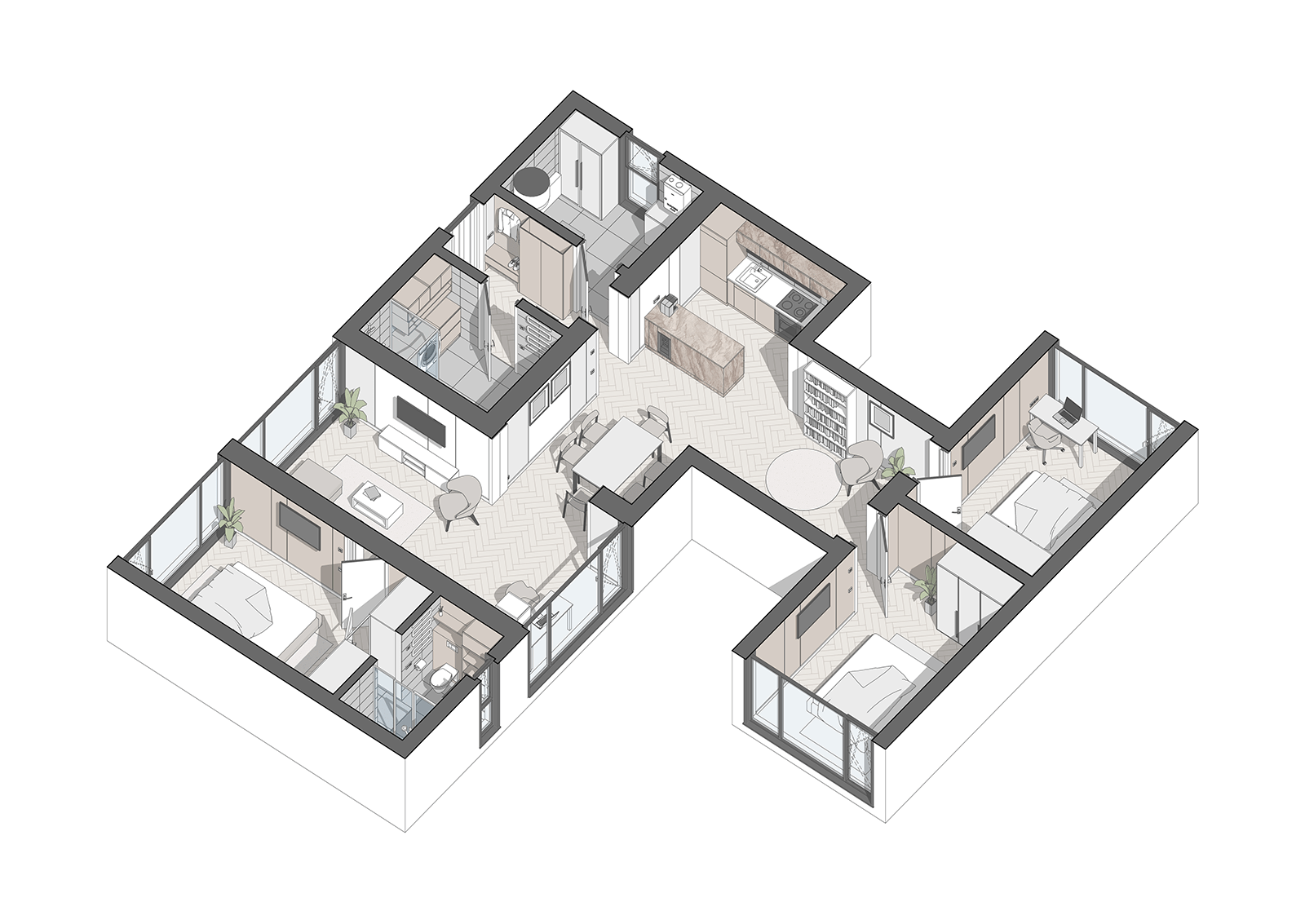 – Centre zone: spacious kitchen, dining and living room, creating a comfortable space for family and guests.