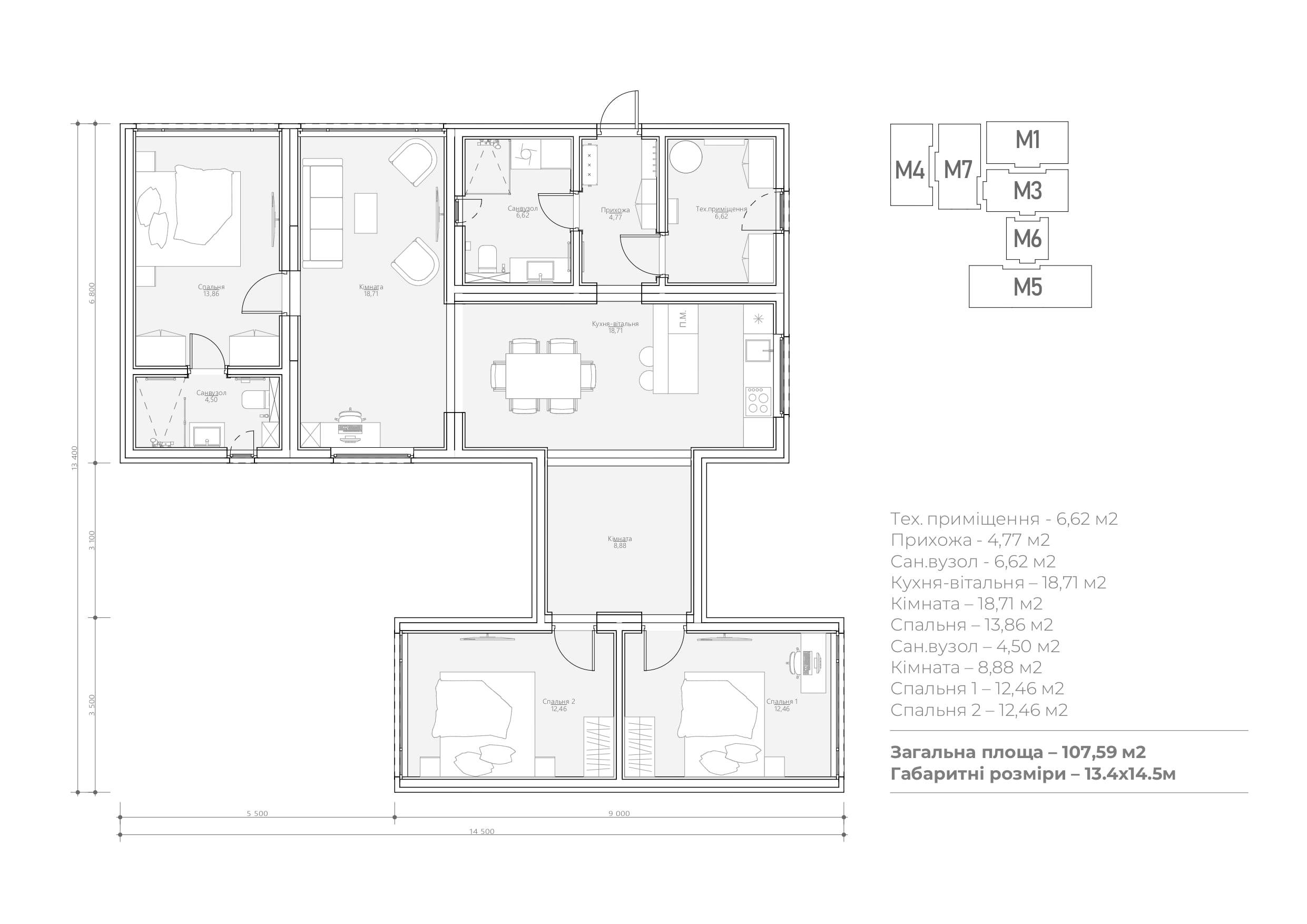 The total area of 107.59 m² allows you to comfortably accommodate the whole family and guests.