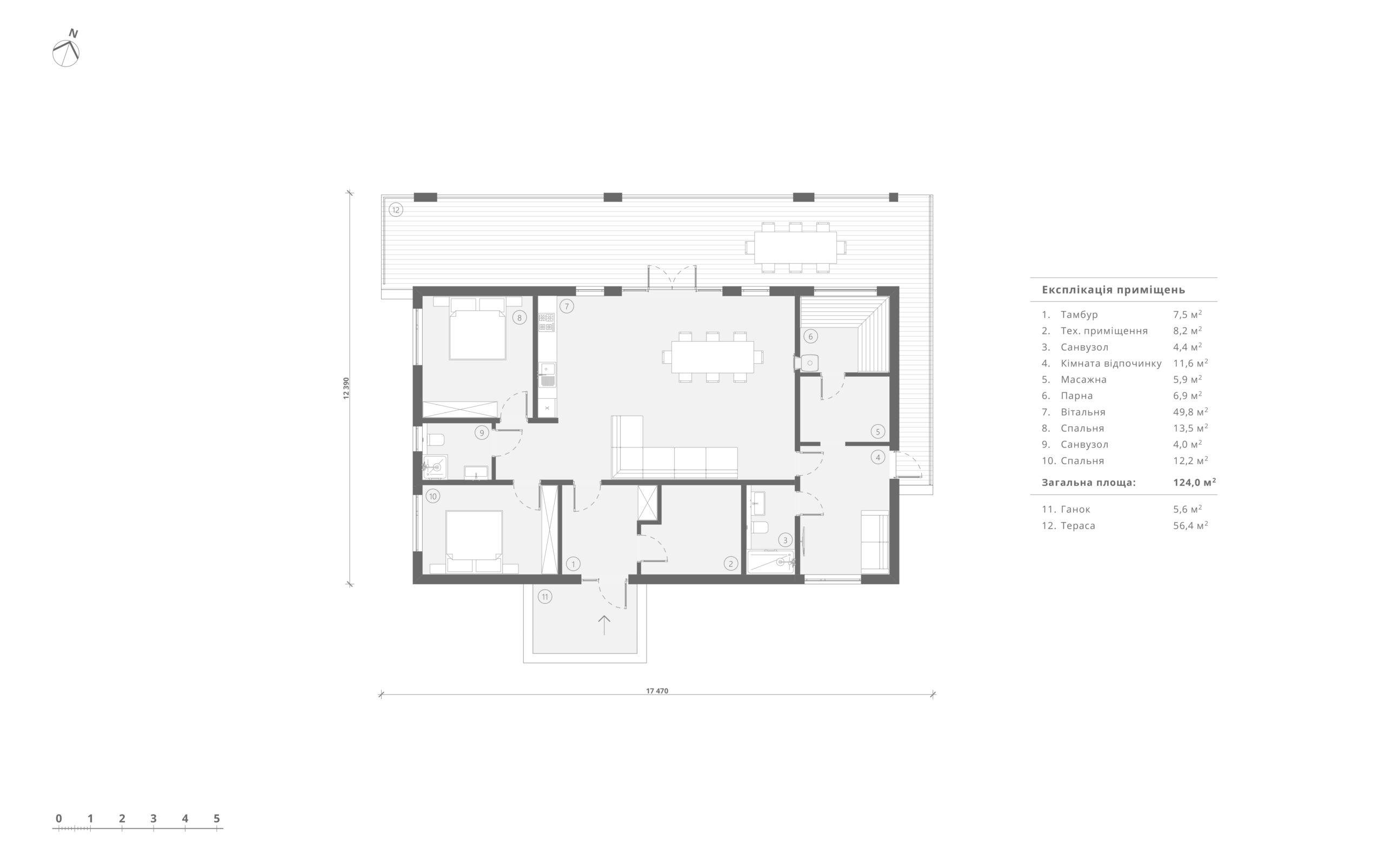 Просторий гостьовий будинок-СПА біля водойми загальною площею 142,6 м.кв. Тут можна знайти простору вітальню з невеликою зоною кухні та зоною відпочинку з каміном, де можна зібрати всіх гостей разом. Крім того в цьому будинку є дві гостьові спальні на 12 і 13 м.кв, тож він виконує функцію ще й гостьового будинку. Зона спа поділяється на парну – 7 м.кв., масажну кімнату – 6 м.кв., та кімнату відпочинку на 11,6 м.кв. де можна перепочити. Особливістю цієї бані є велика терраса прямо над річкою, де можна споглядати закат та великою компанією проводити час.