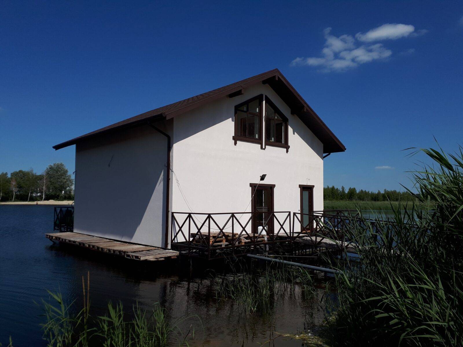 Цей ексклюзивний проект реалізований компанією ЕКОПАН в Київській обл. Про будинок біля озера не мріяла хіба що людина, геть позбавлена фантазії. Але вдома на воді – інша справа. Зробити такий вибір може тільки людина непересічна. Такому будинку потрібно відповідати: бути трохи бунтівником, натурою тонкою і творчою, незалежно від того, чим ви в житті займаєтеся.