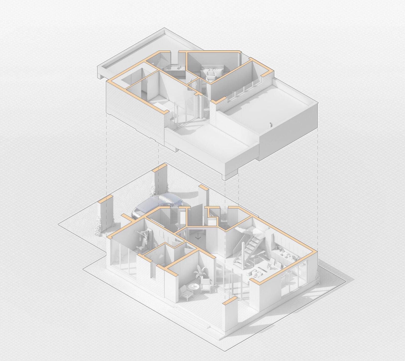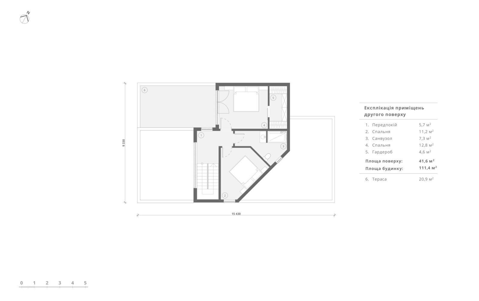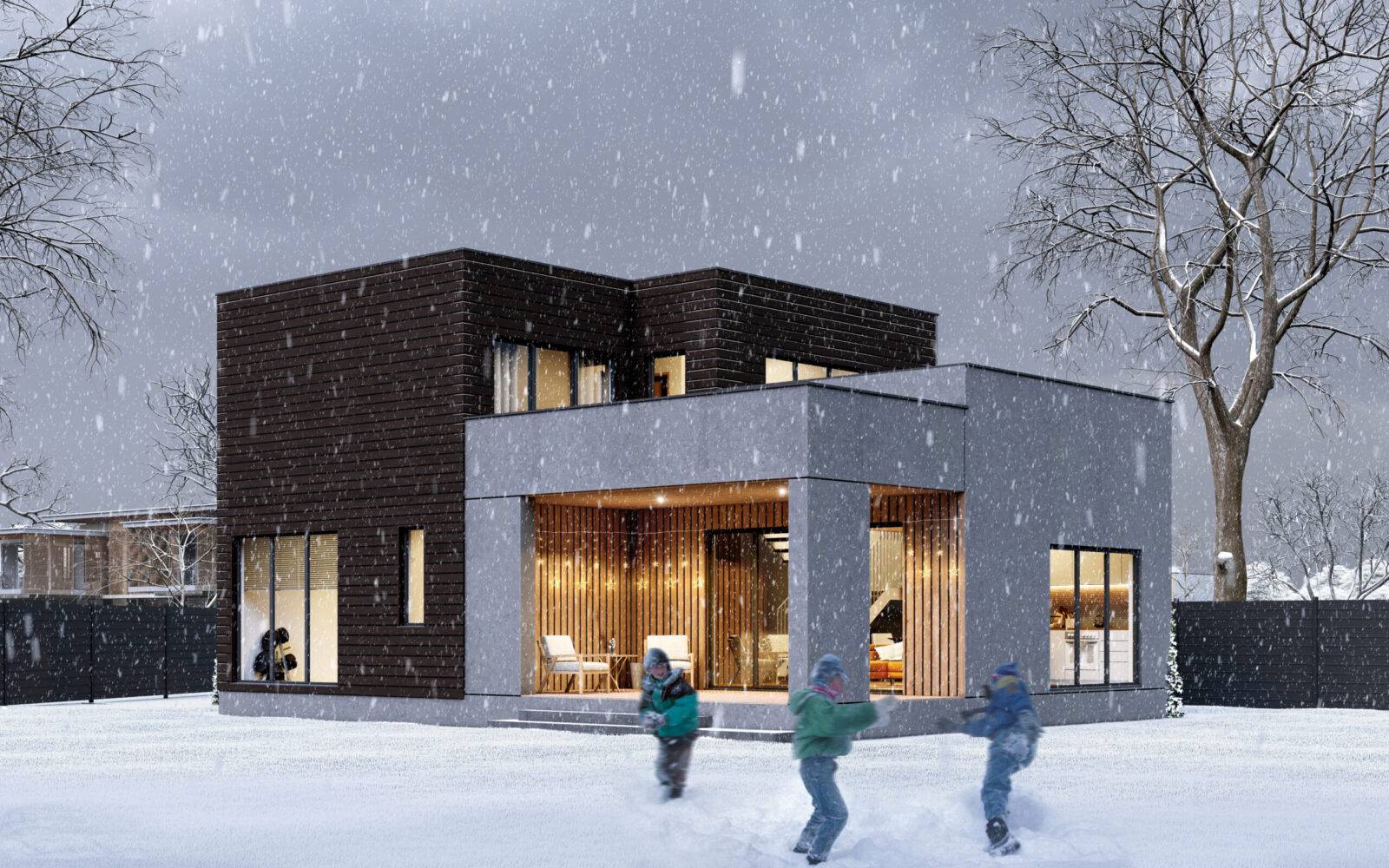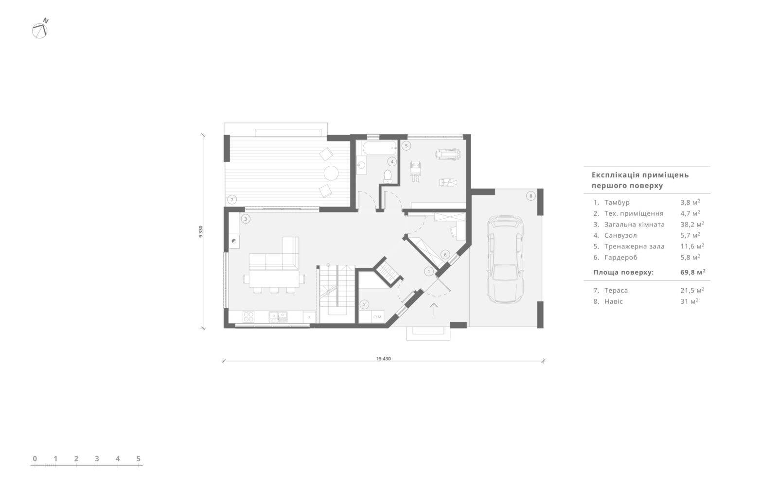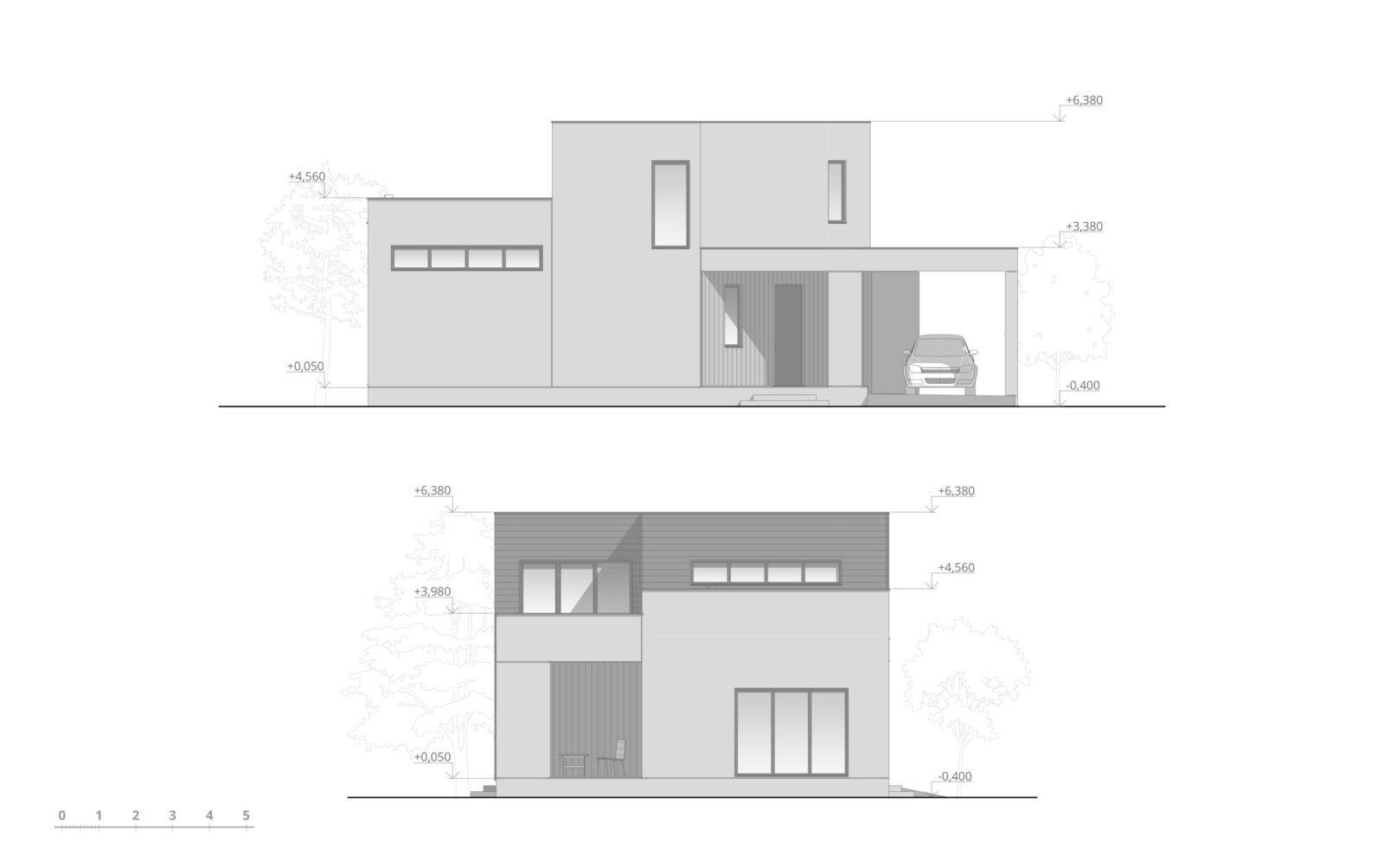 Компактний двоповерховий житловий будинок. Стримана динаміка форми будинку продиктована різним об’ємом приміщень. Будинок умовно можна поділити на три зони – зона спальних та допоміжних приміщень, зона основної кімнати та зовнішні зони (тераси та навіси). Основне приміщення (38м.кв.) в висоті стелі має 3,8м, в ній розміщена повноцінна кухня, великий обідній стіл, що розділяє приміщення на кухню та зону відпочинку, камін. З цього приміщення виходимо на основну терасу (22 м.кв.) з видом на внутрішній дворик. Висота решти приміщень будинку – 2,8м. На першому поверсі розташовані технічні приміщення, спортзал (12 м.кв.), гардероб (6 м.кв.) і санвузол (6 м.кв.). Другий поверх – зона спалень. Тут розміщені дві спальні (11 та 12 м.кв.) і санвузол (7 м.кв.). З холу та мастер спальні є вихід на другу терасу (21 м.кв.). У будинку велика кількість вікон різної форми та орієнтації, тому будинок завжди змінює свою освітленість в залежності від руху сонця протягом дня. Навіс для машини (31 м.кв.), що розміщений поряд з вхідною групою дозволяє комфортно пересуватися навіть в непогоду. Будинок забезпечує комфортне перебування в ньому і не займає більшу частину ділянки (0,06 га). Не прямокутна форма будинку, поєднання матеріалів і кольорів створю різноманітність образів будинку в залежності від розміщення глядача.
