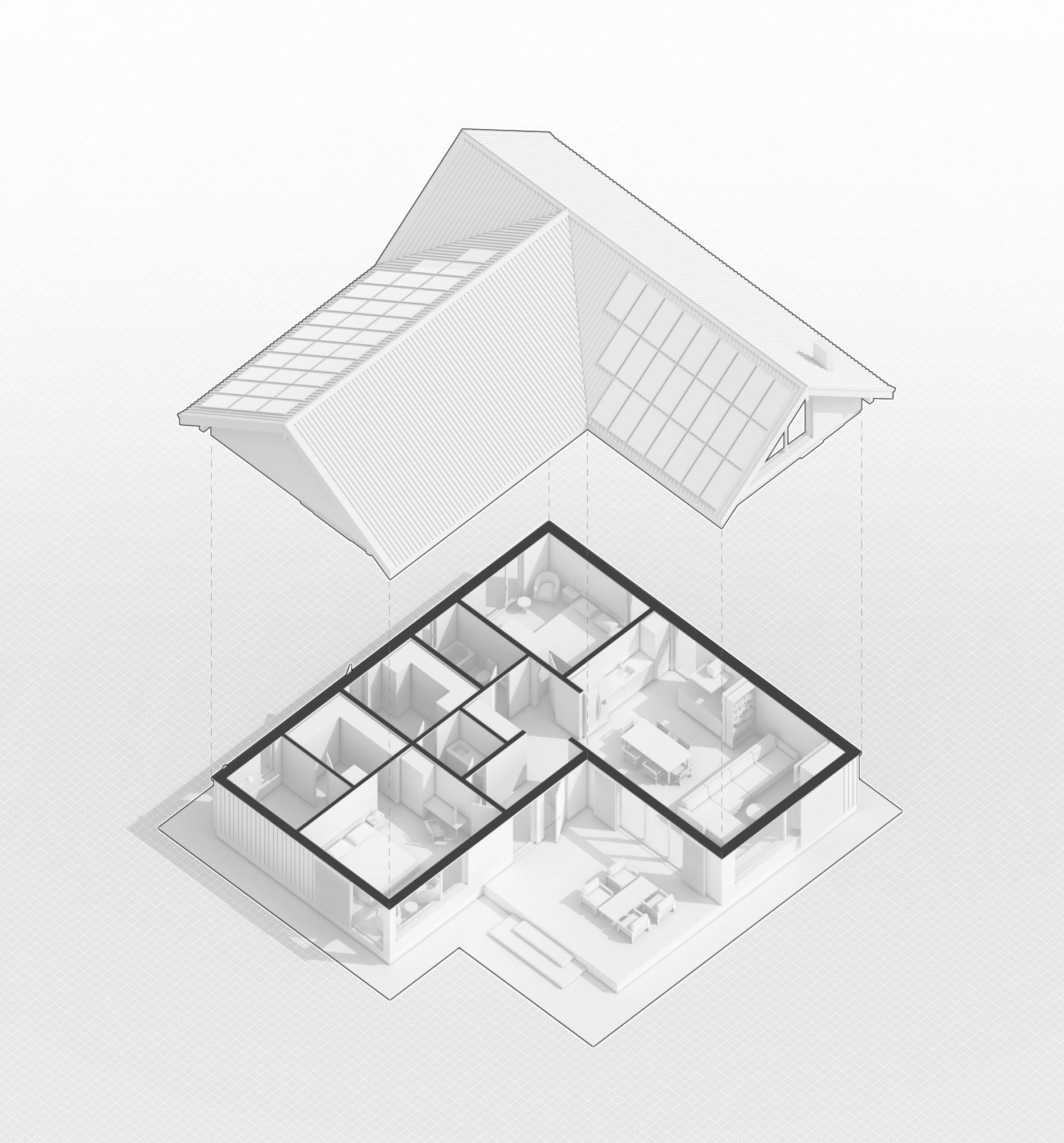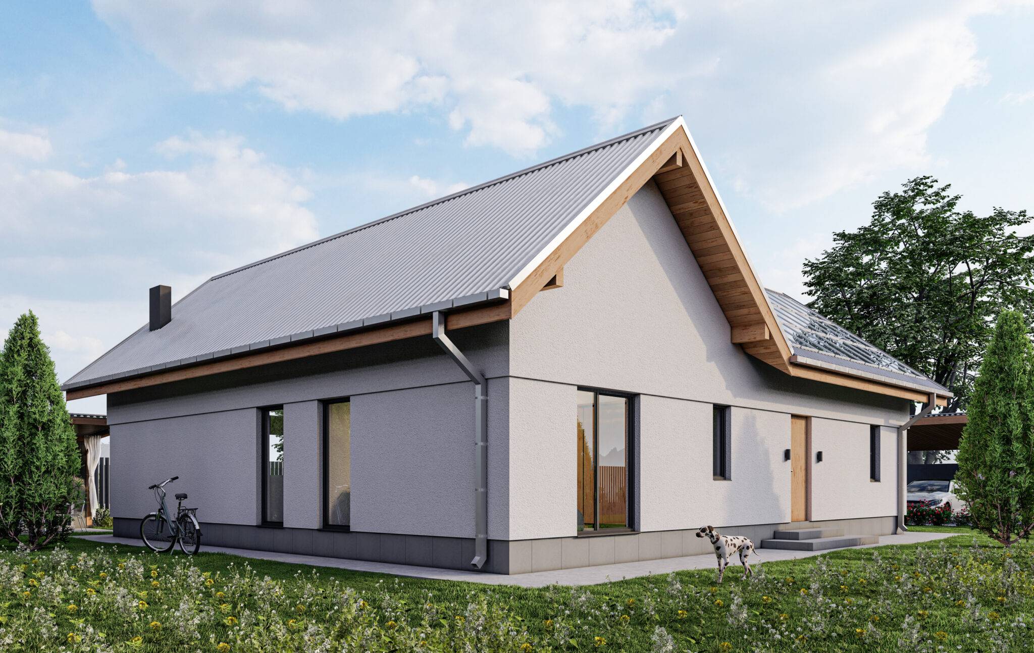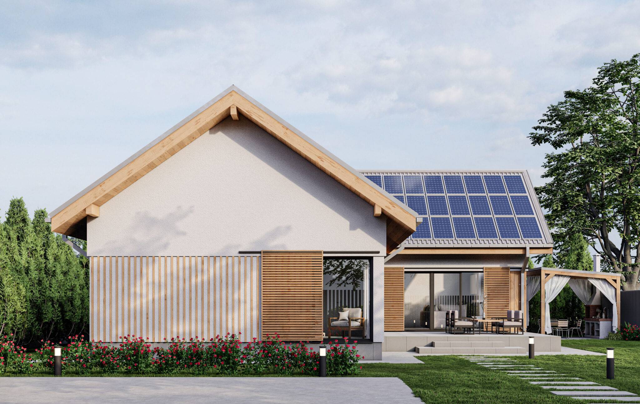 Основною відмінністю цього проєкту є відкрита тераса, яка також слугує ганком. Ми вирішили розмістити будинок в задній частині ділянки, щоб основна територія виходила до вулиці. При вході розмістили навіс для машин та господарську будівлю, а збоку альтанку з зоною барбекю.