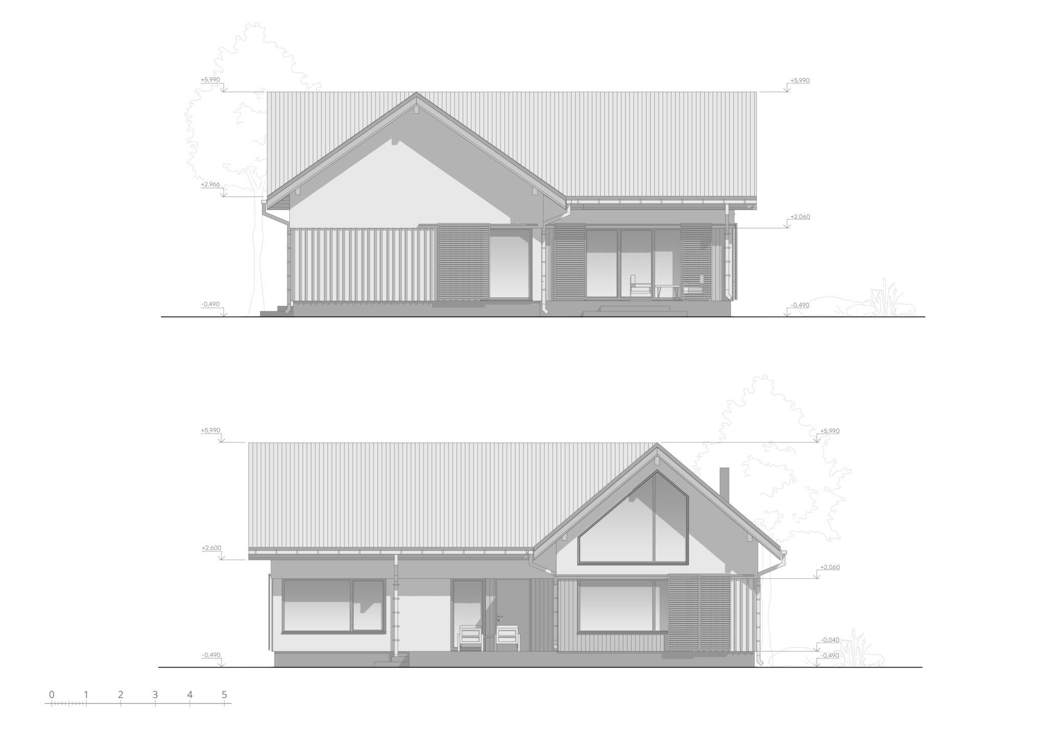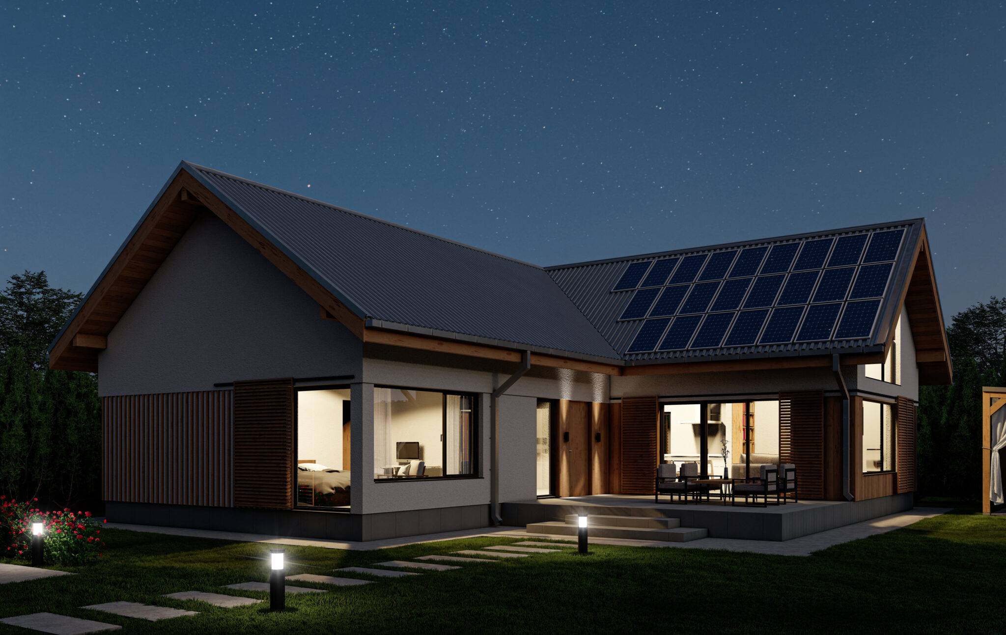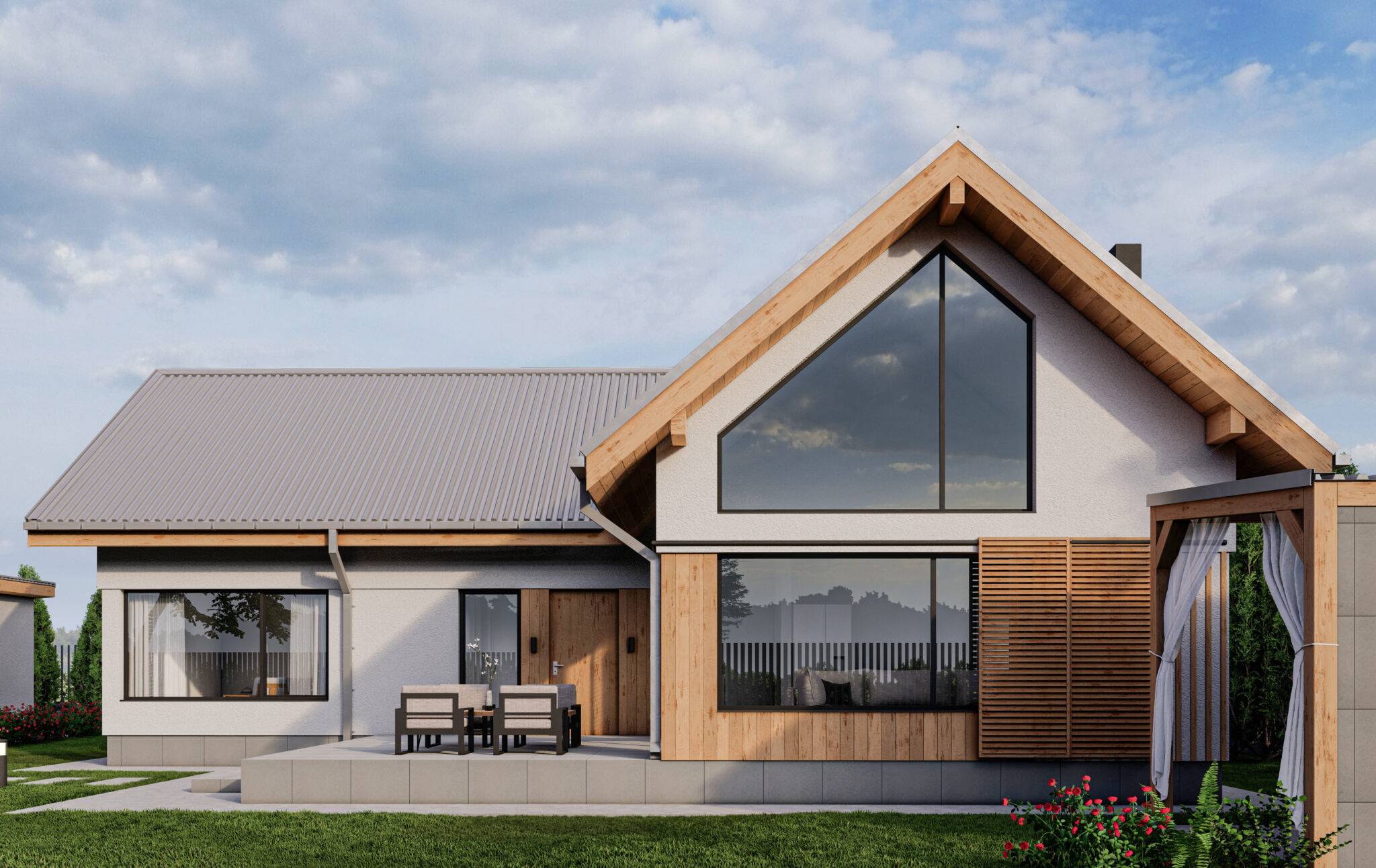 Проєкт розроблявся для західних регіонів України, тому ми обрали таку форму даху, палітру кольорів та матеріалів.