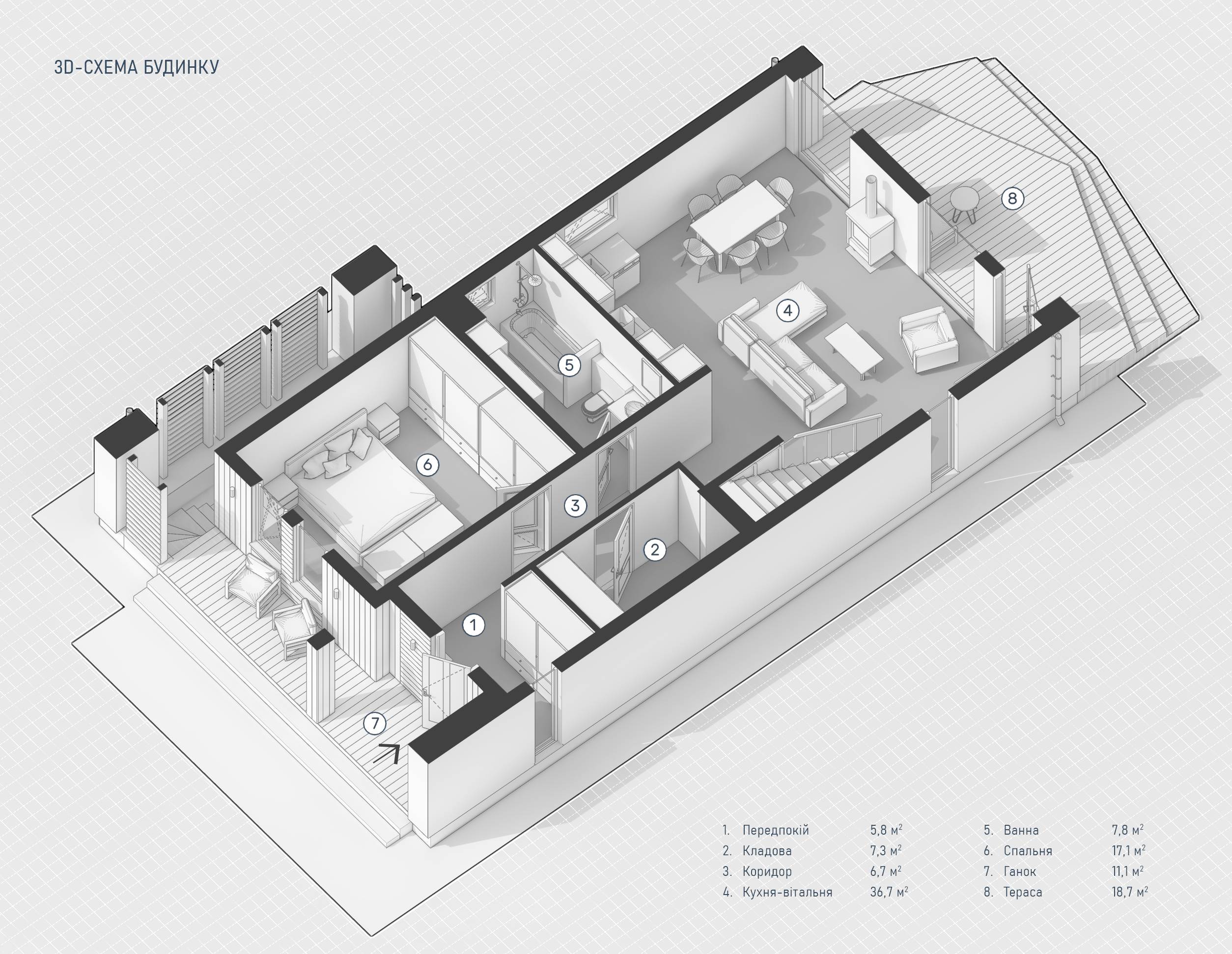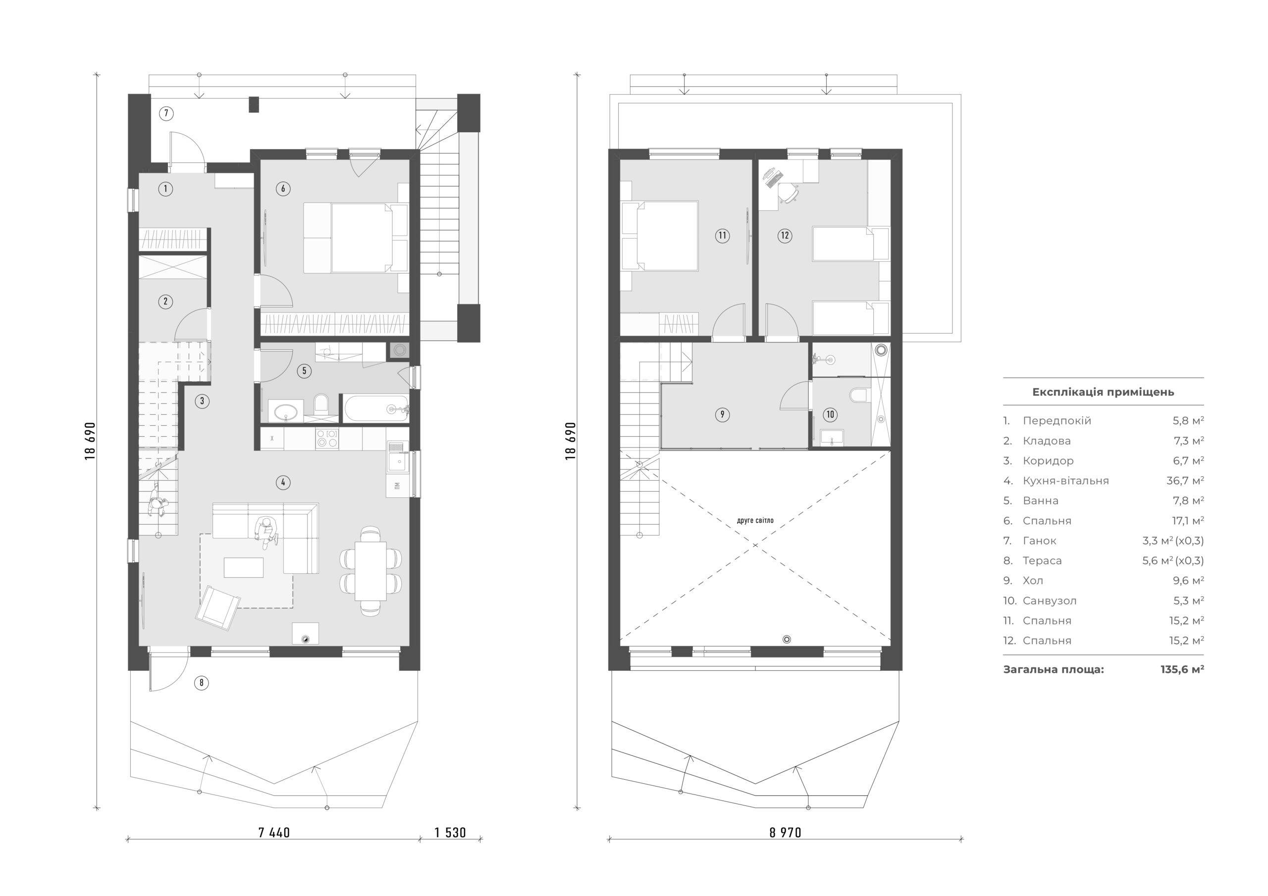 Приватний будинок із підвалом та мансардним поверхом. Загальна площа 138,6 м2 (без площі підвалу). Розрахований на проживання подружньої пари, до яких часто приїздять діти із своїми сім’ями. На першому поверсі велика господарська спальня на 17м2 та сан.вузол із ванною та душовою на 7,8м2. Передбачене окремо тех.приміщення на 7,3м2 частково під сходами. Кухня, столова, вітальня утворюють спільний простір для прийому гостей. Камін та великі панорамні вікна додають затишку. На мансардному поверсі дві дзеркальні спальні на 15,3м2 та спільний сан.вузол на 5,3м2. Друге світло дає можливість зменшити житлову площу, але візуально додає більше висоти, повітря та освітленості будинку. Із сонячної сторони передбачена велика відкрита тераса. А перед входом у будинок навіс, що одночасно накриває окремий вхід у підвал.