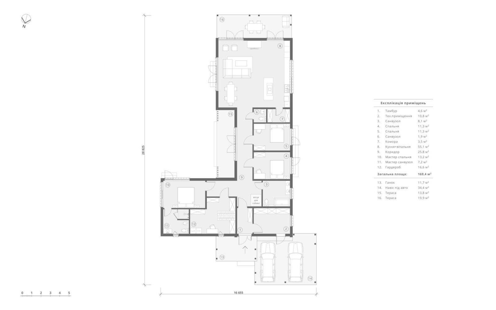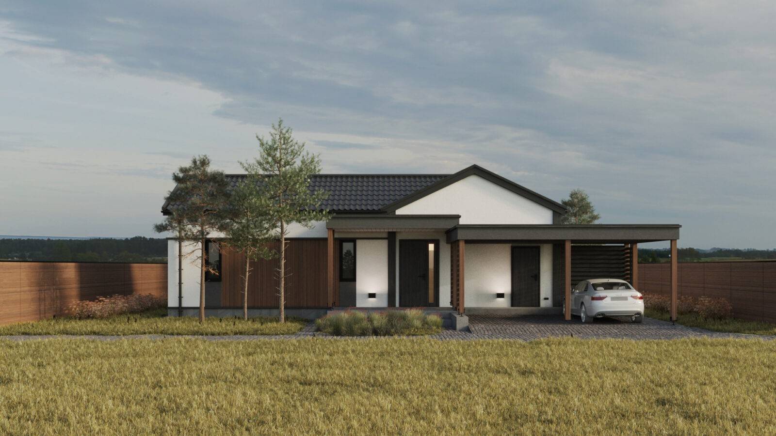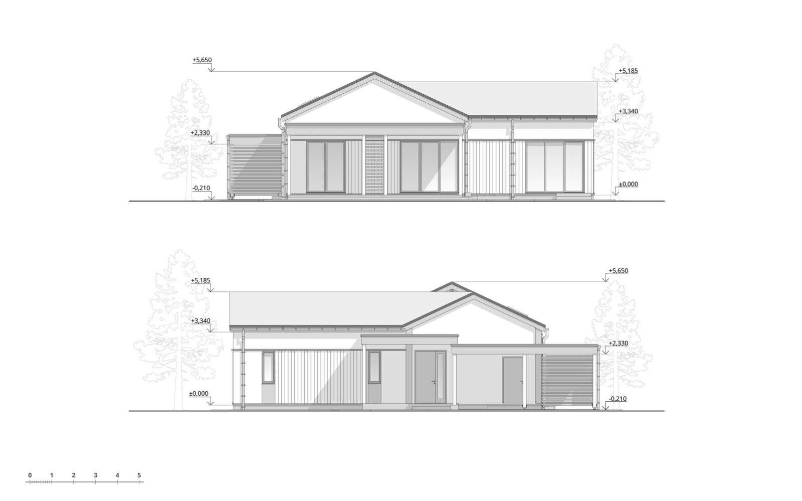 Уздовж дороги розмістили технічні приміщення і навіс під дві машини, таким чином ми створили комфортний простір у дворі і дві тераси (34 кв.м.).