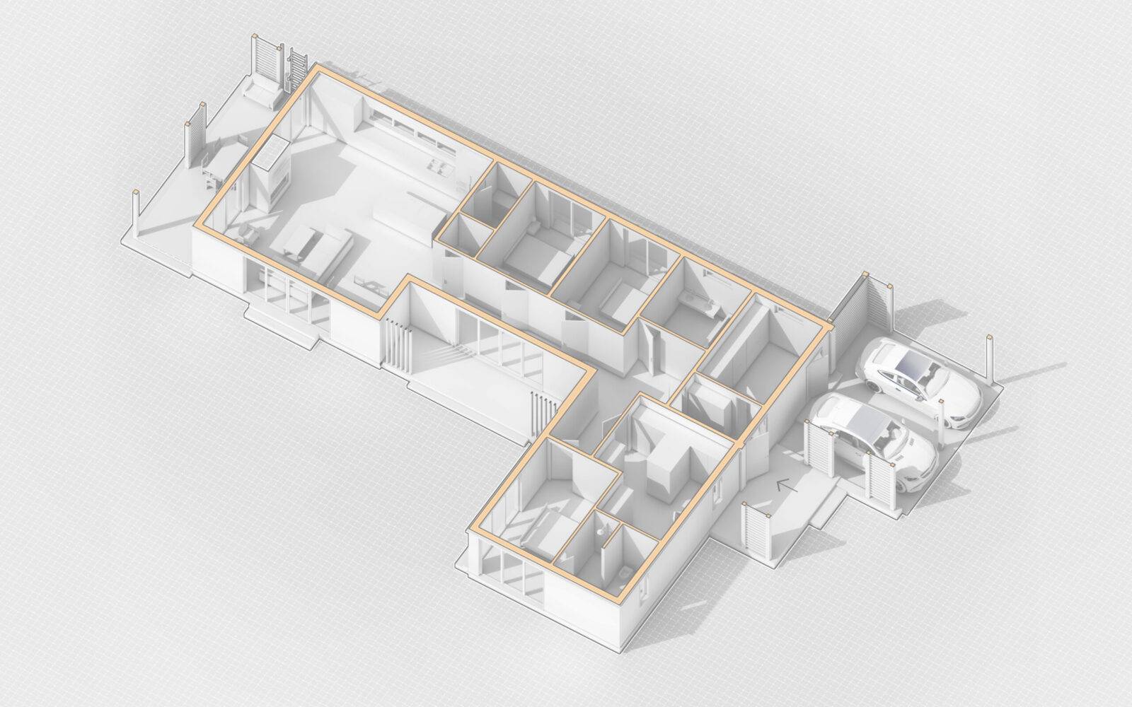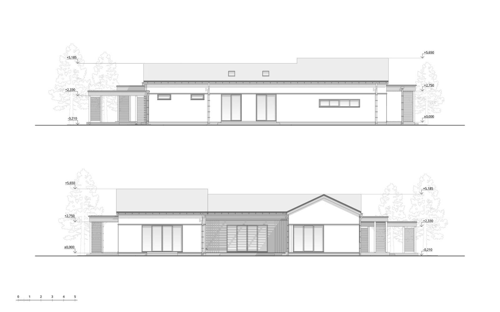 Будинок має нестандартну Г-подібну форму, оскільки основним завданням було збереження всіх дерев на ділянці.