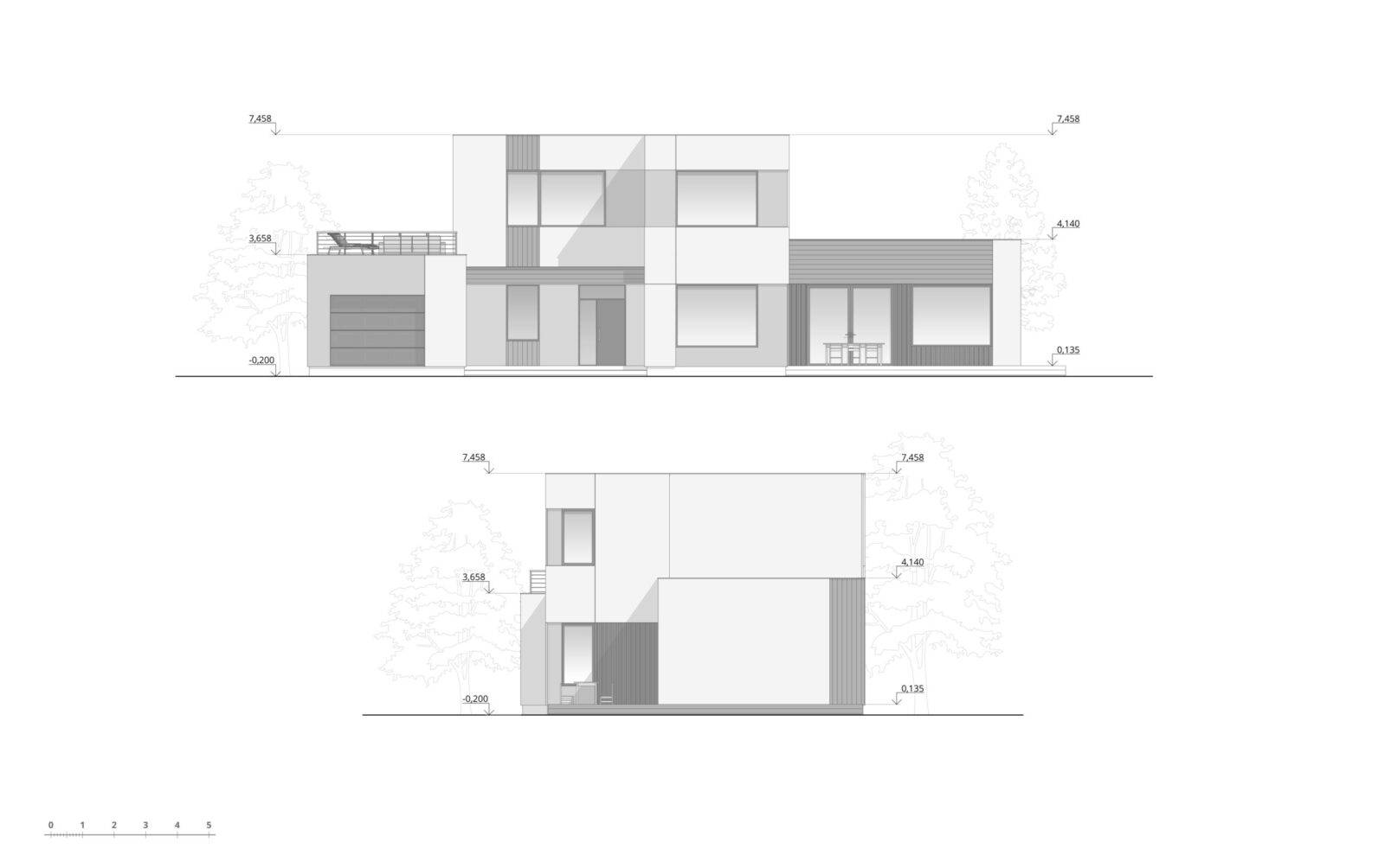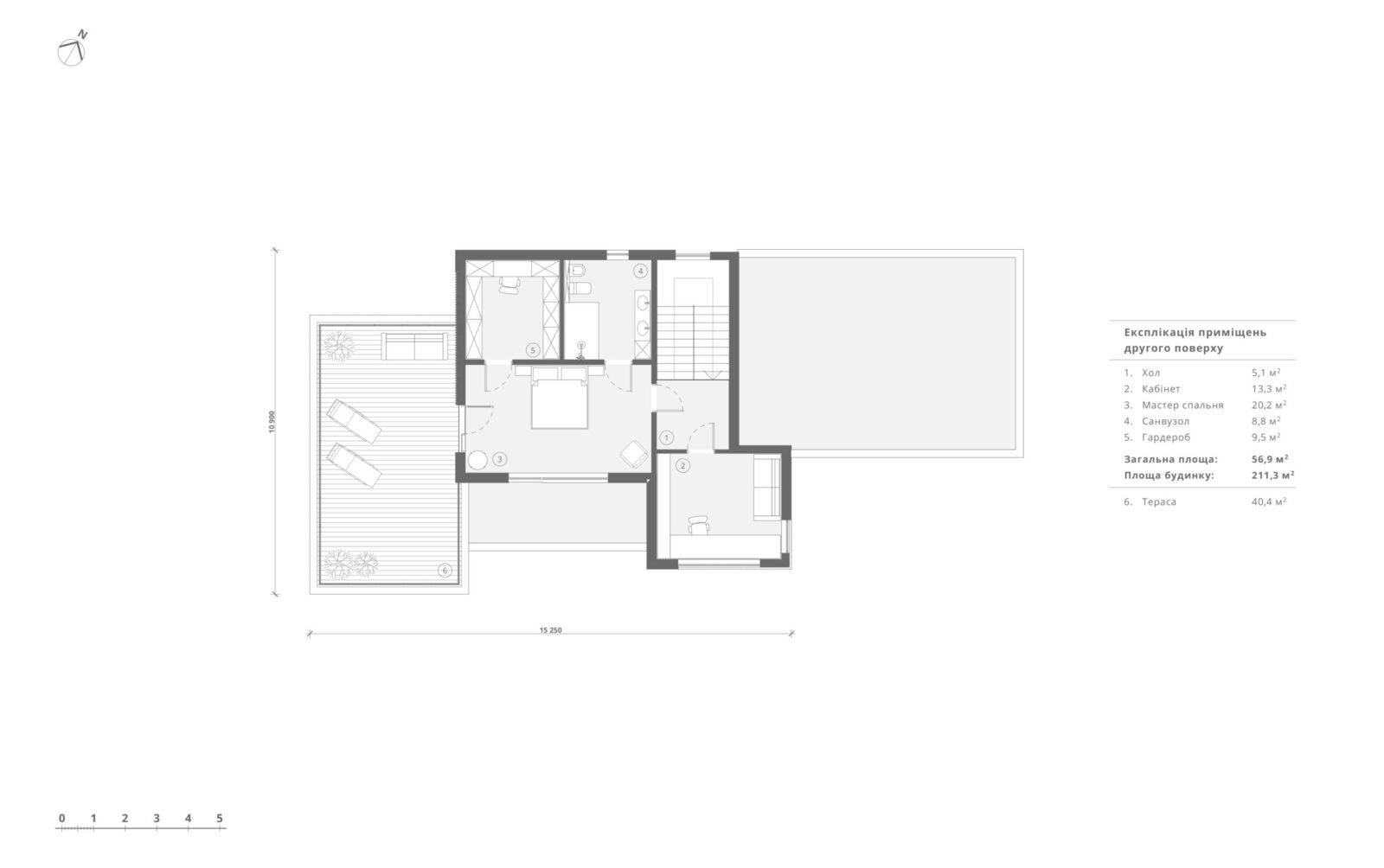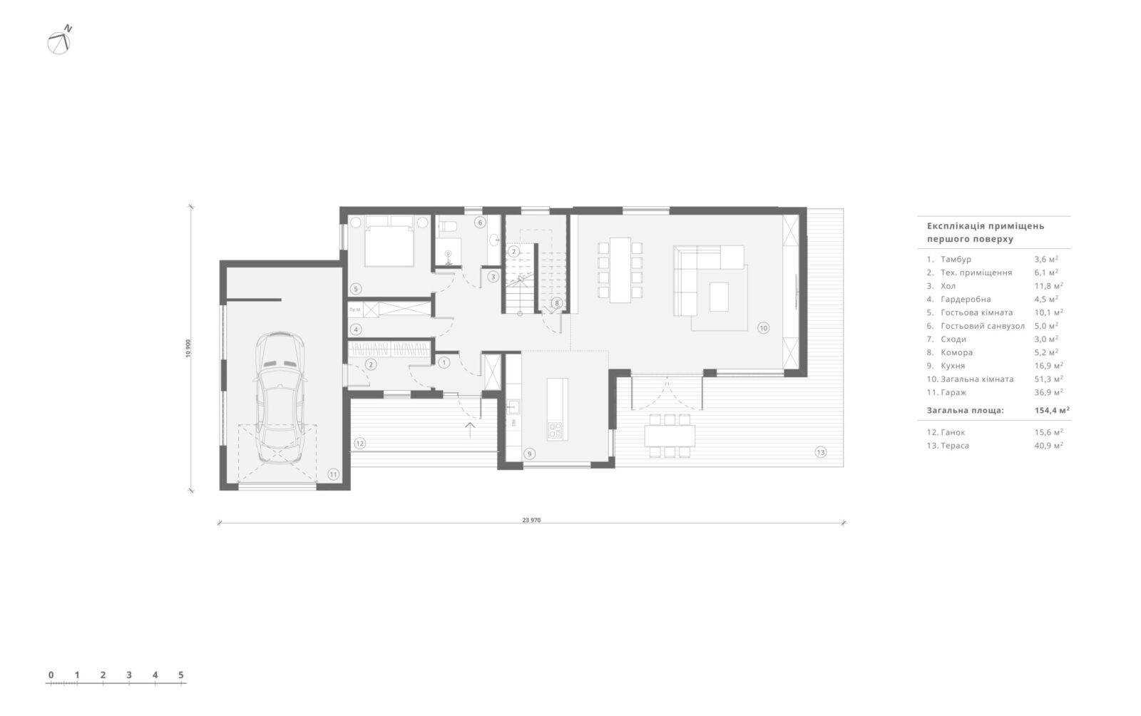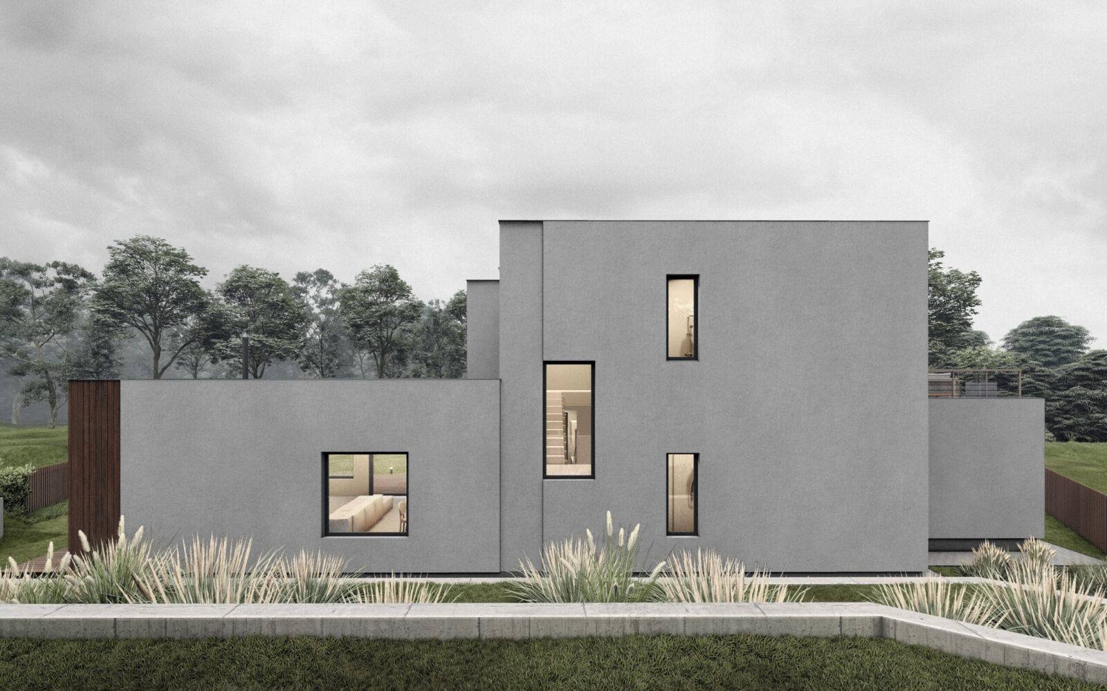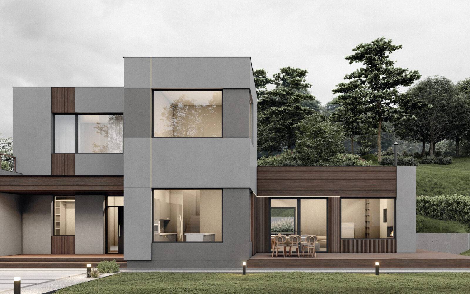 Просторий будинок для однієї родини – майже на краю землі, адже ділянка має сусідів тільки з одного боку, а все що навколо – пишні ліси. За загальною концепцією будинок має вертикальне зонування, тим самим поділяючи простір на денну зону, яка знаходиться на першому поверсі, та нічну – на другому. Господарі мають змогу прийняти багато гостей, адже в будинку є велика вітальня на 51 м2 з зоною столової та каміном, крім того на першому поверсі передбачена невеличка гостьова кімната на 10 м2, що дозволить декому залишитись на ночівлю. На другому поверсі – майстер блок зі спальнею на 20,2 м2, зі своїм гардеробом та санвузлом. Та просторий кабінет для роботи, проведення зустрічей, читання книг, або просто тихого відпочинку. Але головною особливістю цього будинку є тераса на покрівлі гаража, на якій можна проводити захід сонця або приймати сонячні ванни. Фасад передбачено в сірих тонах з додаванням акцентів у вигляді оздоблення деяких ділянок деревом. І саме завдяки цьому цей будинок гармонійно вписується зелену навколишнє середовище