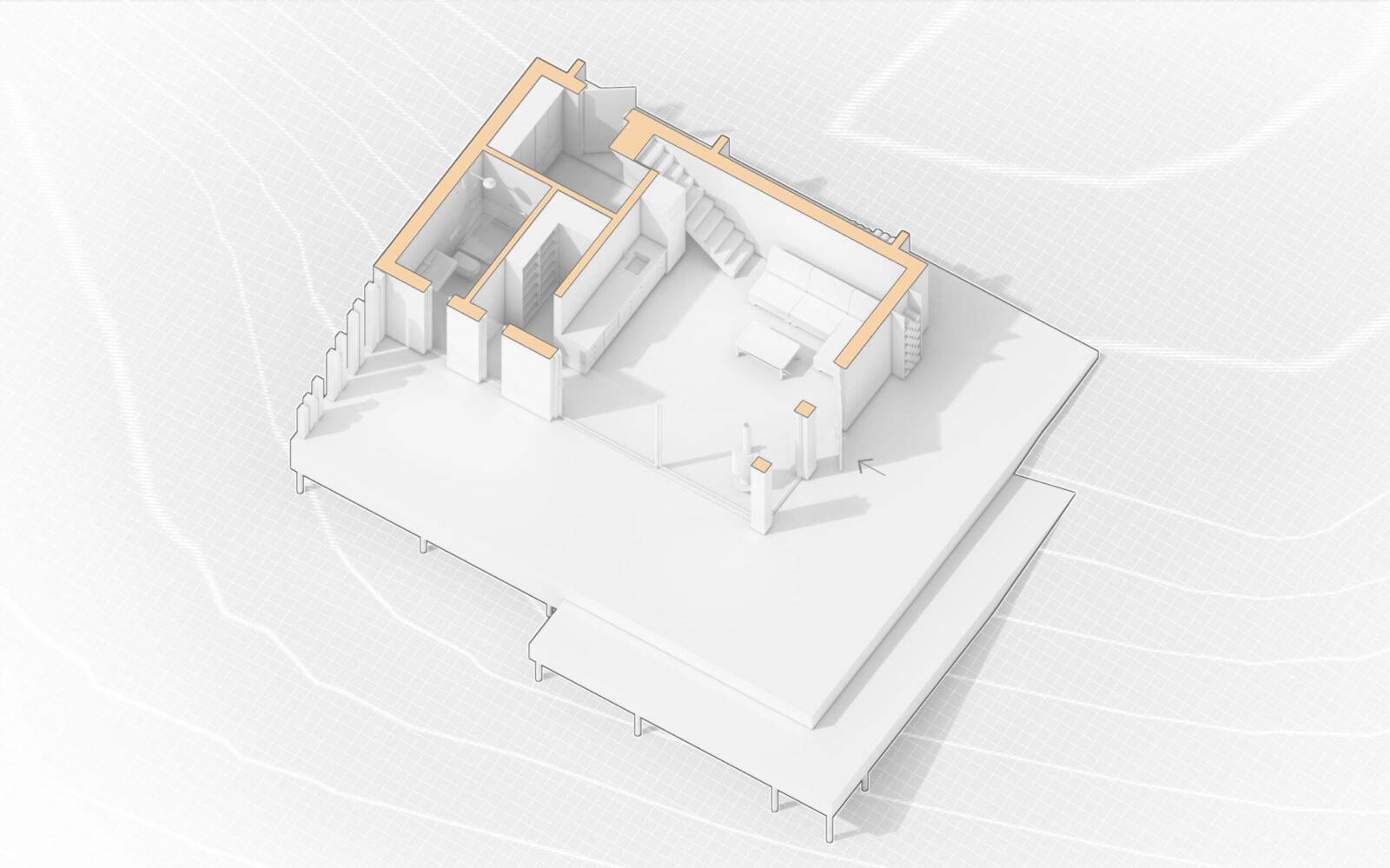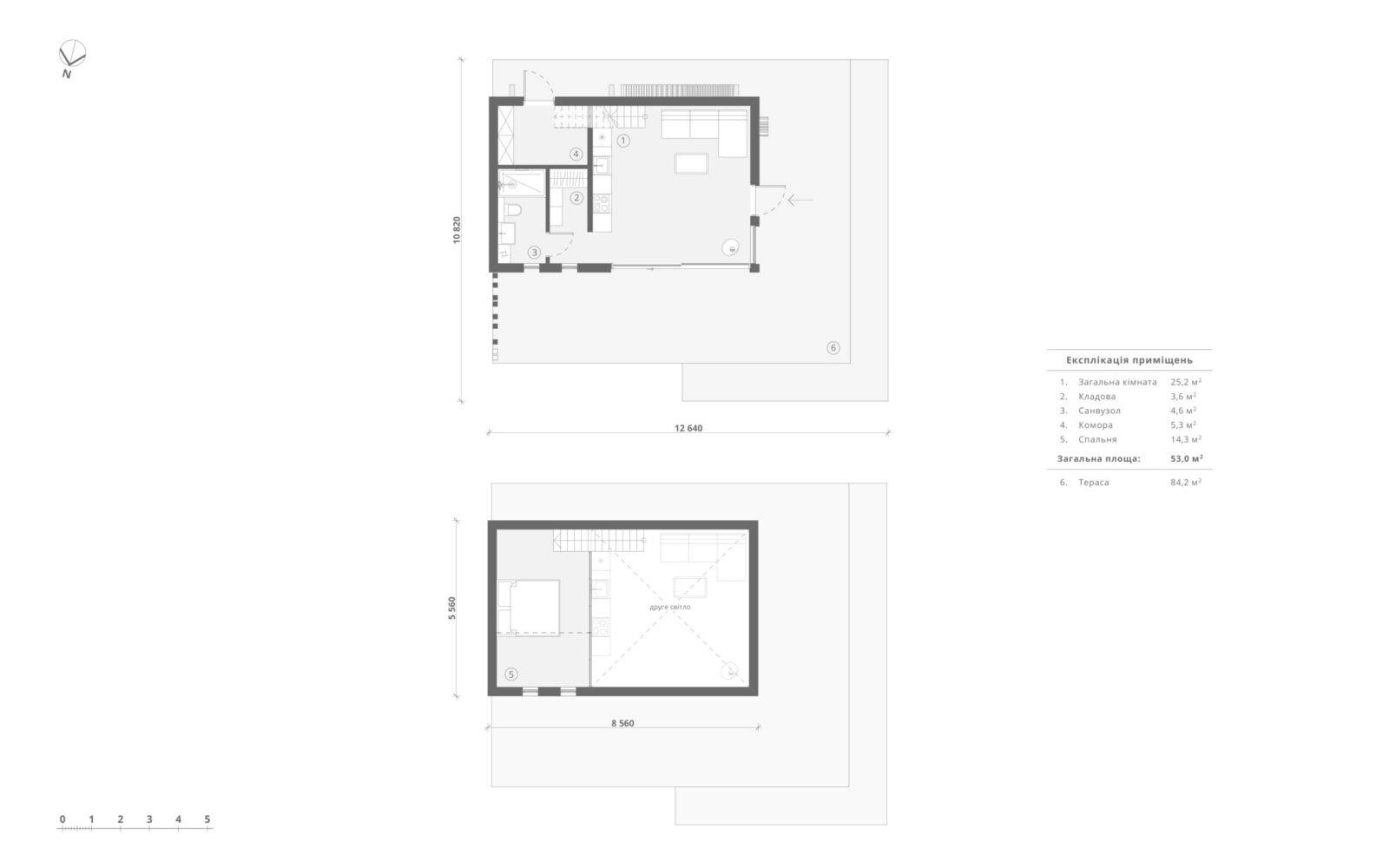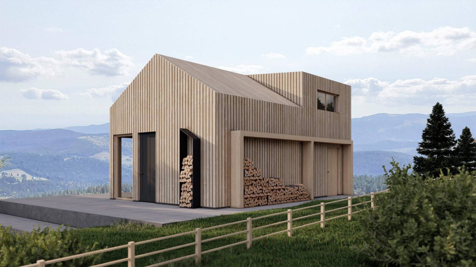 Будинок облицьований деревом як по фасаду, так і на покрівлі з можливістю скидати воду через приховані водостоки. Вікна поєднують в собі здатність панорамного огляду, зручну розсувну систему і джерело світла в будинку. Особливістю ергономіки всередині стало наявності другого ярусу в будинку – це дозволило максимально раціонально використовувати простір, але при цьому “заховати” спальню від зовнішнього погляду. Таким чином на площі 53 кв.м. Вдалося зручно розташувати: спальню, кухню з вітальні, просторий санвузол, міні гардероб і простору технічну кімнату де можна зберігати необхідний інвентар для активного відпочинку. Тераса навколо будинку може бути адаптована під будь-який ухил і навіть частково стояти у воді озера. Будинок чудово підійде для сімейної пари або сім’ї з дитиною. При цьому знайдеться місце для гостей!