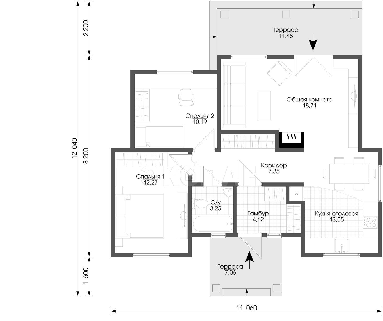 Цей одноповерховий будинок – втілення простоти і комфорту. Економічний і дуже функціональний, внутрішнє планування передбачає максимальне використання простору. На площі 70 кв.м. сплановані денна зона, дві спальні, санвузол. Щоб візуально збільшити площу житлових приміщень, застосовуються такі прийоми як повністю відкрите єдиний простір (для вітальні, їдальні, кухні). Незважаючи на свої скромні габарити, будинок розрахований для комфортного проживання 4 і більше осіб для постійного проживання.