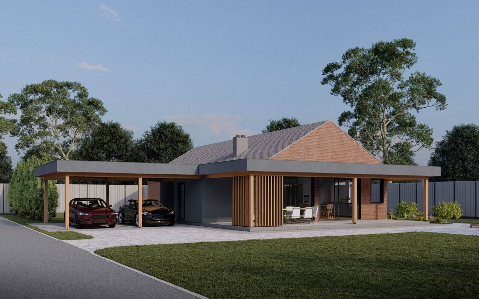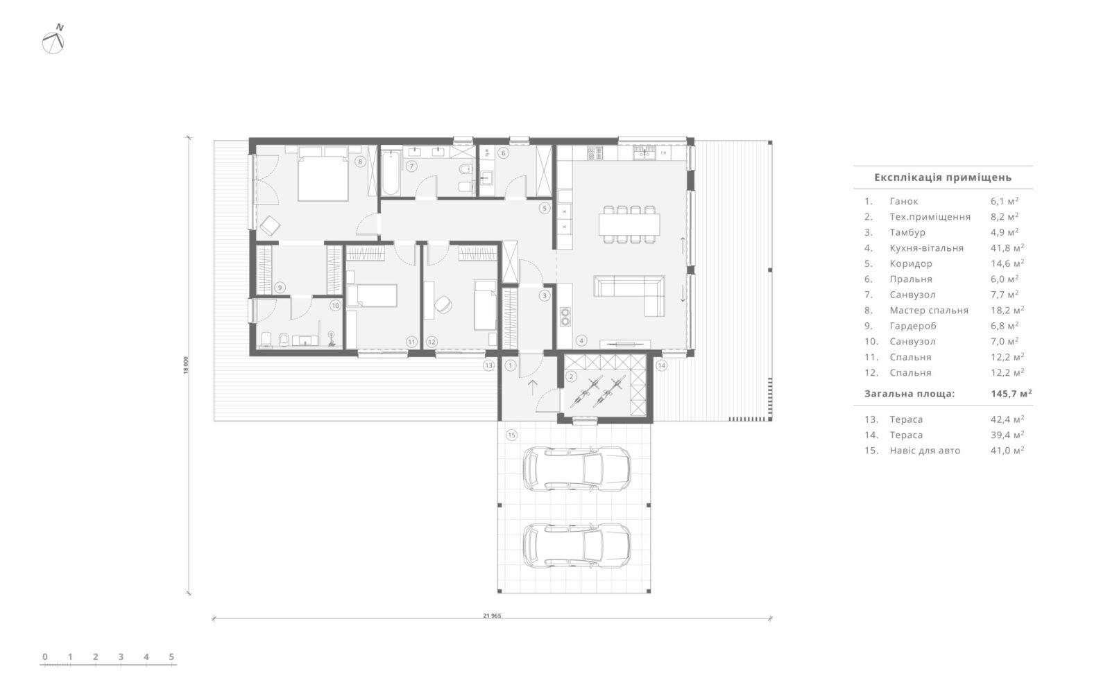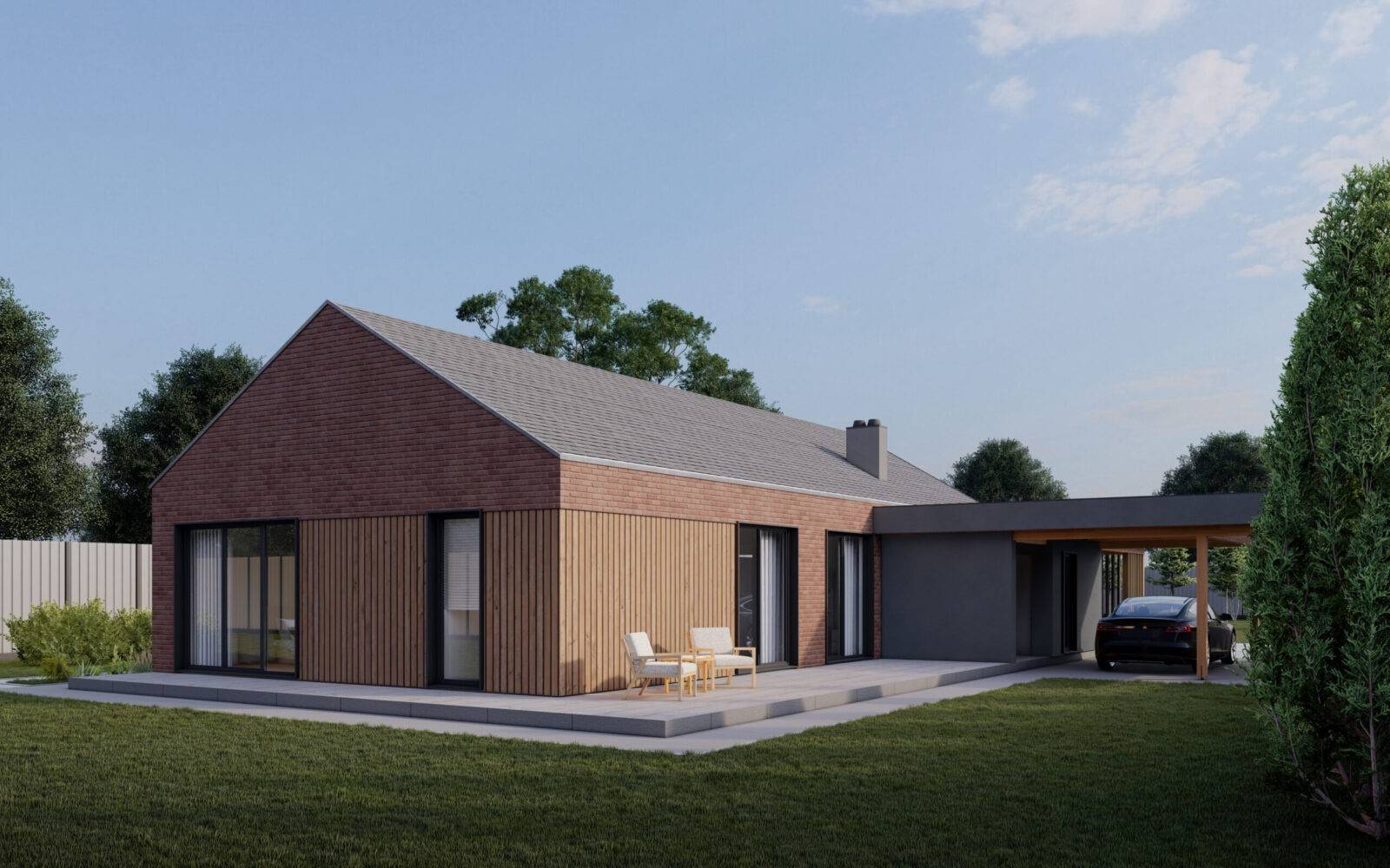 Індивідуальний житловий будинок на 3 спальні кімнати. Будинок прямокутної форми зі скатним дахом. Вздовж трьох сторін розміщені тераси та навіс для двох машин. Основна тераса розміщена біля вітальні. Всі житлові кімнати запроєктовані з великими панорамними вікнами. Майстер блок, розміщений в кінці будинку, складається з спальні (18,2м.кв), гардеробу і санвузлу (7 м.кв.). Дві інші спальні (по 12,2 м.кв.) мають вихід на терасу. В будинку є ще один загальний санвузол, пральня і технічне приміщення. Вітальня включає в себе велику кухню, оснащену всім необхідним, великий обідній стіл на 8 персон та зона відпочинку біля каміну.