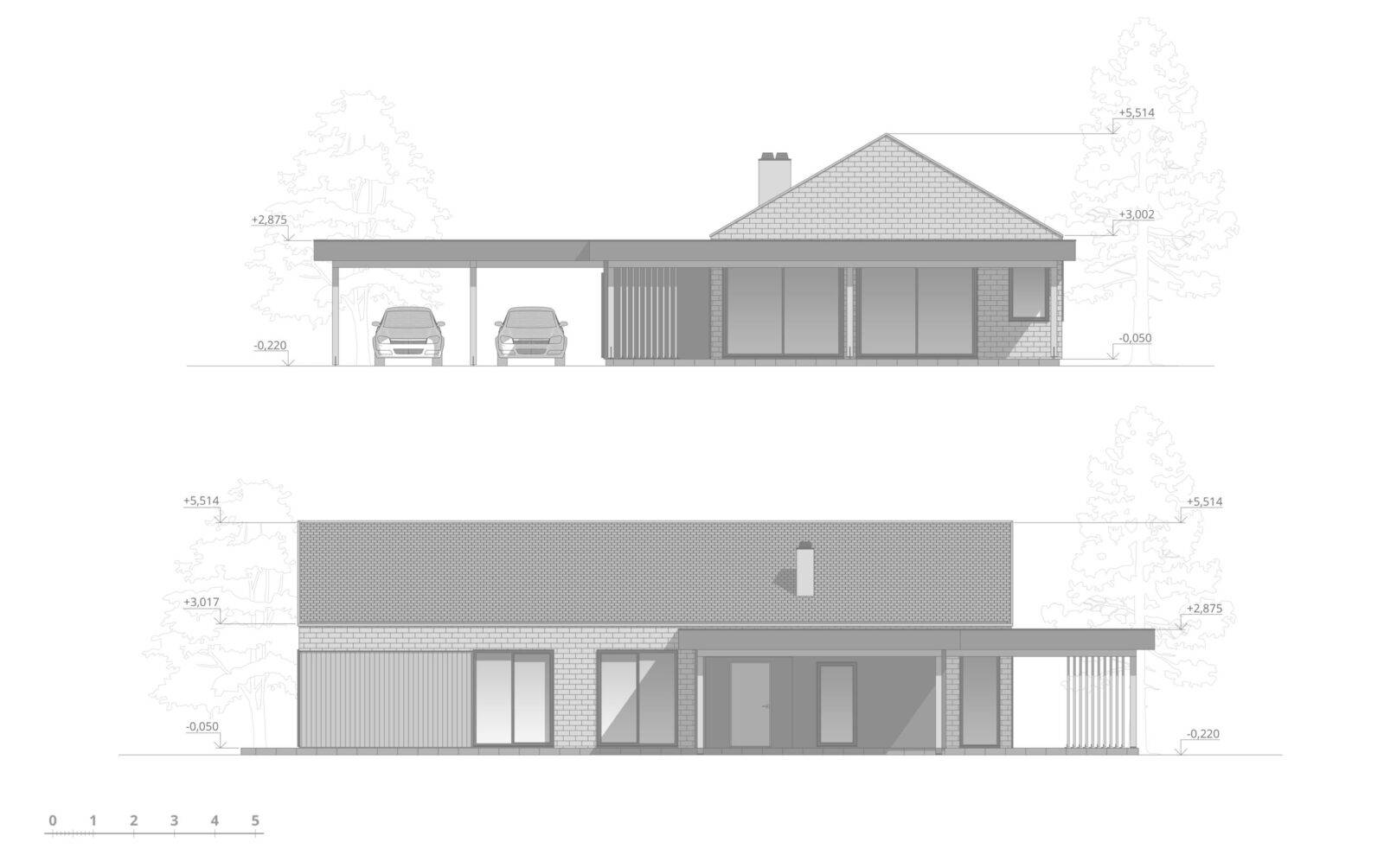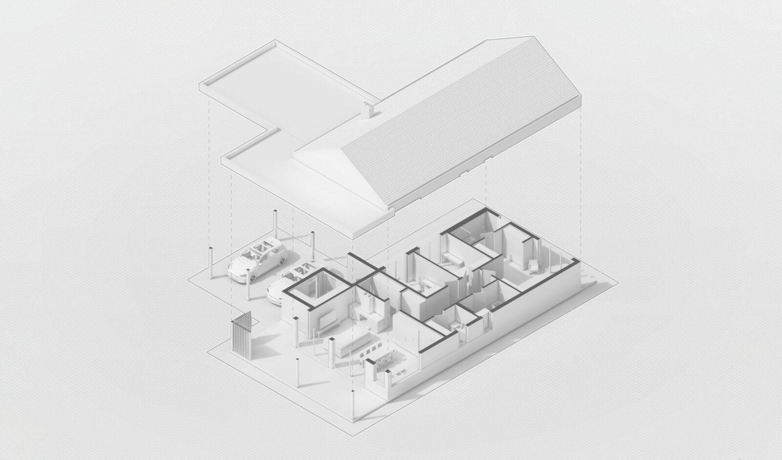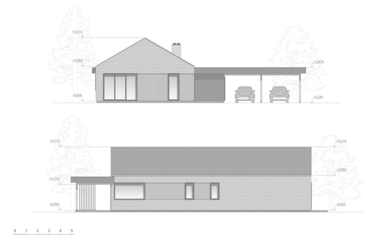 Індивідуальний житловий будинок на 3 спальні кімнати. Будинок прямокутної форми зі скатним дахом. Вздовж трьох сторін розміщені тераси та навіс для двох машин. Основна тераса розміщена біля вітальні. Всі житлові кімнати запроєктовані з великими панорамними вікнами. Майстер блок, розміщений в кінці будинку, складається з спальні (18,2м.кв), гардеробу і санвузлу (7 м.кв.). Дві інші спальні (по 12,2 м.кв.) мають вихід на терасу. В будинку є ще один загальний санвузол, пральня і технічне приміщення. Вітальня включає в себе велику кухню, оснащену всім необхідним, великий обідній стіл на 8 персон та зона відпочинку біля каміну.