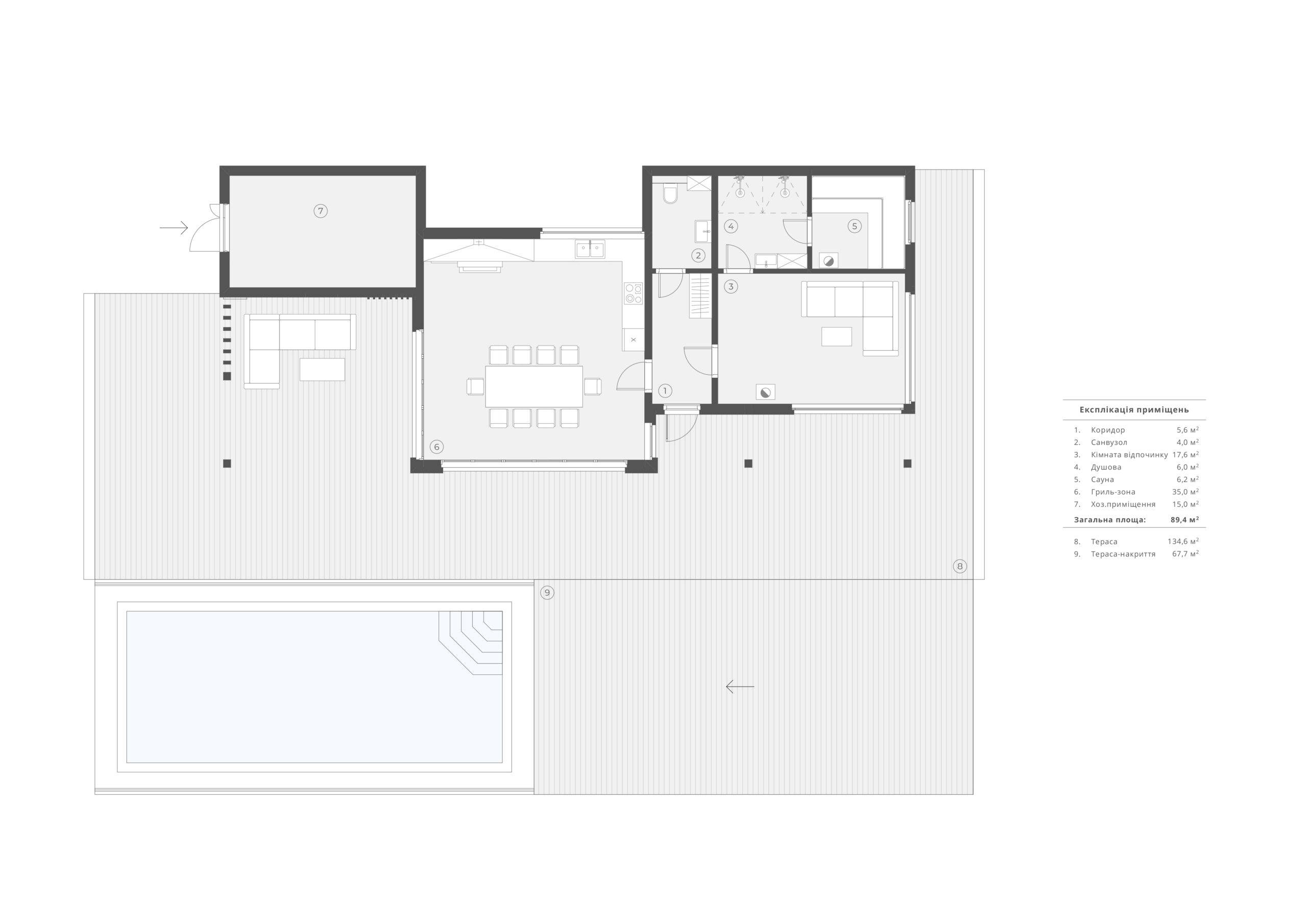 – проміжна зона, в яку входять барбекю, кухня та обідня зала, має дві стіни з панорамним склінням. Завдяки великим терасним дверям, цю зону можна легко об’єднати з вуличним простором;