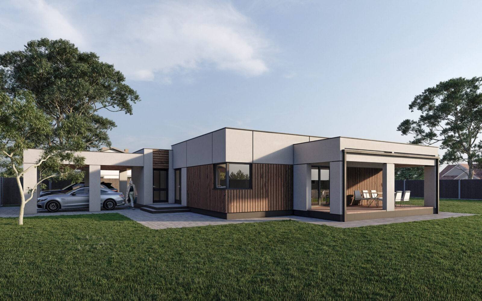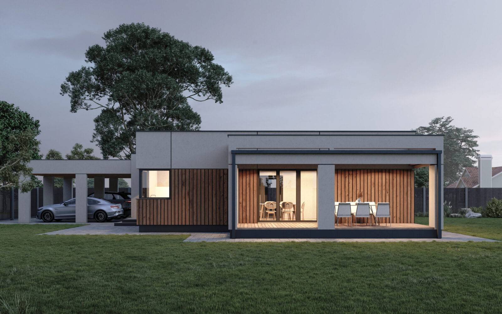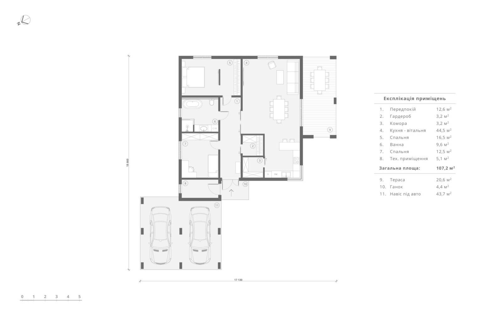 Стильний та функціональний проєкт одноповерхового будинку загальною площею 107 м2. Планування будинку виділяється своєю просторістю та повсякденною зручністю. Чітко виділена вхідна зона – зручний тамбур на 4,4 м2, та передпокій (12,6 м2), з якого можемо потрапити в будь-яку частину будинку. Біля вхідної зони розташована дитяча кімната (12,5 м2), поруч просторий санвузол площею 9,6 м2, в якому поміститься окрема ванна та душова кабіна. Навпроти дитячої є відокремлений гардероб (3,2 м2), що мінімізує кількість зайвих меблів в кімнатах. В торці коридору розміщено майстер-спальню з власною гардеробною загальною площею 16,5 м2. Денну зону будинку складає велика кухня-вітальня площею 44,5 м2 поділена на декілька частин, де кожен знайде собі куточок по душі, зона кухні оснащена коморою (3,2 м2). Також в будинку передбачено технічне приміщення (5,1 м2). Котедж відмінно підійде і для заміського відпочинку, і в якості постійного житла. Зручною опцією будинку є широка крита тераса площею 20,6 м2 та навіс на 2 парко місця для авто.