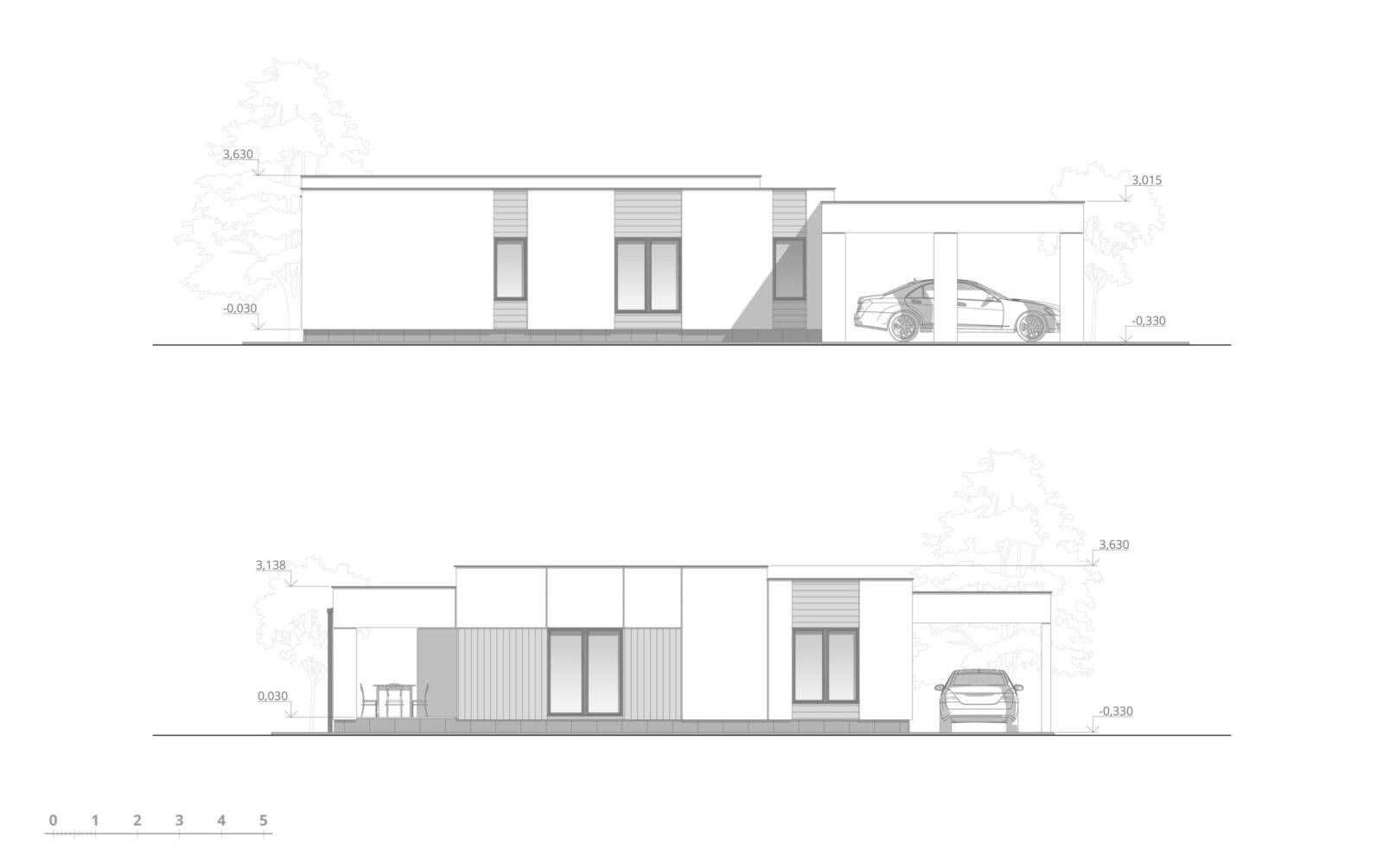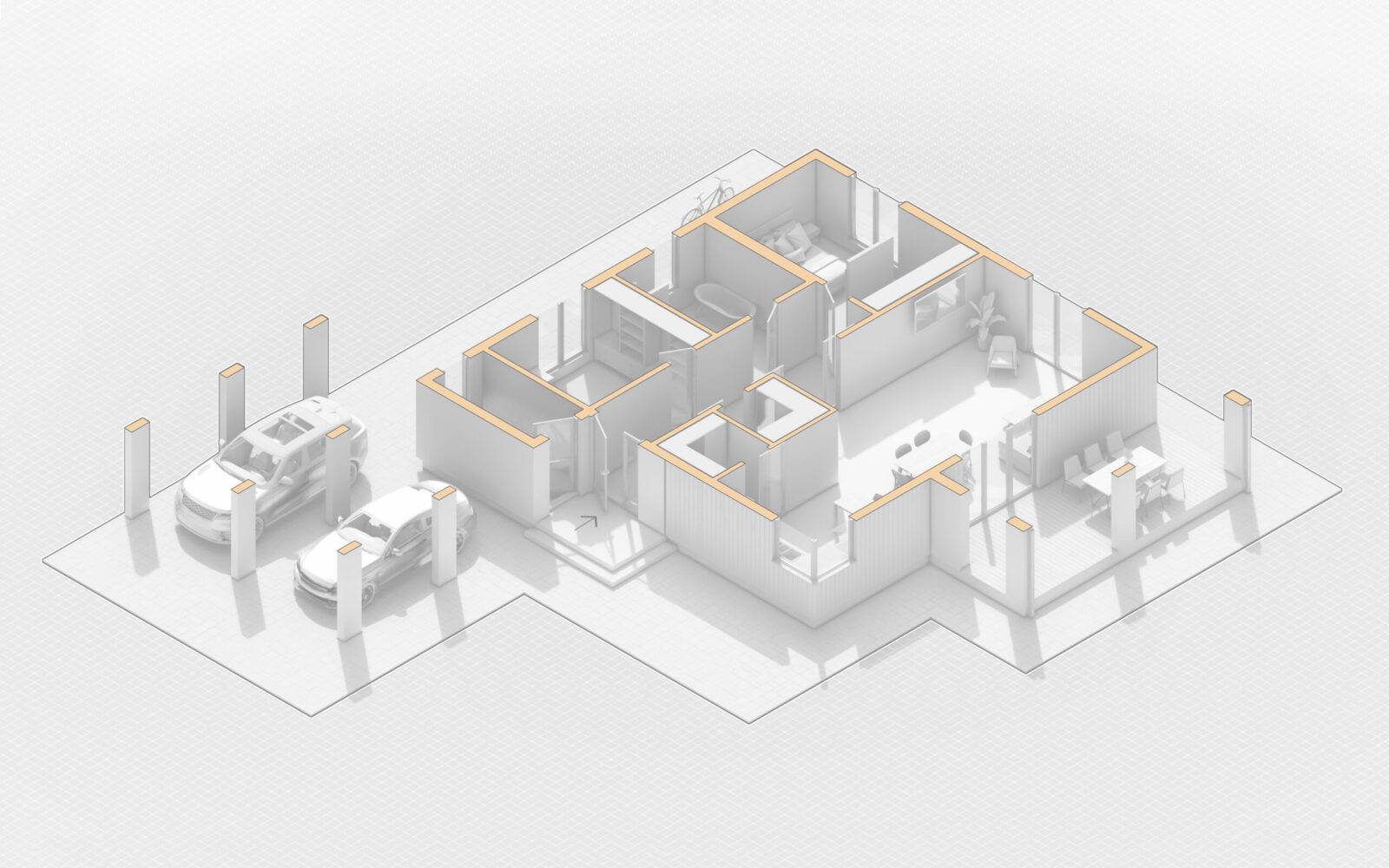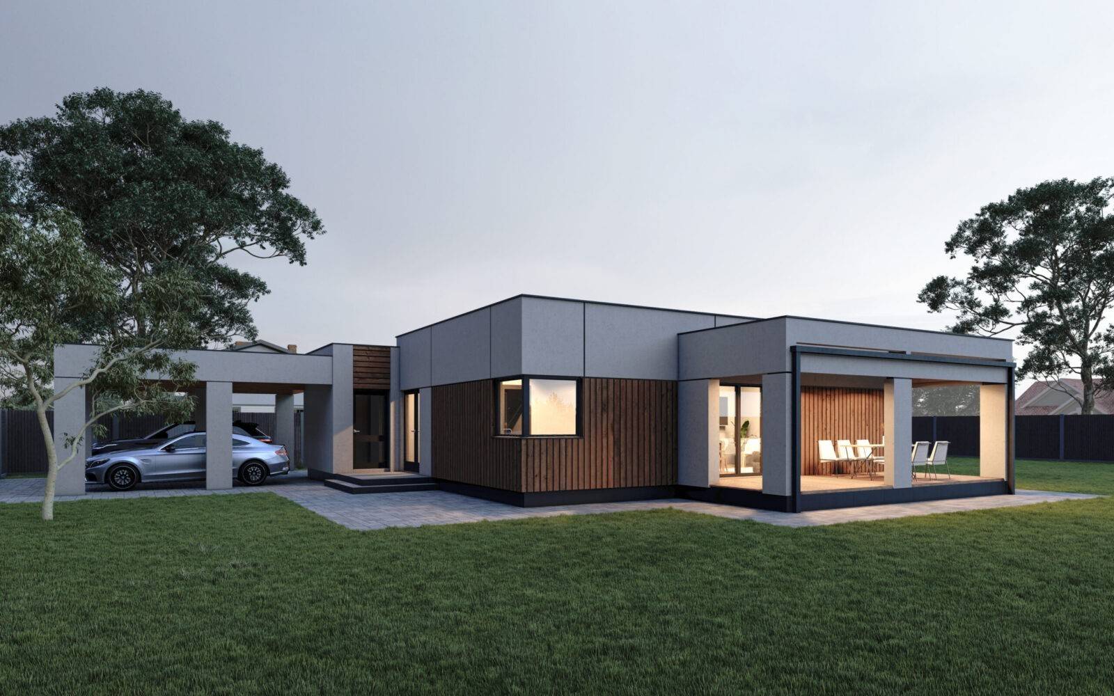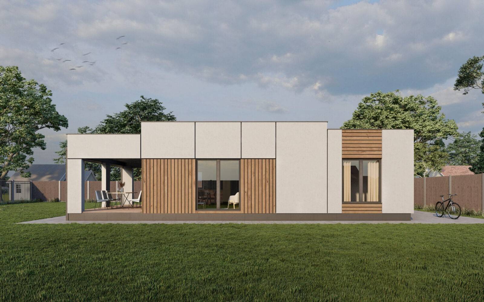 Стильний та функціональний проєкт одноповерхового будинку загальною площею 107 м2. Планування будинку виділяється своєю просторістю та повсякденною зручністю. Чітко виділена вхідна зона – зручний тамбур на 4,4 м2, та передпокій (12,6 м2), з якого можемо потрапити в будь-яку частину будинку. Біля вхідної зони розташована дитяча кімната (12,5 м2), поруч просторий санвузол площею 9,6 м2, в якому поміститься окрема ванна та душова кабіна. Навпроти дитячої є відокремлений гардероб (3,2 м2), що мінімізує кількість зайвих меблів в кімнатах. В торці коридору розміщено майстер-спальню з власною гардеробною загальною площею 16,5 м2. Денну зону будинку складає велика кухня-вітальня площею 44,5 м2 поділена на декілька частин, де кожен знайде собі куточок по душі, зона кухні оснащена коморою (3,2 м2). Також в будинку передбачено технічне приміщення (5,1 м2). Котедж відмінно підійде і для заміського відпочинку, і в якості постійного житла. Зручною опцією будинку є широка крита тераса площею 20,6 м2 та навіс на 2 парко місця для авто.