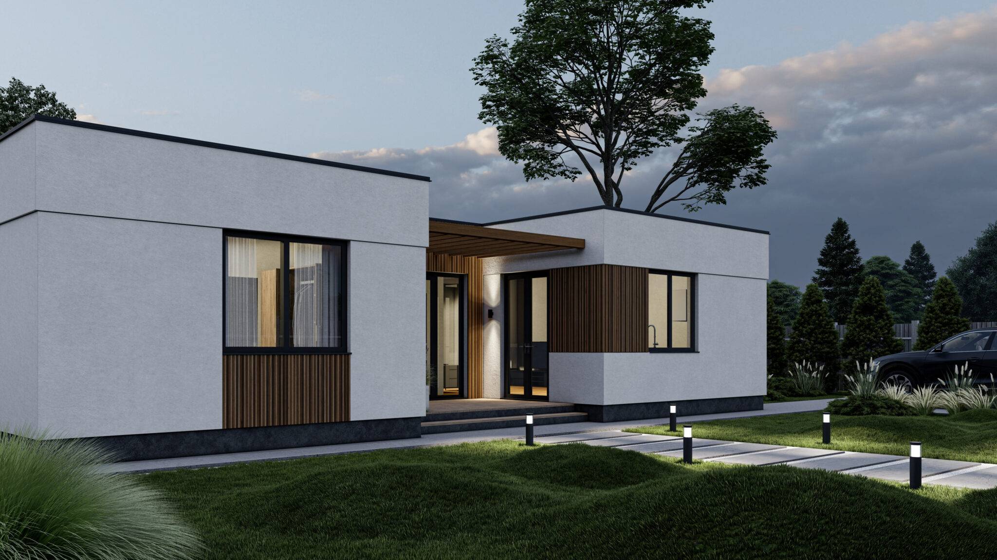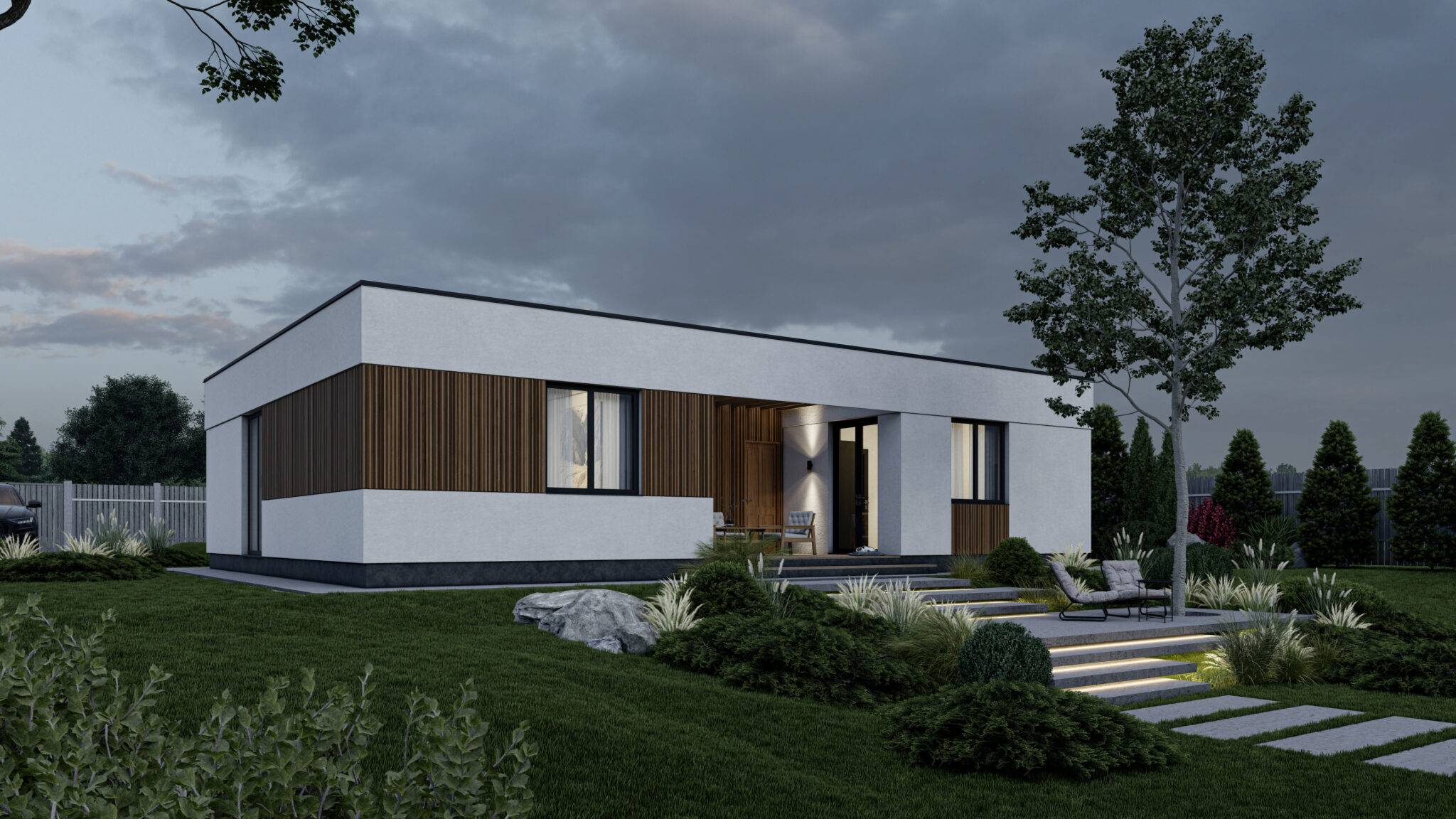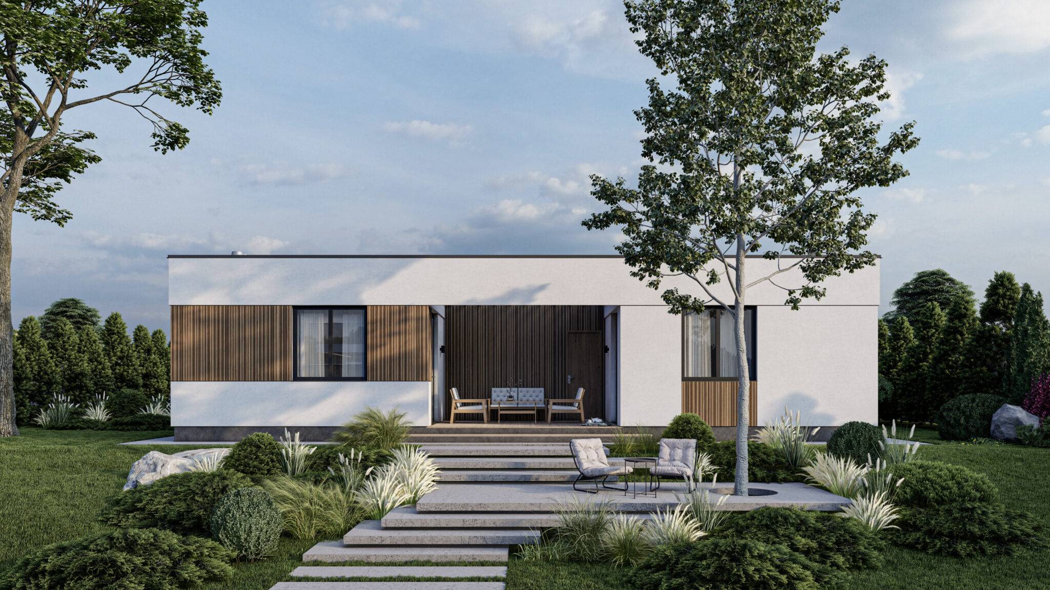 Проект сучасного будинку розроблений командами архітекторів ЕКОПАН і ТОВ “Перебудова” Фундамент стовпчастий з залізобетонним ростверком, утеплена стяжка першого поверху Несучі стіни – SIP 160 мм, дах – SIP 200 мм, міжкімнатні перегородки – SIP 120 мм Фасад – декоративна штукатурка Устаткування плоскої покрівлі: дерев’яна разуклонка, накриття шаром ОСП, ПВХ мембрана, аератори, водостічна система з підігрівом Підлогове покриття тераси – композитна дошка Вікна металопластикові – Rehau, 5-ти камерний профіль Ecosol 70, склопакет c енергозберігаючим склом Glas Trösch.