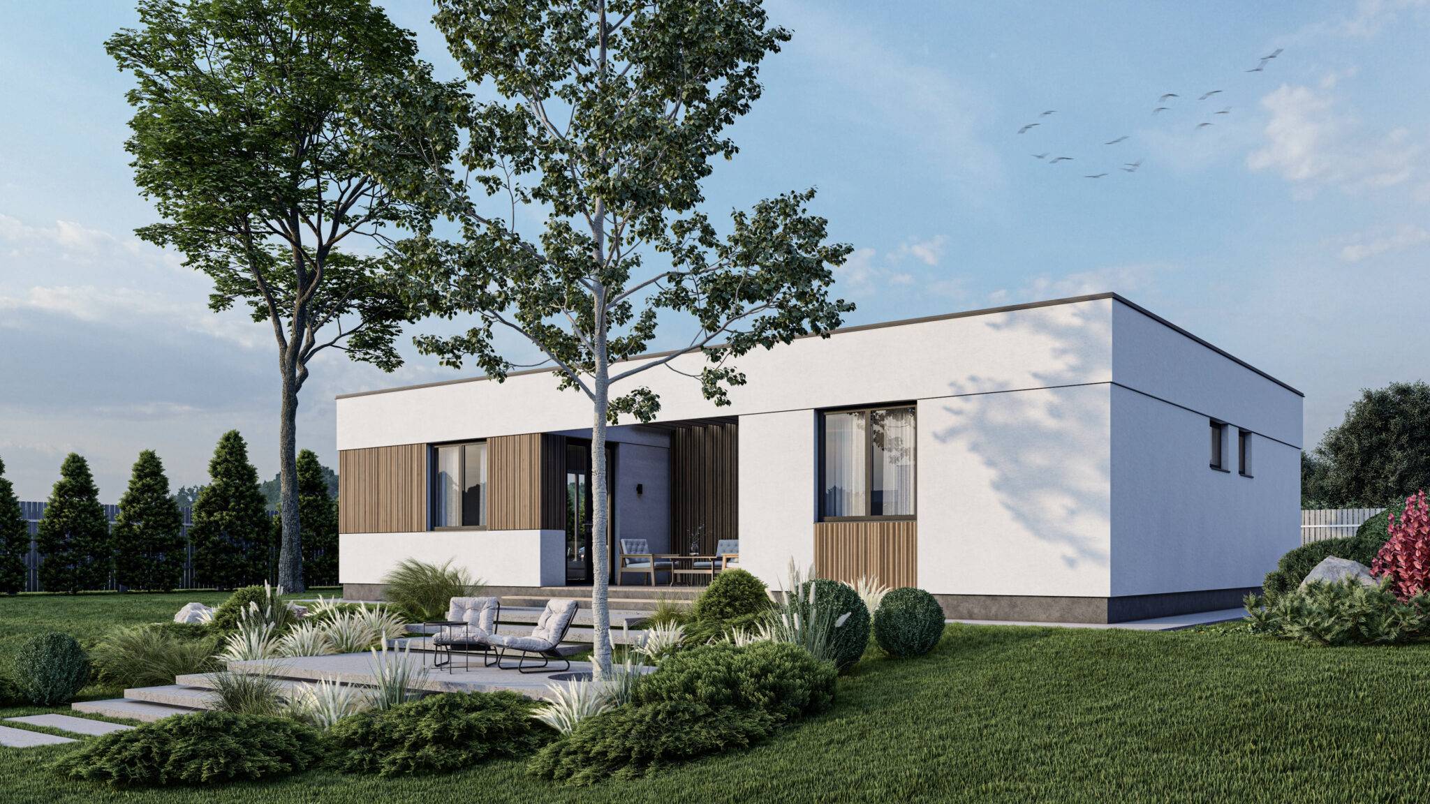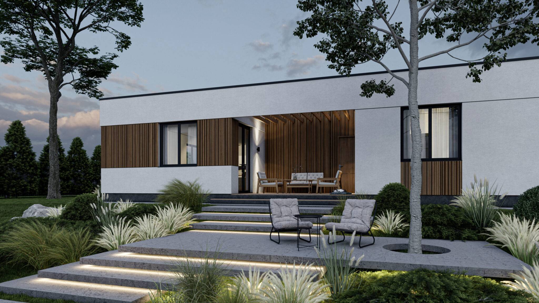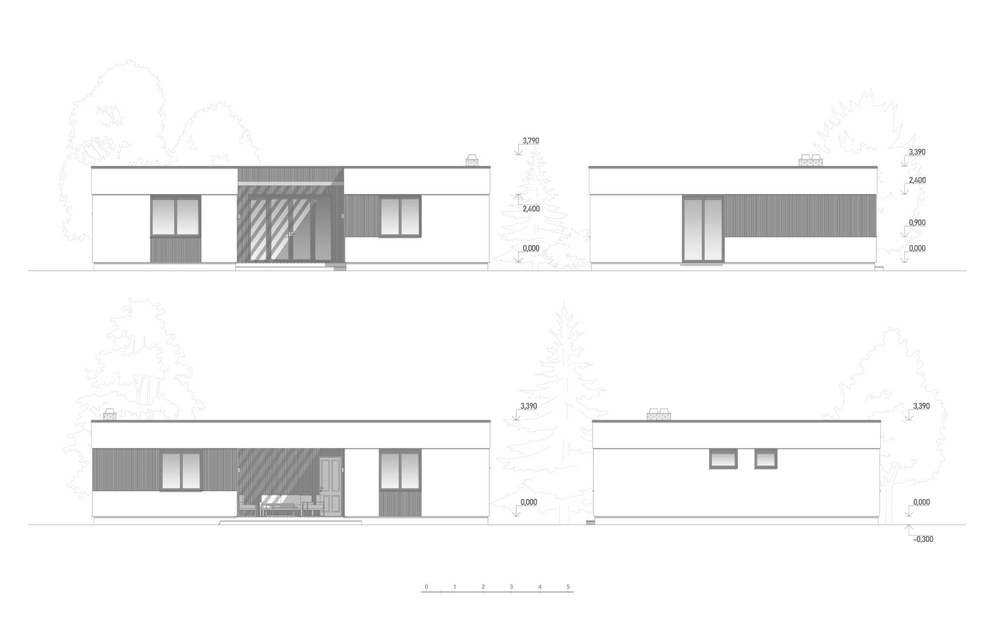 Проект сучасного будинку розроблений командами архітекторів ЕКОПАН і ТОВ “Перебудова” Фундамент стовпчастий з залізобетонним ростверком, утеплена стяжка першого поверху Несучі стіни – SIP 160 мм, дах – SIP 200 мм, міжкімнатні перегородки – SIP 120 мм Фасад – декоративна штукатурка Устаткування плоскої покрівлі: дерев’яна разуклонка, накриття шаром ОСП, ПВХ мембрана, аератори, водостічна система з підігрівом Підлогове покриття тераси – композитна дошка Вікна металопластикові – Rehau, 5-ти камерний профіль Ecosol 70, склопакет c енергозберігаючим склом Glas Trösch.