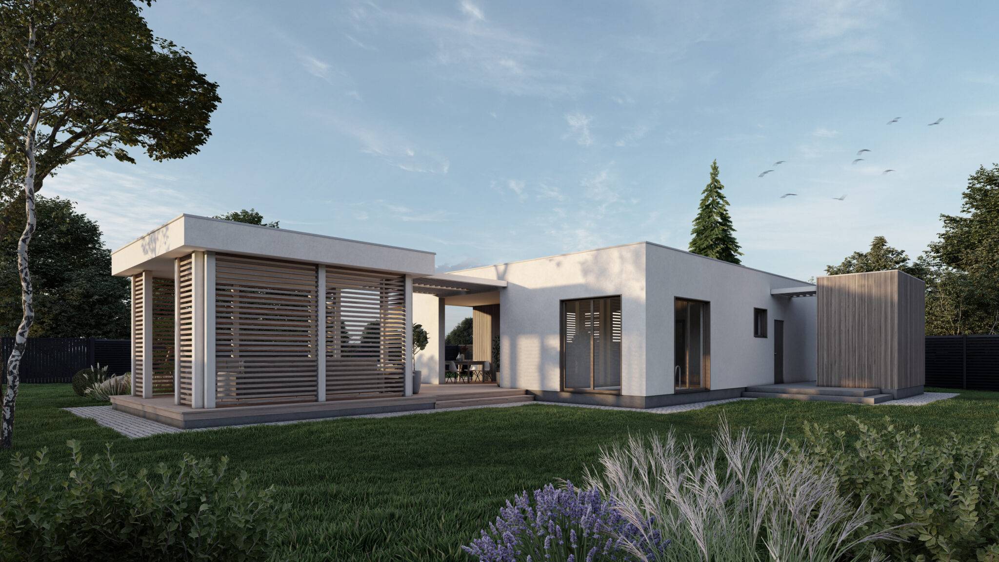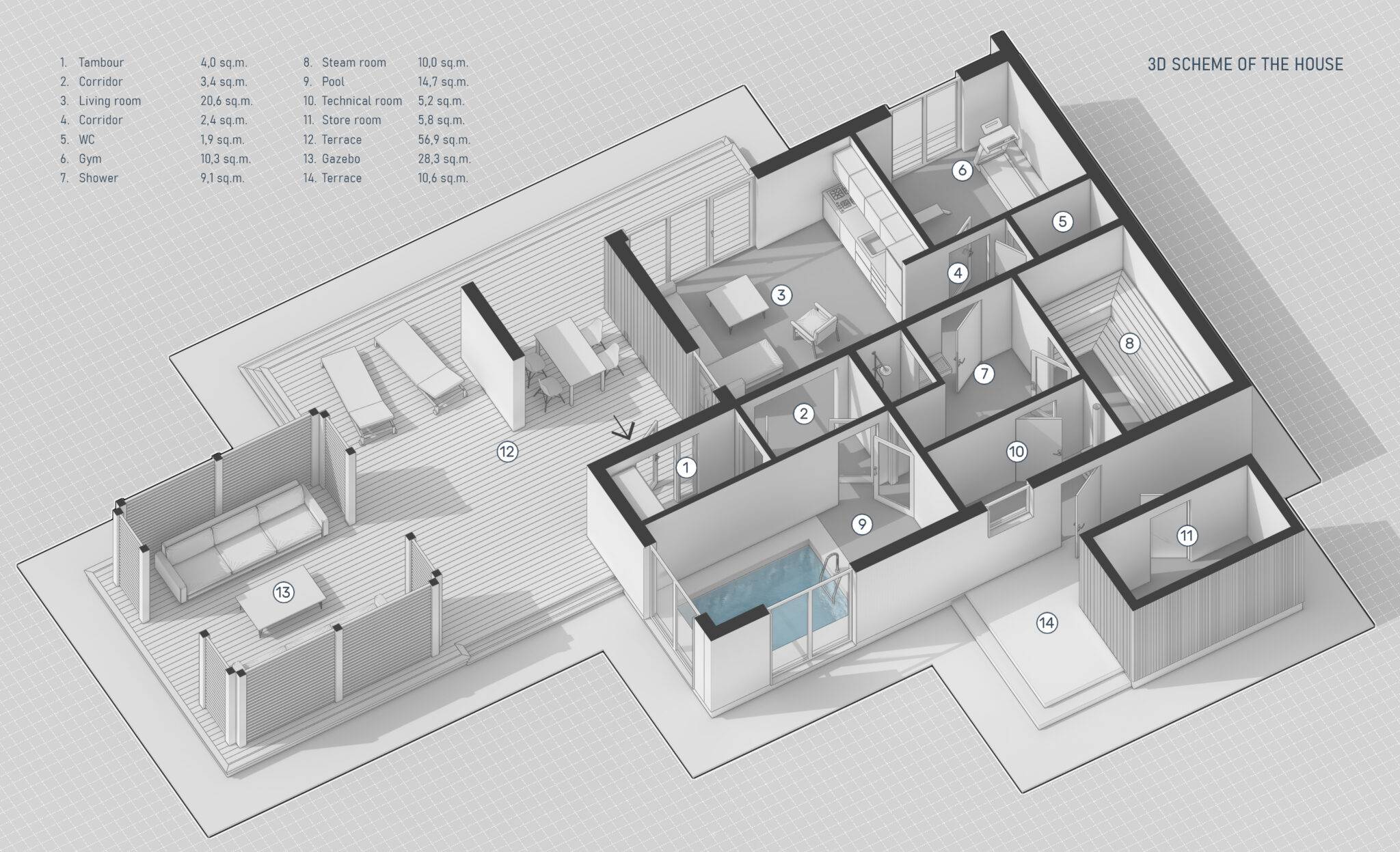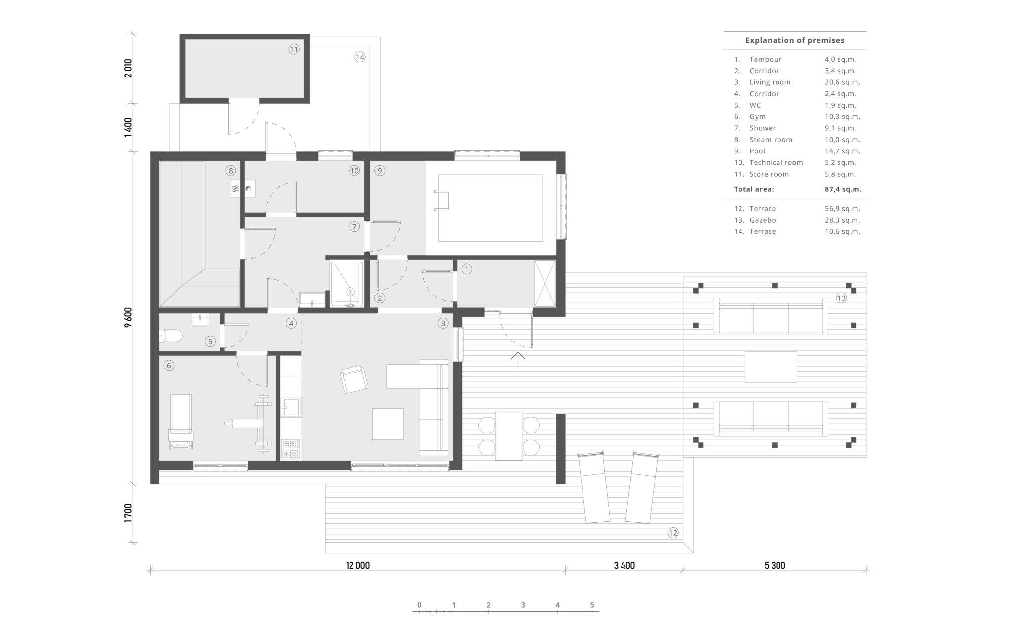 Сауна виконана в сучасному стилі з плоскою покрівлею. Вона відмінно підійде для комфортного і веселого проведення часу в колі друзів і сім’ї з користю для здоров’я. Проектом передбачена комфортне планування, яка включає парну, душову з санвузлом, простору кімнату відпочинку, технічне приміщення і невеликий тренажерний зал. У кімнаті відпочинку розміщена міні-кухня. Після парилки гості можуть зануритися в холодний басейн. Також в представленому проекті є зона відпочинку на свіжому повітрі – простора тераса і альтанка.
