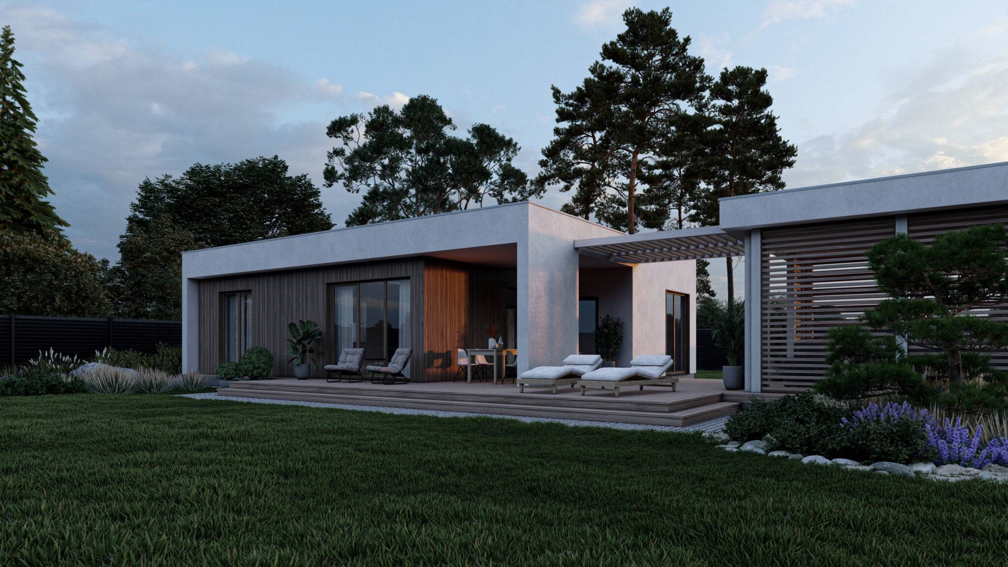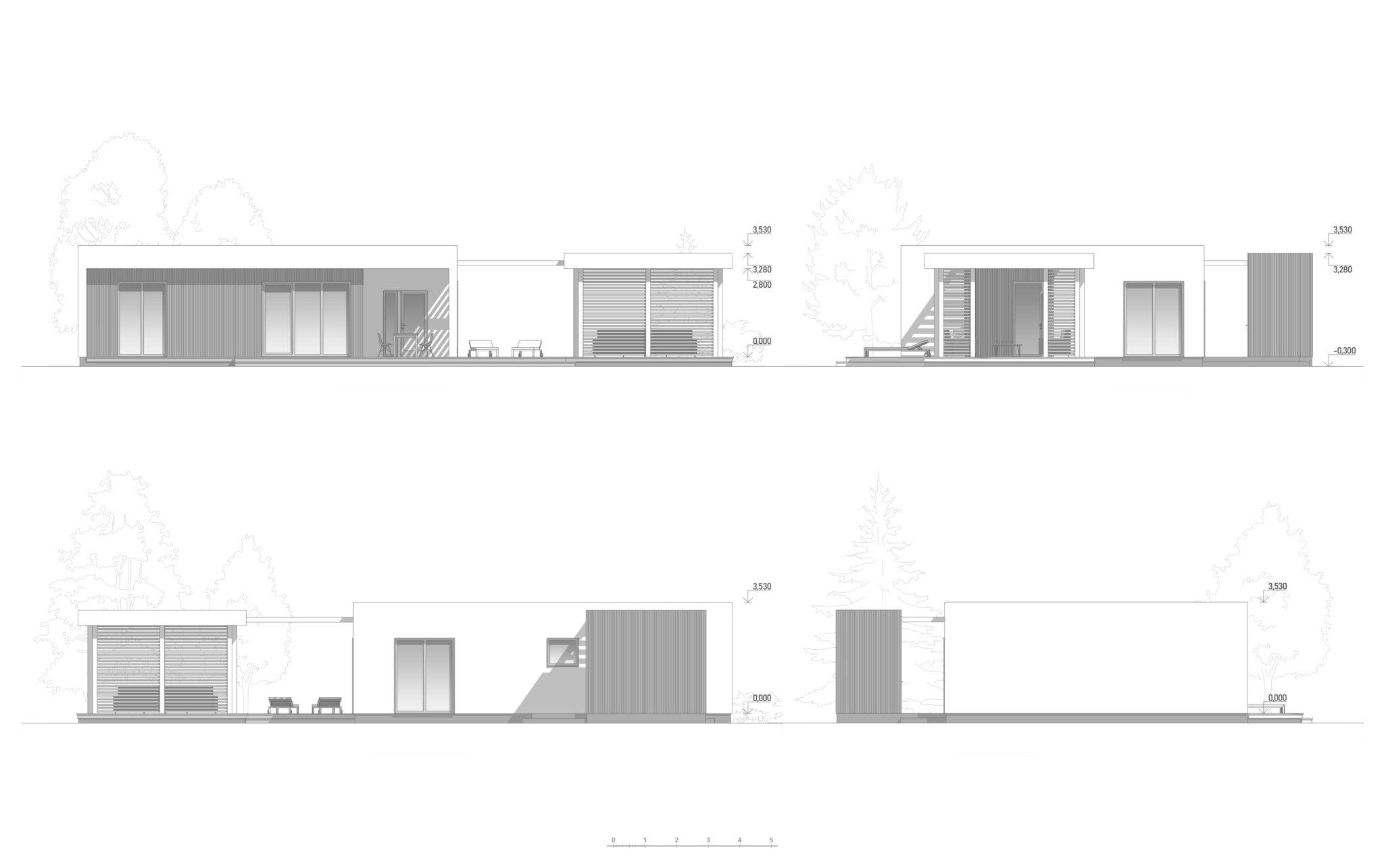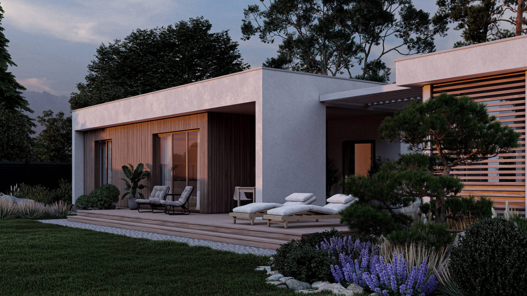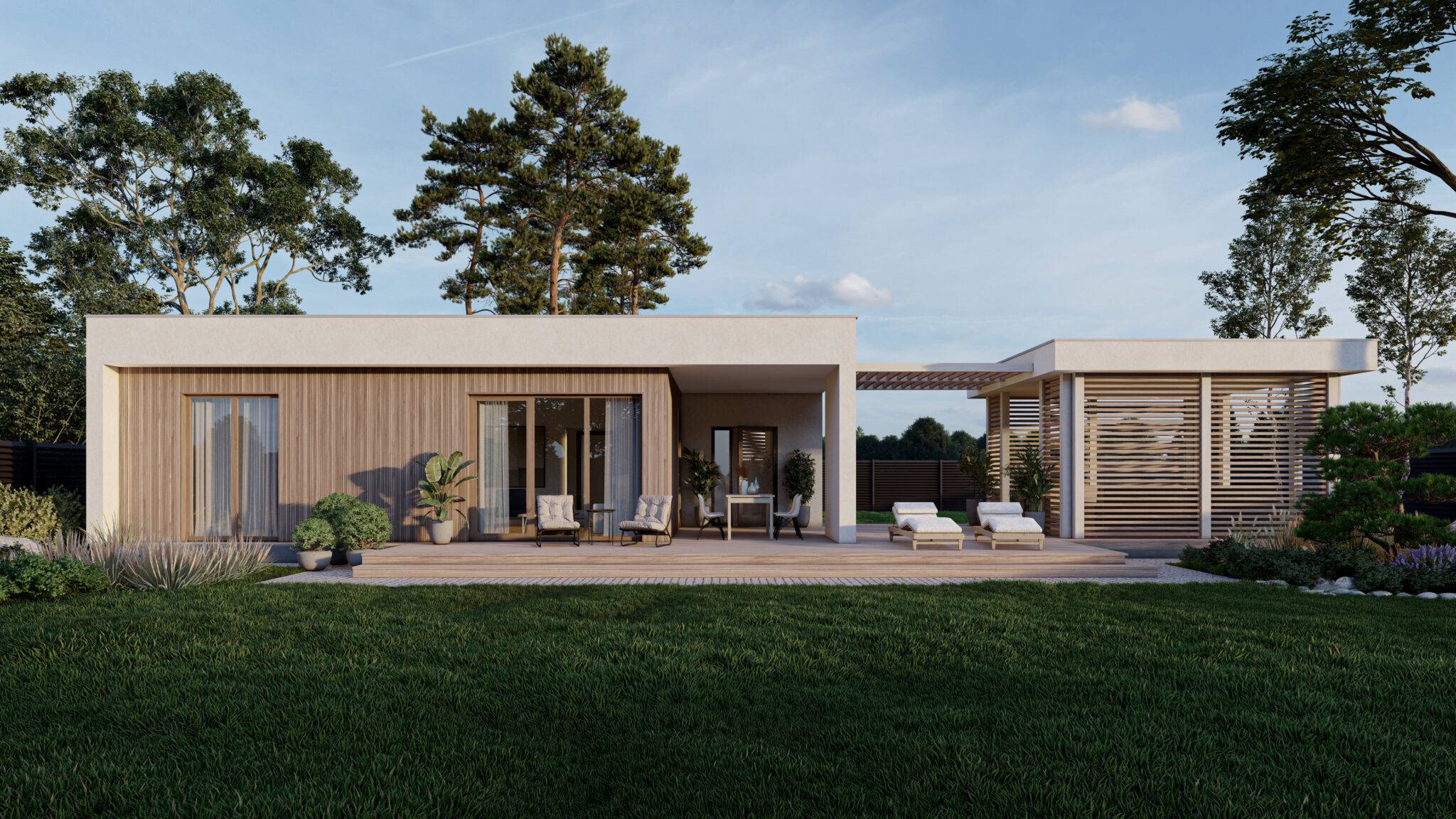 Сауна виконана в сучасному стилі з плоскою покрівлею. Вона відмінно підійде для комфортного і веселого проведення часу в колі друзів і сім’ї з користю для здоров’я. Проектом передбачена комфортне планування, яка включає парну, душову з санвузлом, простору кімнату відпочинку, технічне приміщення і невеликий тренажерний зал. У кімнаті відпочинку розміщена міні-кухня. Після парилки гості можуть зануритися в холодний басейн. Також в представленому проекті є зона відпочинку на свіжому повітрі – простора тераса і альтанка.