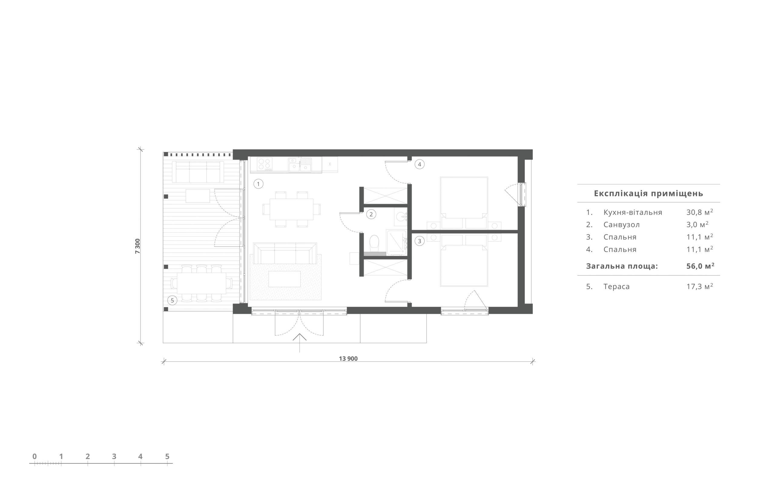 Компактный дом с двумя спальнями, одним санузлом и общей комнатой.